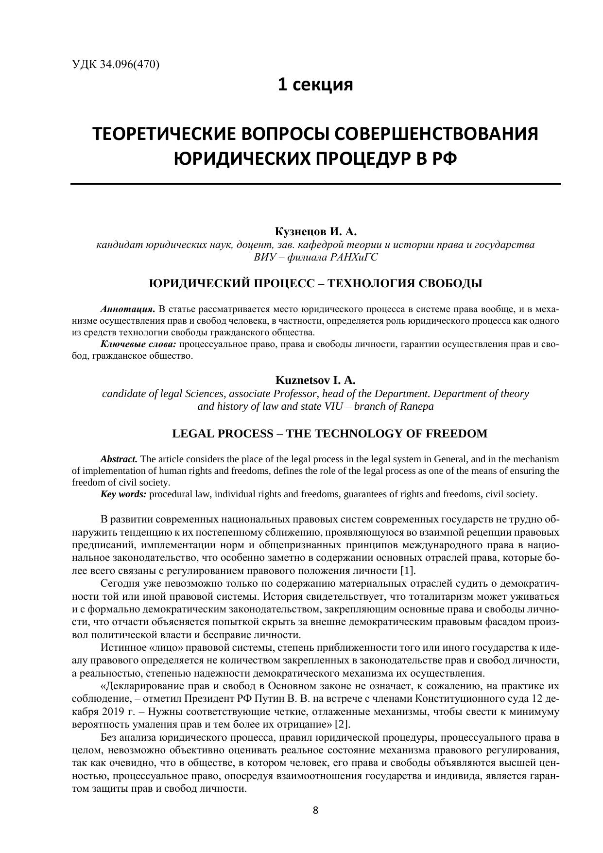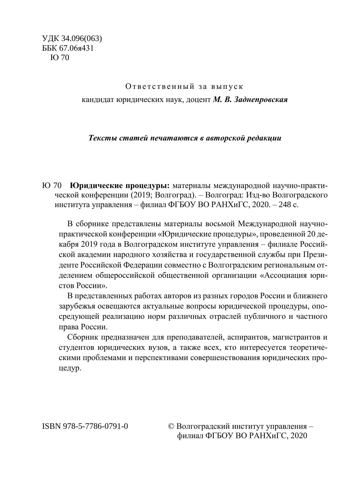 В сборнике представлены материалы восьмой Международной научно-практической конференции «Юридические процедуры», проведенной 20 де-кабря 2019 года в Волгоградском институте управления – филиале Россий-ской академии народного хозяйства и государственной службы при Прези-денте Российской Федерации совместно с Волгоградским региональным от-делением общероссийской общественной организации «Ассоциация юри-стов России». В представленных работах авторов из разных городов России и ближнего зарубежья освещаются актуальные вопросы юридической процедуры, опо-средующей реализацию норм различных отраслей публичного и частного права России. Сборник предназначен для преподавателей, аспирантов, магистрантов и студентов юридических вузов, а также всех, кто интересуется теоретиче-скими проблемами и перспективами совершенствования юридических про-цедур.