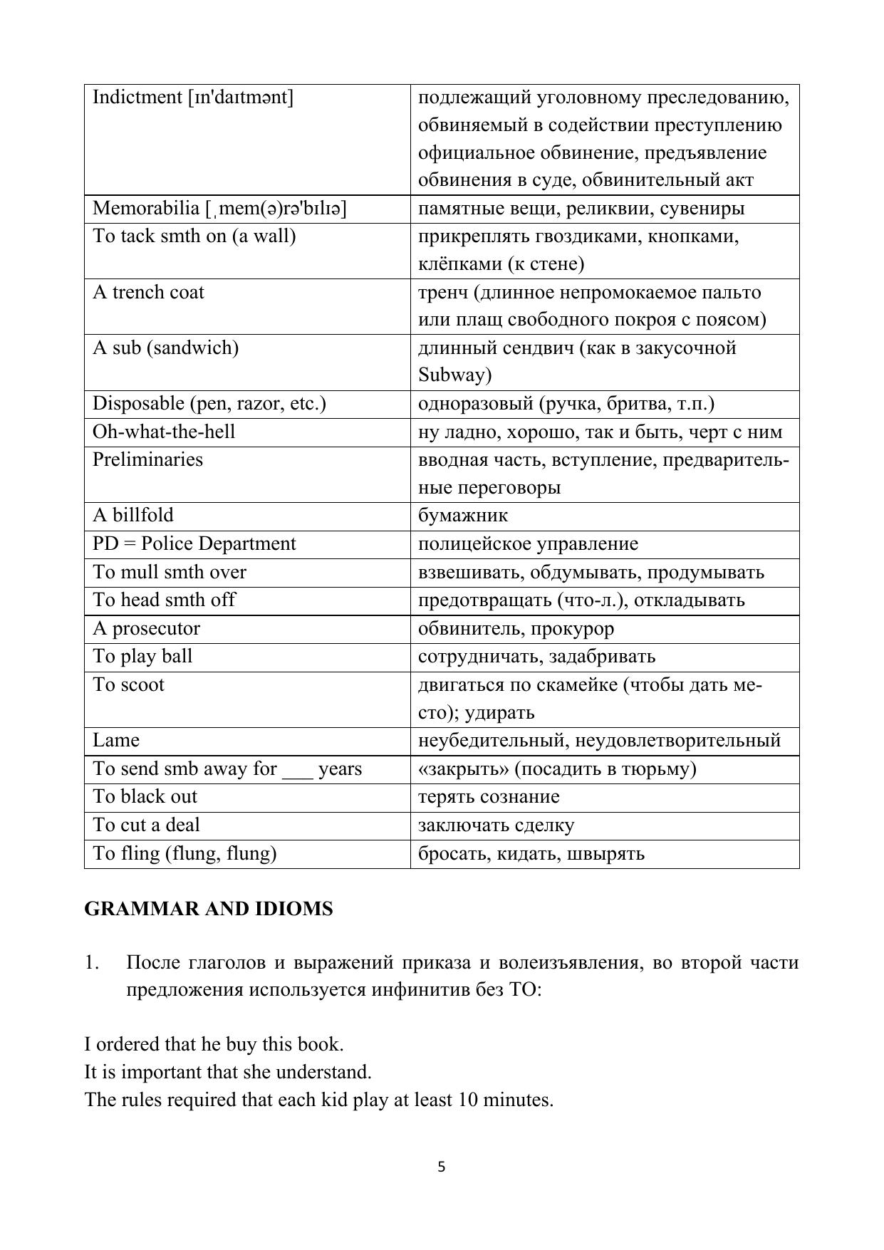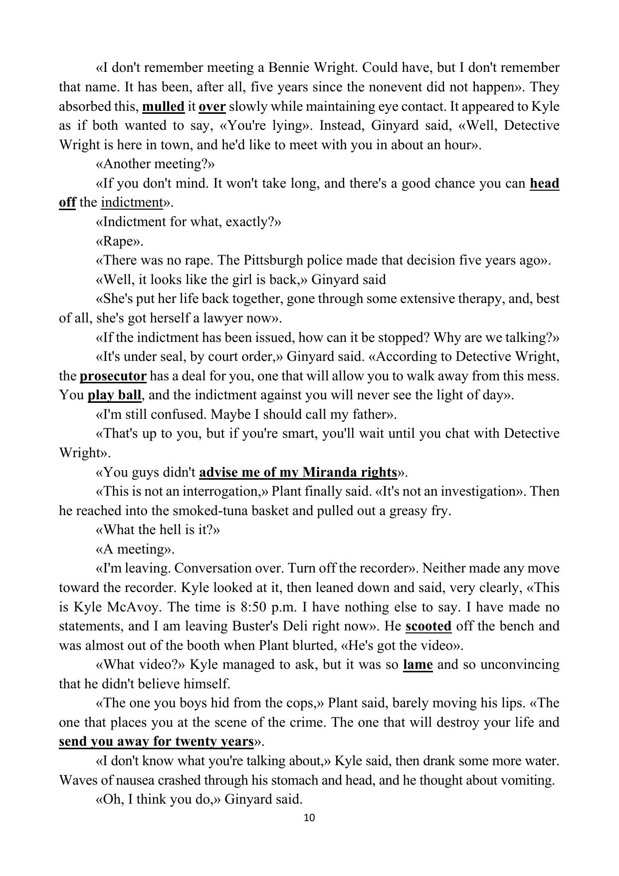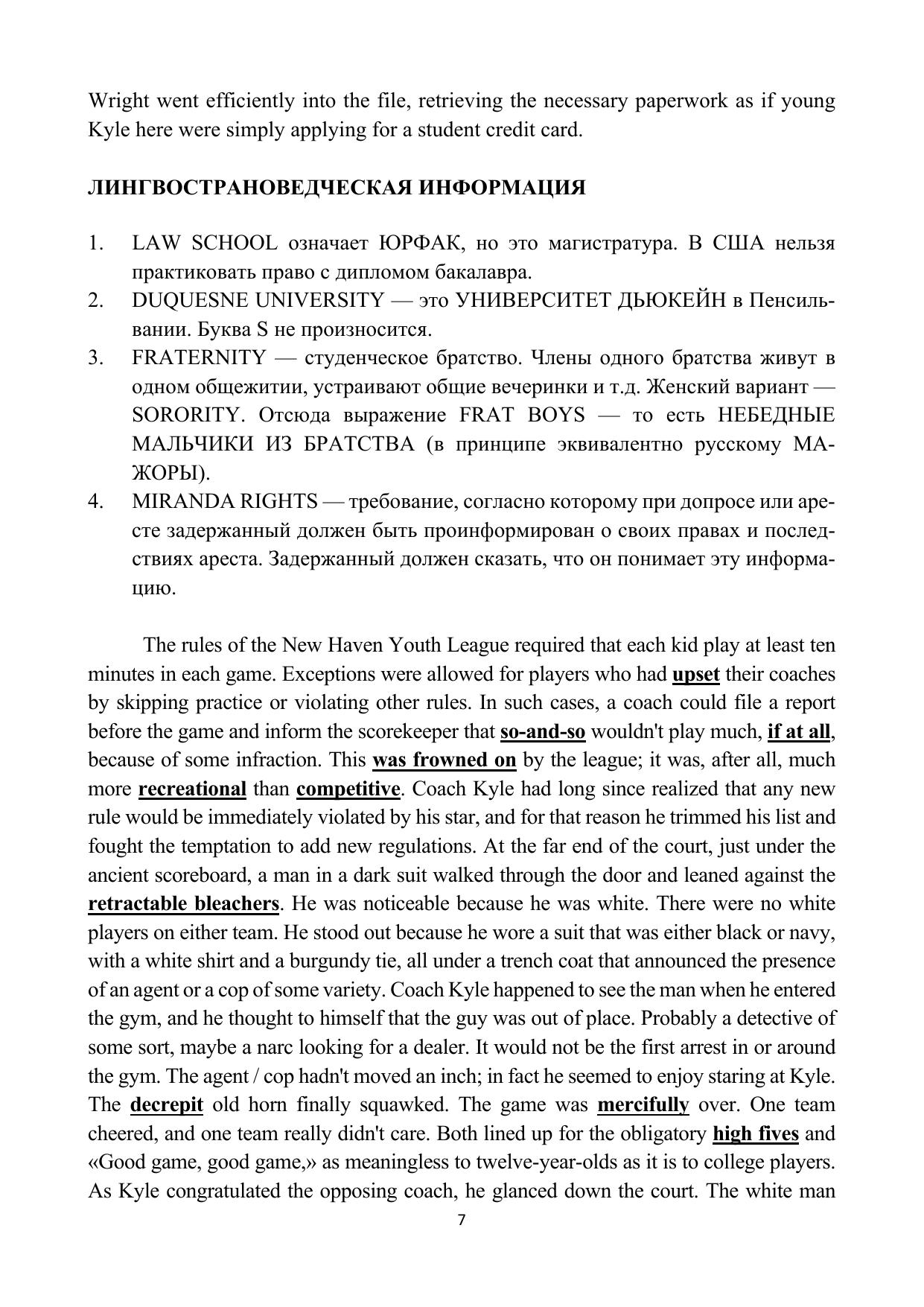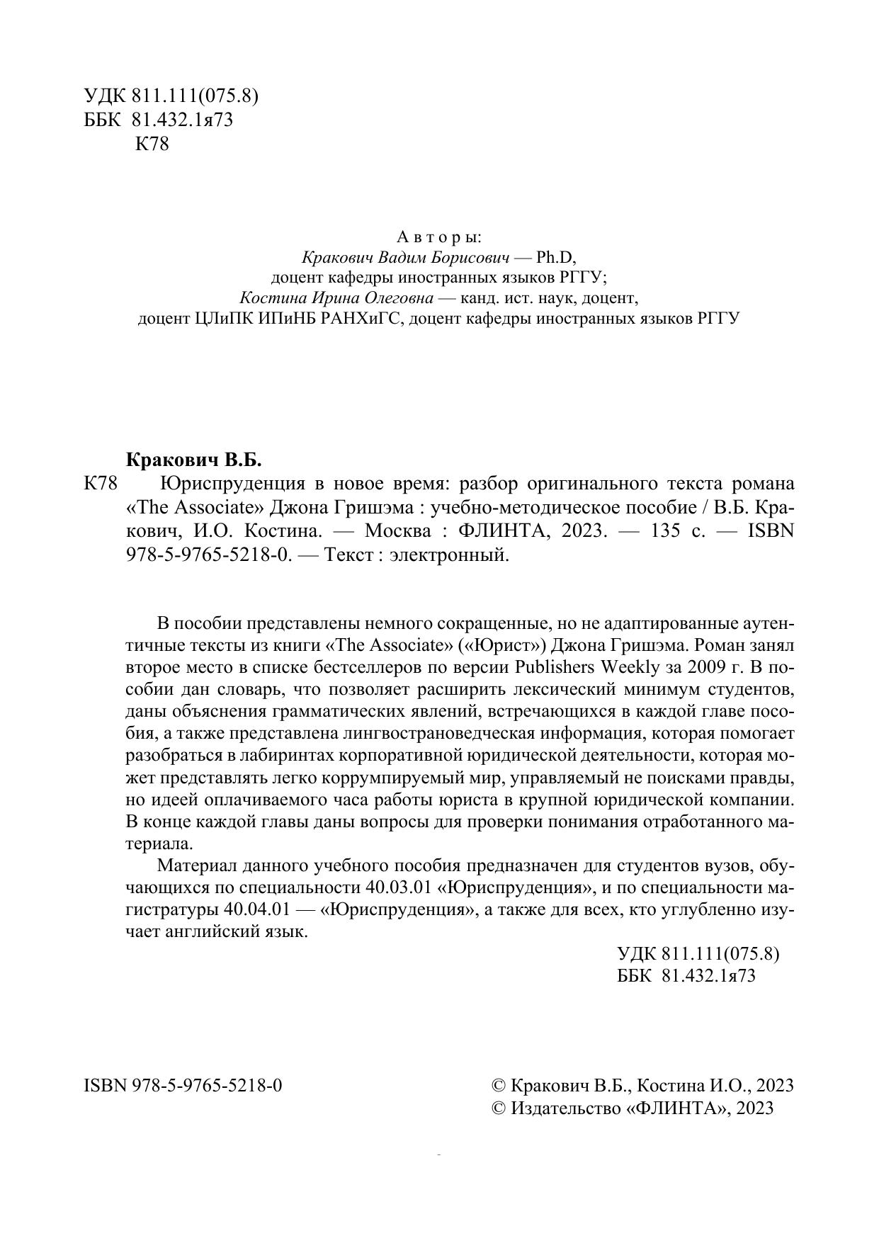 В пособии представлены немного сокращенные, но не адаптированные аутентичные тексты из книги «The Associate» («Юрист») Джона Гришэма. Роман занял второе место в списке бестселлеров по версии Publishers Weekly за 2009 г. В пособии дан словарь, что позволяет расширить лексический минимум студентов, даны объяснения грамматических явлений, встречающихся в каждой главе пособия, а также представлена лингвострановедческая информация, которая помогает разобраться в лабиринтах корпоративной юридической деятельности, которая может представлять легко коррумпируемый мир, управляемый не поисками правды, но идеей оплачиваемого часа работы юриста в крупной юридической компании. В конце каждой главы даны вопросы для проверки понимания отработанного материала.