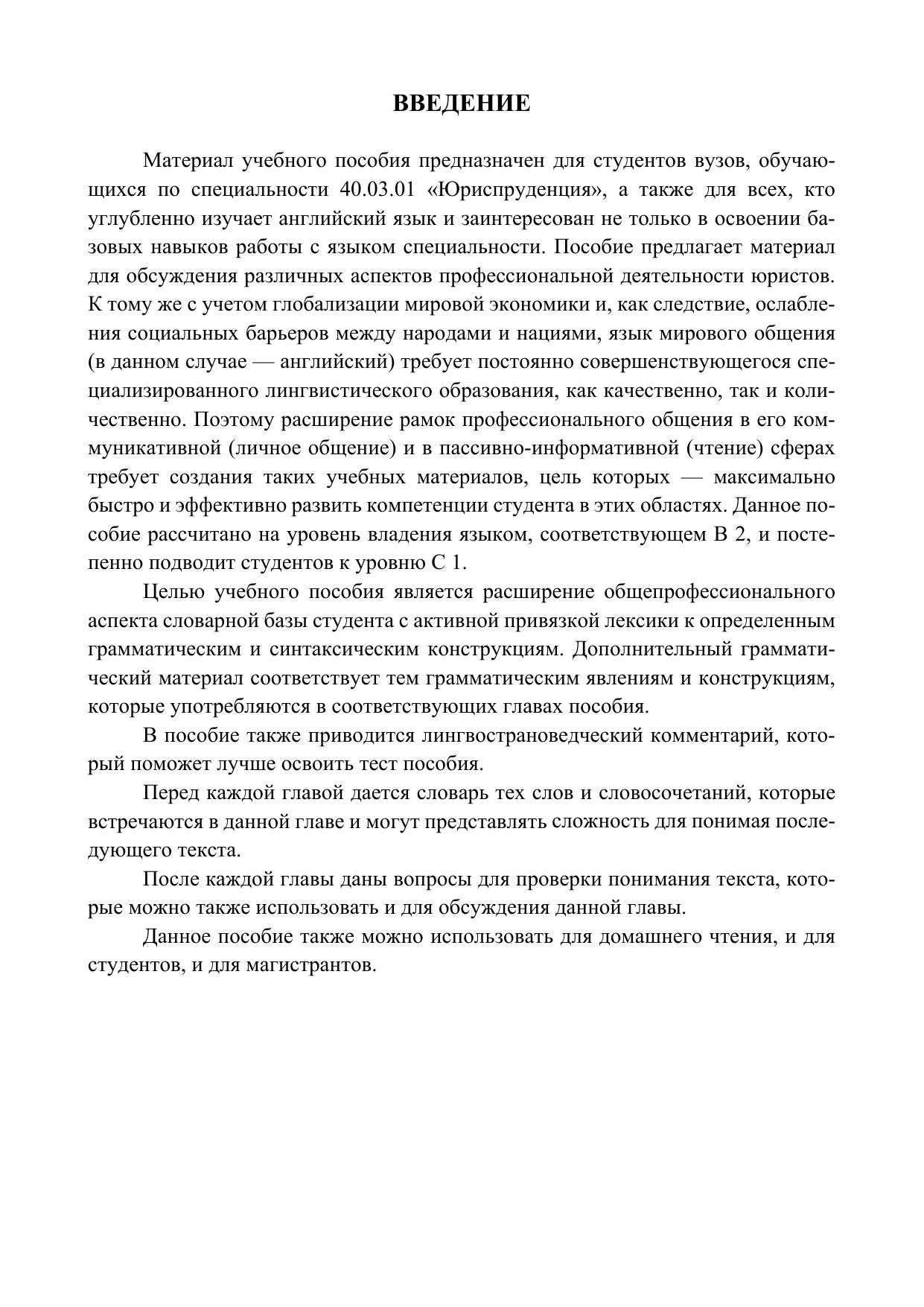 Материал данного учебного пособия предназначен для студентов вузов, обучающихся по специальности 40.03.01 «Юриспруденция», и по специальности магистратуры 40.04.01 — «Юриспруденция», а также для всех, кто углубленно изучает английский язык.