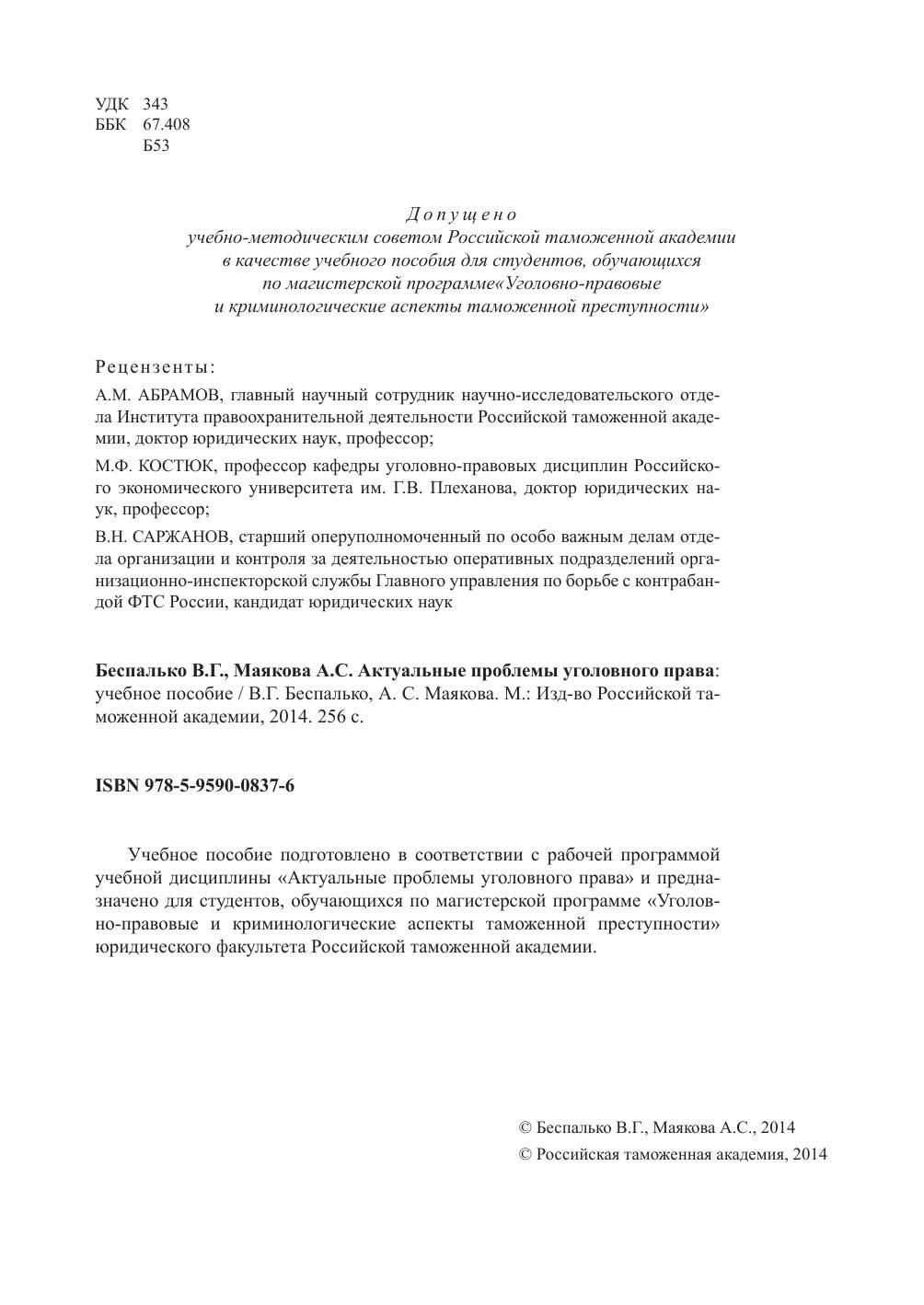 Гриф: Допущено учебно-методическим советом Российской таможенной академии в качестве учебного пособия для студентов, обучающихся по магистерской программе«Уголовно-правовые и криминологические аспекты таможенной преступности»