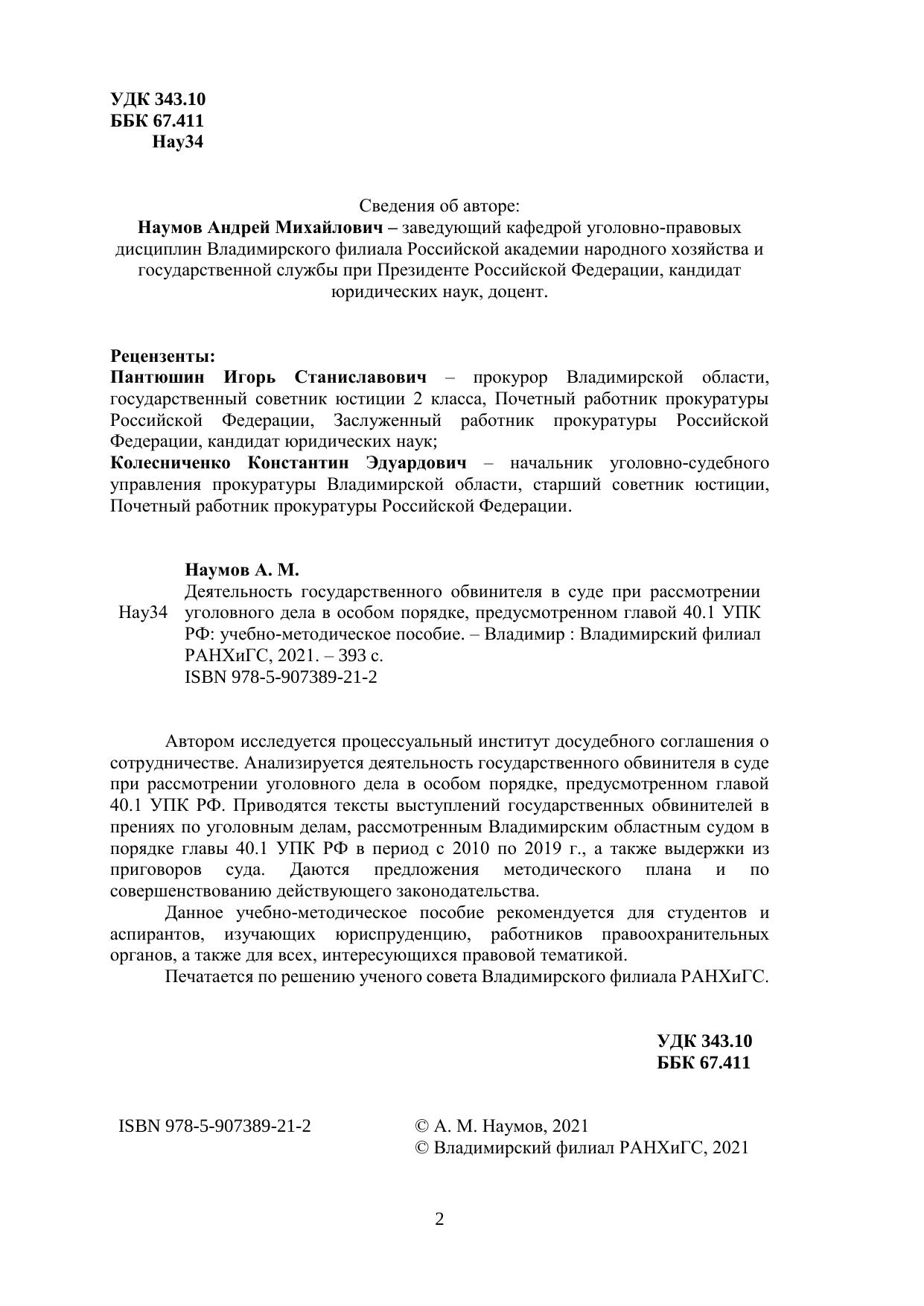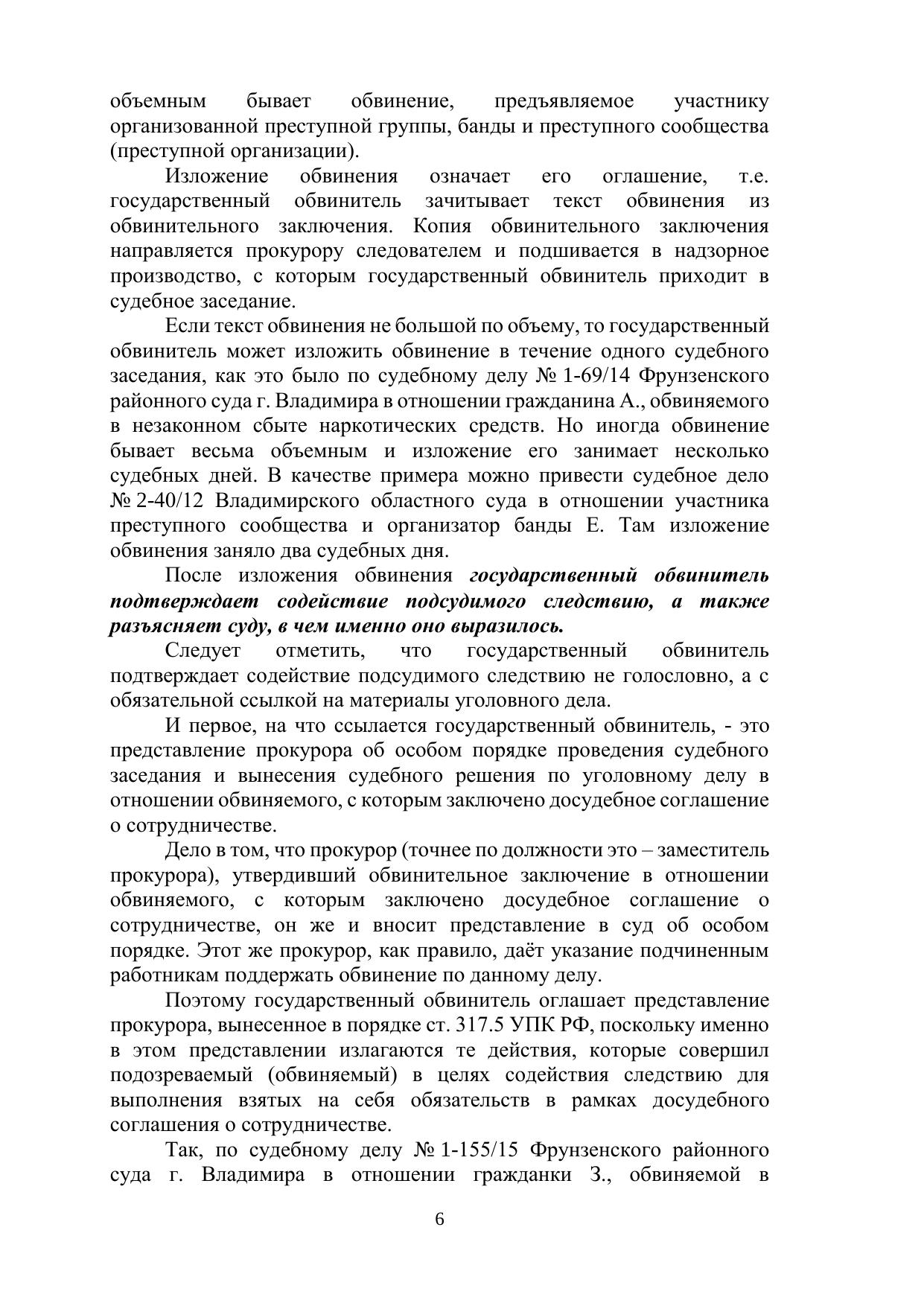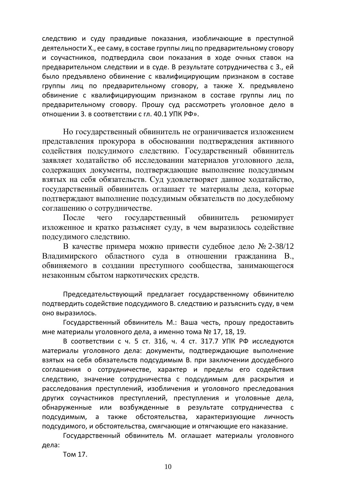 Автором исследуется процессуальный институт досудебного соглашения о сотрудничестве. Анализируется деятельность государственного обвинителя в суде при рассмотрении уголовного дела в особом порядке, предусмотренном главой 40.1 УПК РФ. Приводятся тексты выступлений государственных обвинителей в прениях по уголовным делам, рассмотренным Владимирским областным судом в порядке главы 40.1 УПК РФ в период с 2010 по 2019 г., а также выдержки из приговоров суда. Даются предложения методического плана и по совершенствованию действующего законодательства. Данное учебно-методическое пособие рекомендуется для студентов и аспирантов, изучающих юриспруденцию, работников правоохранительных органов, а также для всех, интересующихся правовой тематикой. Печатается по решению ученого совета Владимирского филиала РАНХиГС.