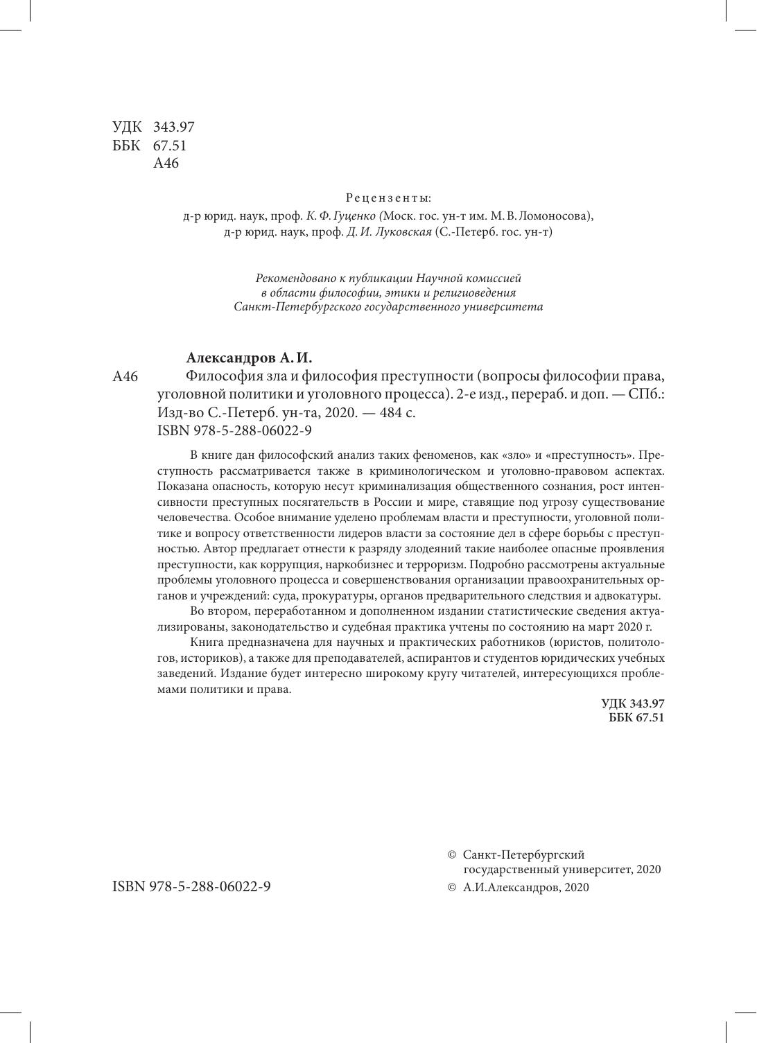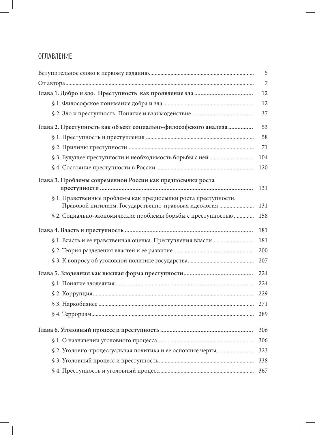В книге дан философский анализ таких феноменов, как «зло» и «преступность». Преступность рассматривается также в криминологическом и уголовно-правовом аспектах. Показана опасность, которую несут криминализация общественного сознания, рост интенсивности преступных посягательств в России и мире, ставящие под угрозу существование человечества. Особое внимание уделено проблемам власти и преступности, уголовной политике и вопросу ответственности лидеров власти за состояние дел в сфере борьбы с преступностью. Автор предлагает отнести к разряду злодеяний такие наиболее опасные проявления преступности, как коррупция, наркобизнес и терроризм. Подробно рассмотрены актуальные проблемы уголовного процесса и совершенствования организации правоохранительных органов и учреждений: суда, прокуратуры, органов предварительного следствия и адвокатуры. Во втором, переработанном и дополненном издании статистические сведения актуализированы, законодательство и судебная практика учтены по состоянию на март 2020 г. Книга предназначена для научных и практических работников (юристов, политологов, историков), а также для преподавателей, аспирантов и студентов юридических учебных заведений. Издание будет интересно широкому кругу читателей, интересующихся проблемами политики и права.