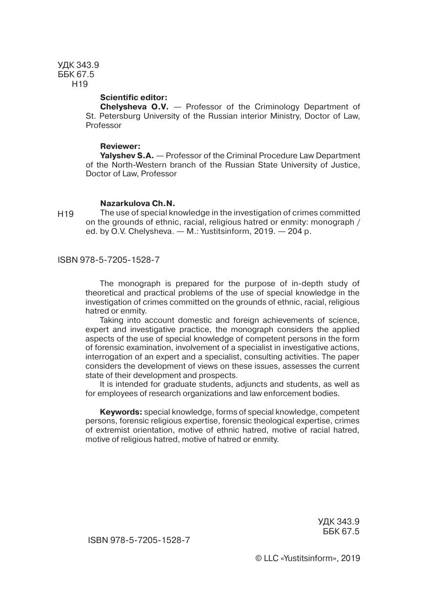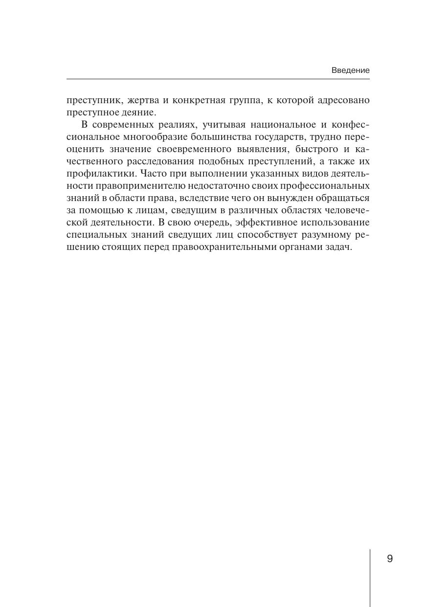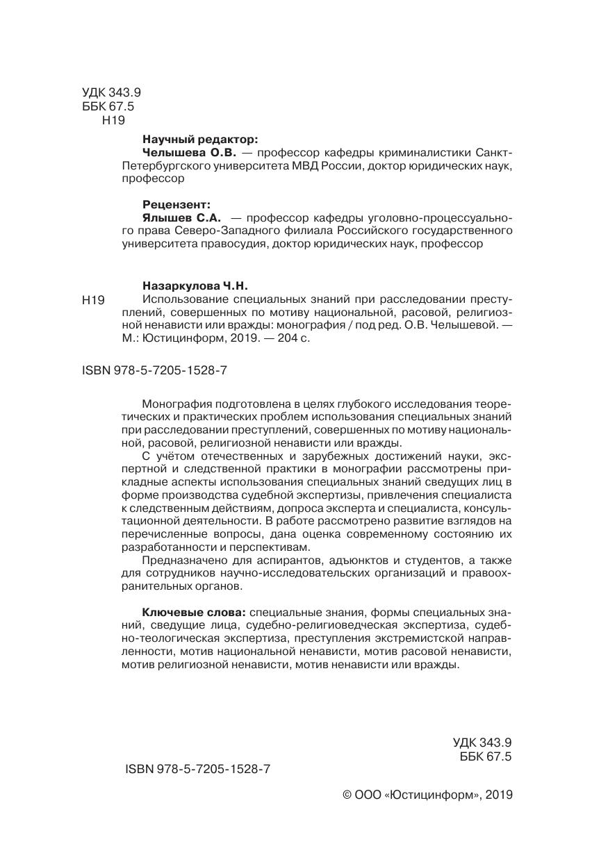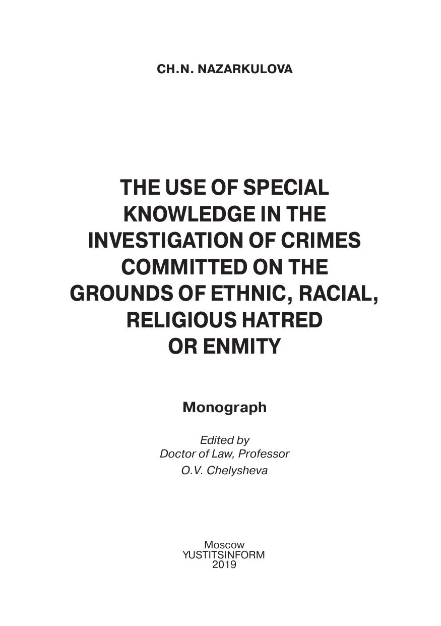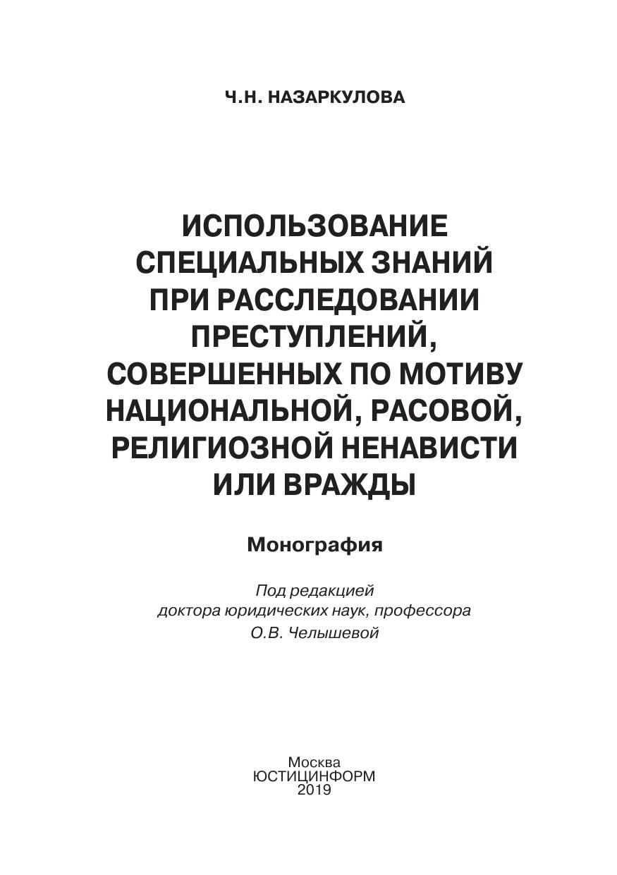 Монография подготовлена в целях глубокого исследования теоретических и практических проблем использования специальных знаний при расследовании преступлений, совершенных по мотиву национальной, расовой, религиозной ненависти или вражды. С учётом отечественных и зарубежных достижений науки, экспертной и следственной практики в монографии рассмотрены прикладные аспекты использования специальных знаний сведущих лиц в форме производства судебной экспертизы, привлечения специалиста к следственным действиям, допроса эксперта и специалиста, консультационной деятельности. В работе рассмотрено развитие взглядов на перечисленные вопросы, дана оценка современному состоянию их разработанности и перспективам. Предназначено для аспирантов, адъюнктов и студентов, а также для сотрудников научно-исследовательских организаций и правоохранительных органов.
