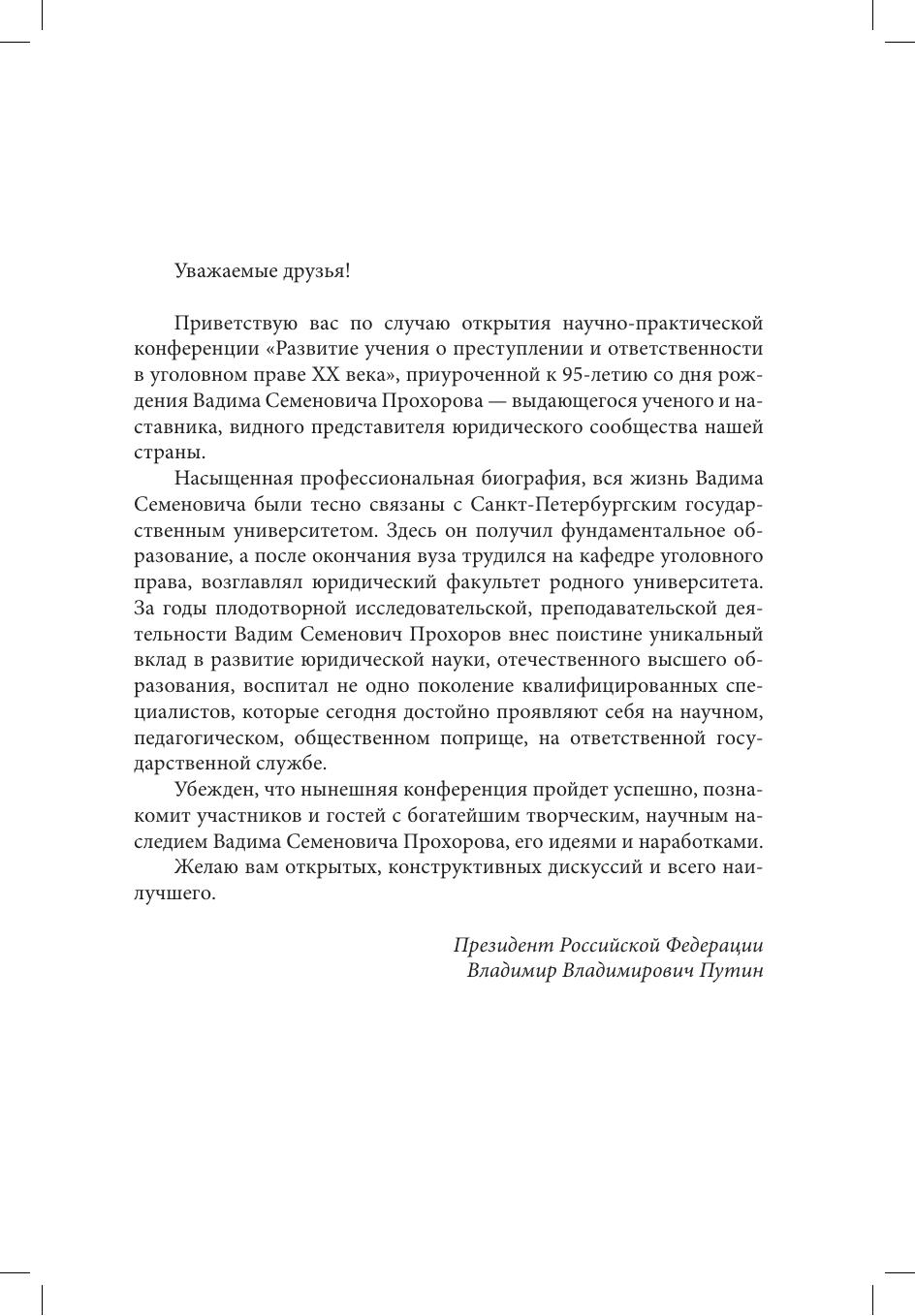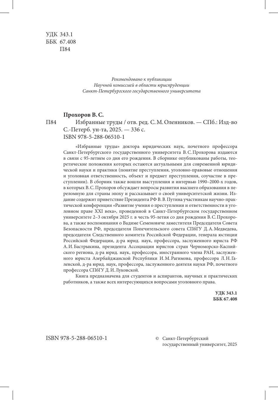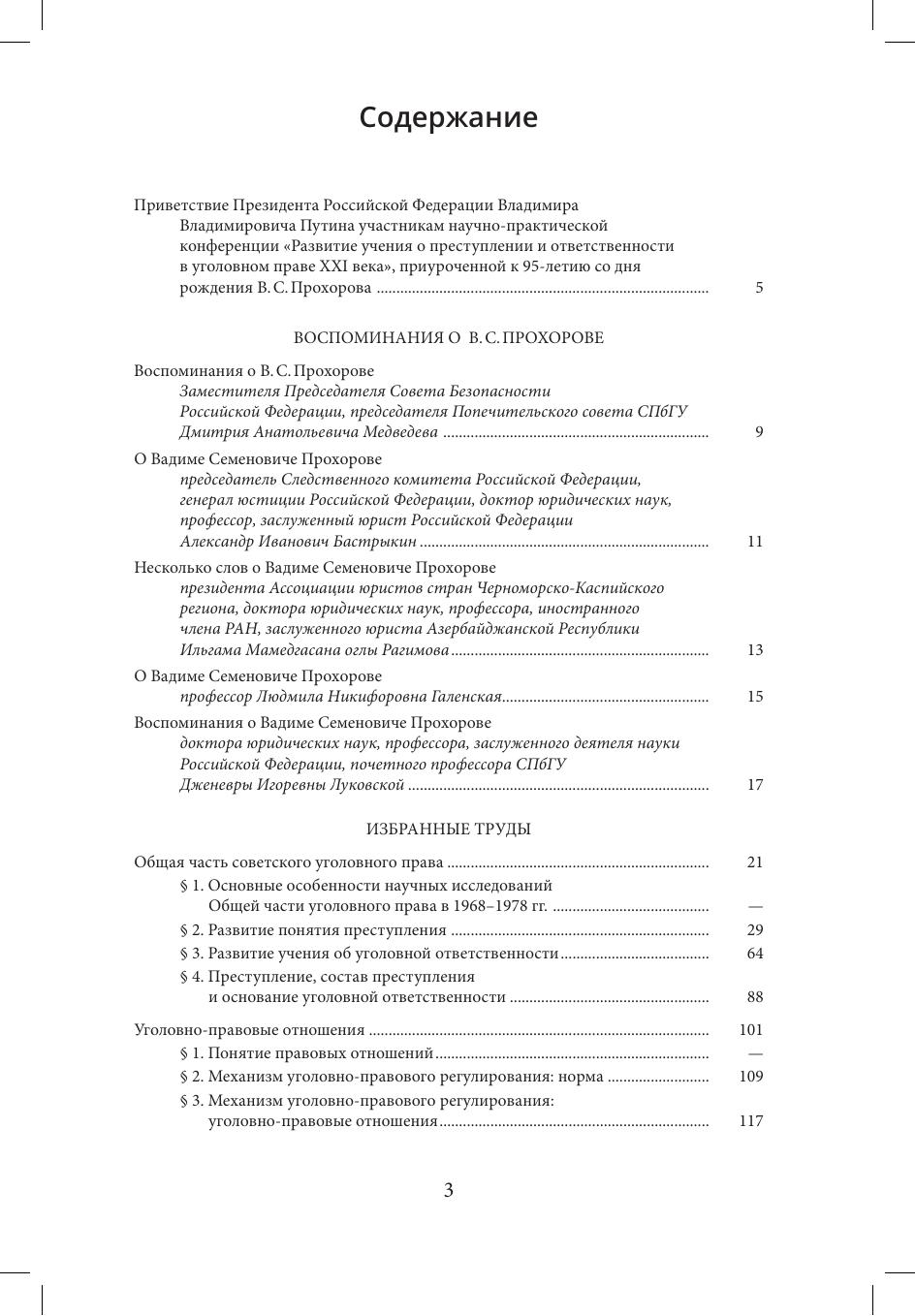 "Избранные труды" доктора юридических наук, почетного профессора Санкт-Петербургского государственного университета В.С. Прохорова издаются в связи с 95-летием со дня его рождения. В сборнике опубликованы работы, теоретические положения которых остаются актуальными для современной юридической науки и практики (понятие преступления, уголовно-правовые отношения и уголовная ответственность, объект и предмет преступления, соучастие в преступлении). В сборник также вошли выступления и интервью 1990-2000-х годов, в которых В.С. Прохоров обсуждает вопросы развития высшего образования в переломную для страны эпоху и рассказывает о своей университетской жизни. Издание содержит приветствие Президента РФ В.В. Путина участникам научно-практической конференции "Развитие учения о преступлении и ответственности в уголовном праве XXI века", проведенной в Санкт-Петербургском государственном университете 2-3 октября 2025 г. в честь 95-летия со дня рождения В.С. Прохорова, а также воспоминания о Вадиме Семеновиче заместителя Председателя Совета Безопасности РФ, председателя Попечительского совета СПбГУ Д.А. Медведева, председателя Следственного комитета Российской Федерации, генерала юстиции Российской Федерации, д-ра юрид. наук, профессора, заслуженного юриста РФ А.И. Бастрыкина, президента Ассоциации юристов стран Черноморско-Каспийского региона, д-ра юриди. наук, профессора, иностранного члена РАН, заслуженного юриста Азербайджанской Республики И.М. Рагимова, профессора Л.Н. Галенской, д-ра юрид. наук, профессора, заслуженного деятеля науки РФ, почетного профессора СПбГУ Д.И. Луковской. Книга предназначена для студентов и аспирантов, научных и практических работников, а также всех интересующихся вопросами уголовного права.