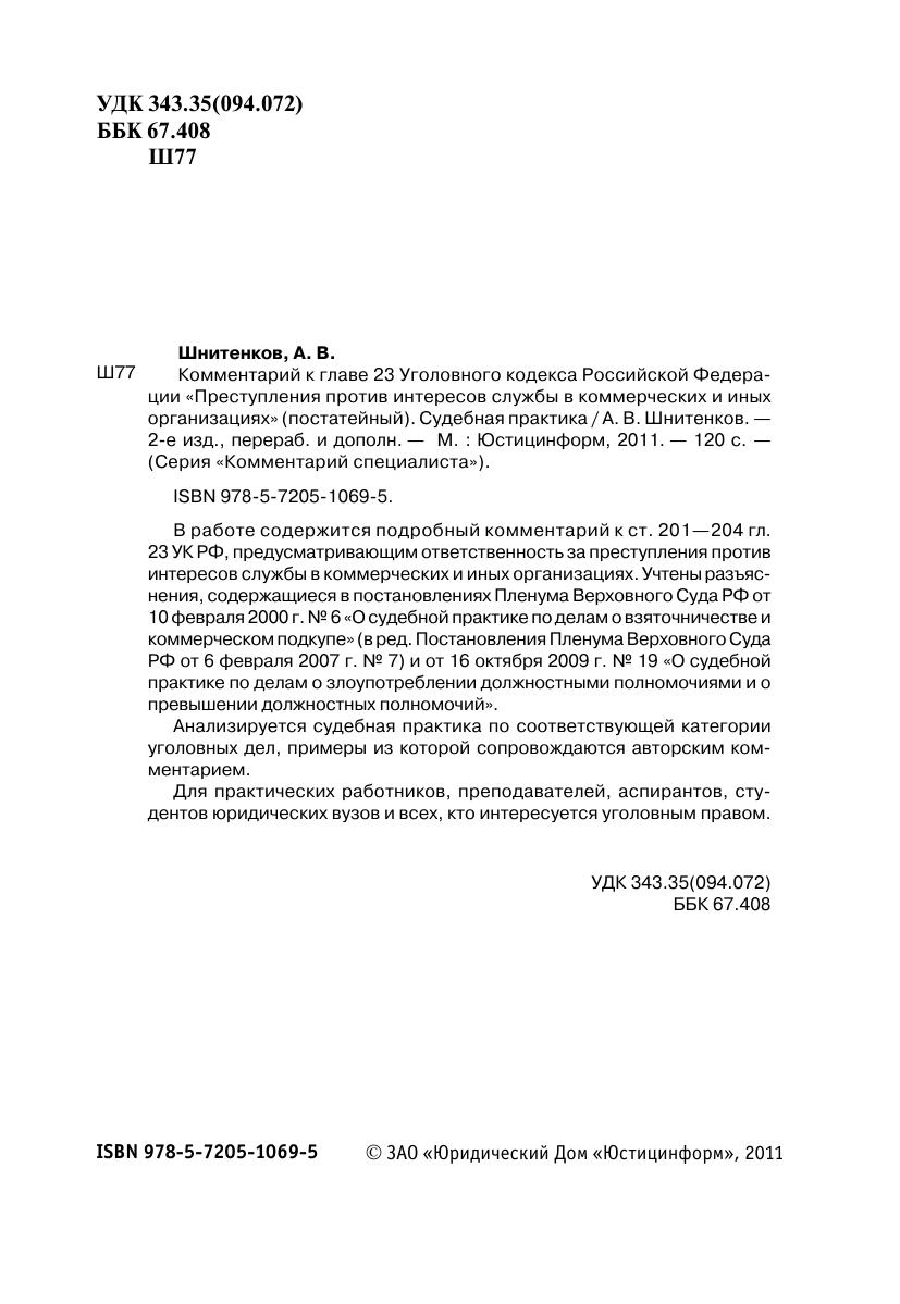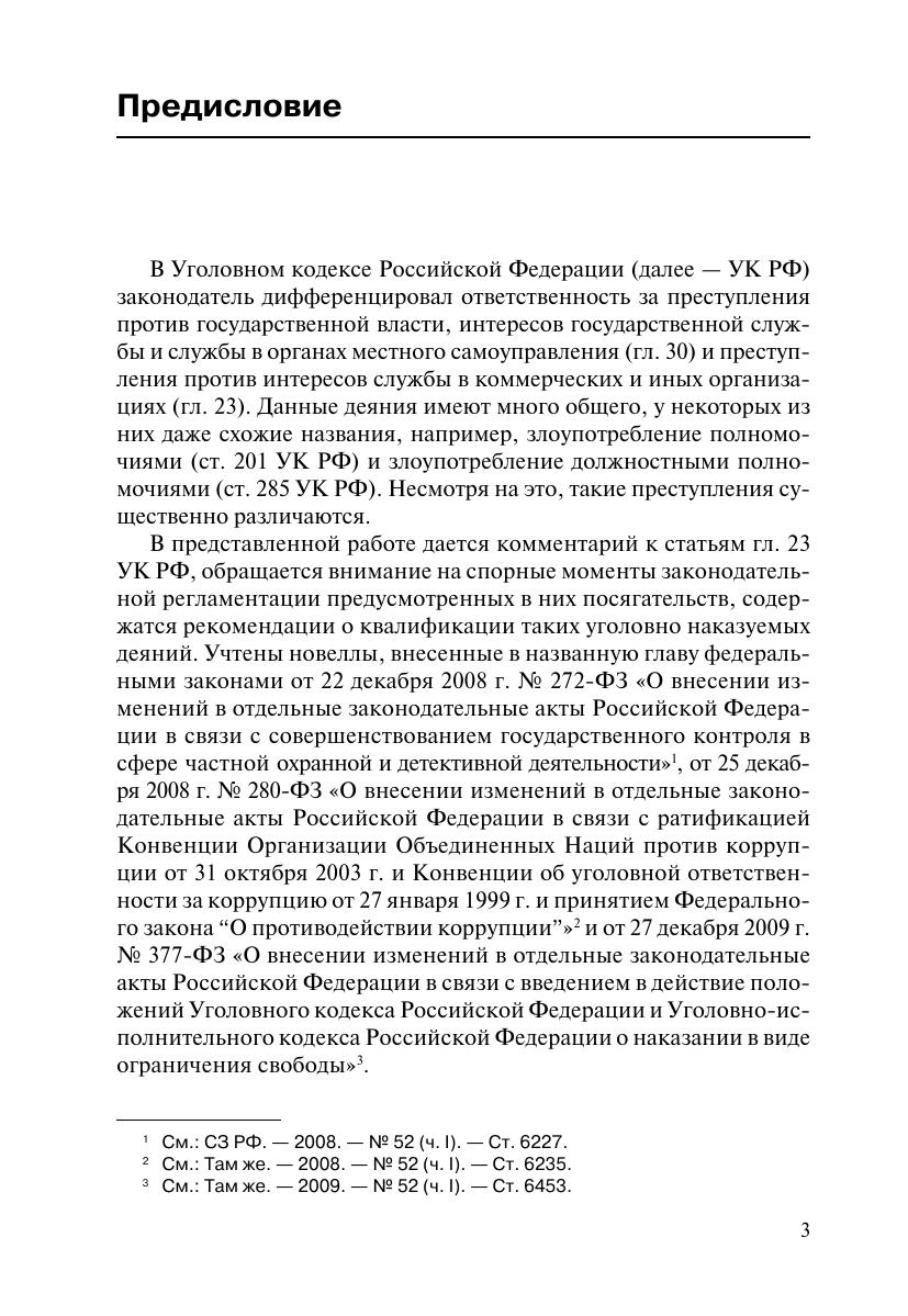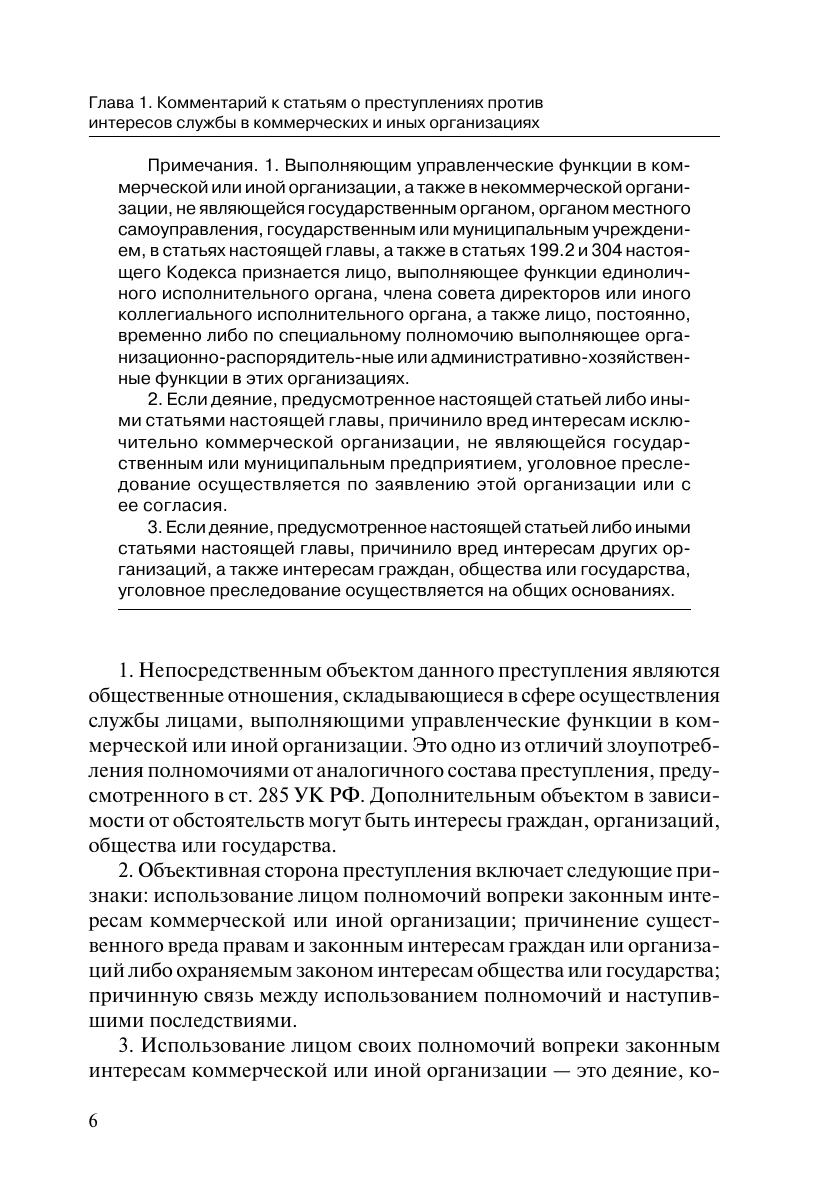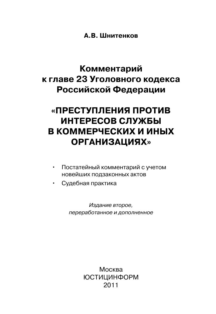 В работе содержится подробный комментарий к ст. 201—204 гл. 23 УК РФ, предусматривающим ответственность за преступления против интересов службы в коммерческих и иных организациях. Учтены разъяснения, содержащиеся в постановлениях Пленума Верховного Суда РФ от 10 февраля 2000 г. № 6 «О судебной практике по делам о взяточничестве и коммерческом подкупе» (в ред. Постановления Пленума Верховного Суда РФ от 6 февраля 2007 г. № 7) и от 16 октября 2009 г. № 19 «О судебной практике по делам о злоупотреблении должностными полномочиями и о превышении должностных полномочий». Анализируется судебная практика по соответствующей категории уголовных дел, примеры из которой сопровождаются авторским комментарием.Для практических работников, преподавателей, аспирантов, студентов юридических вузов и всех, кто интересуется уголовным правом