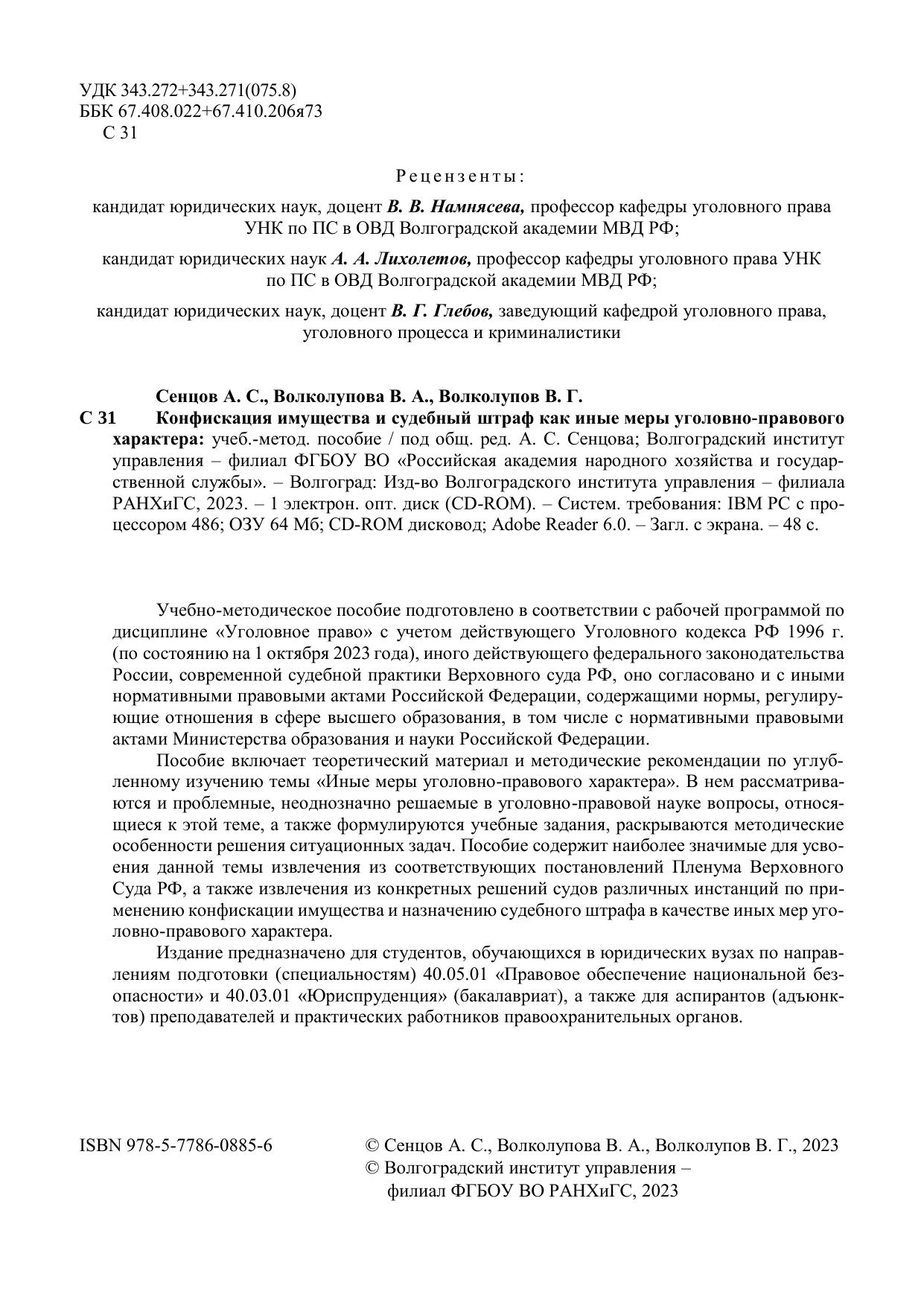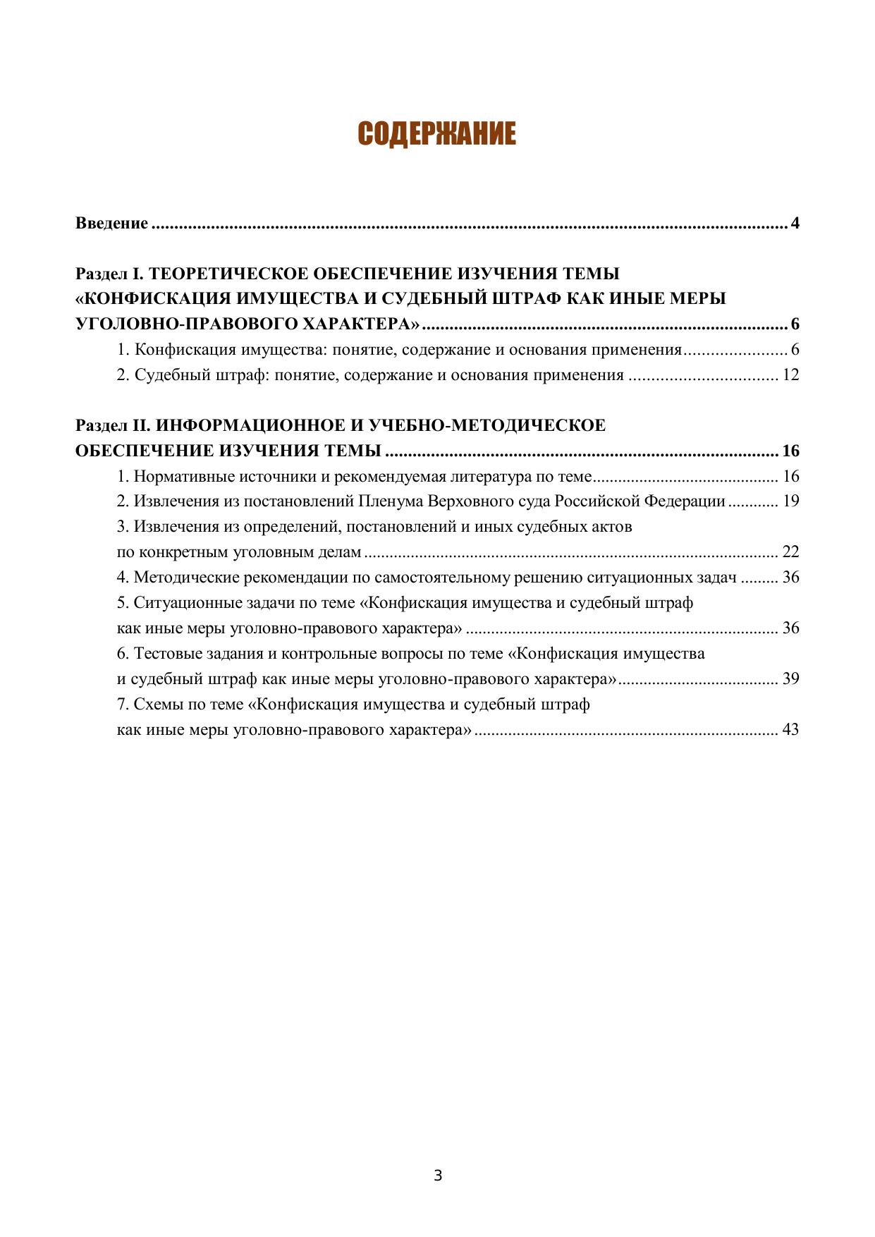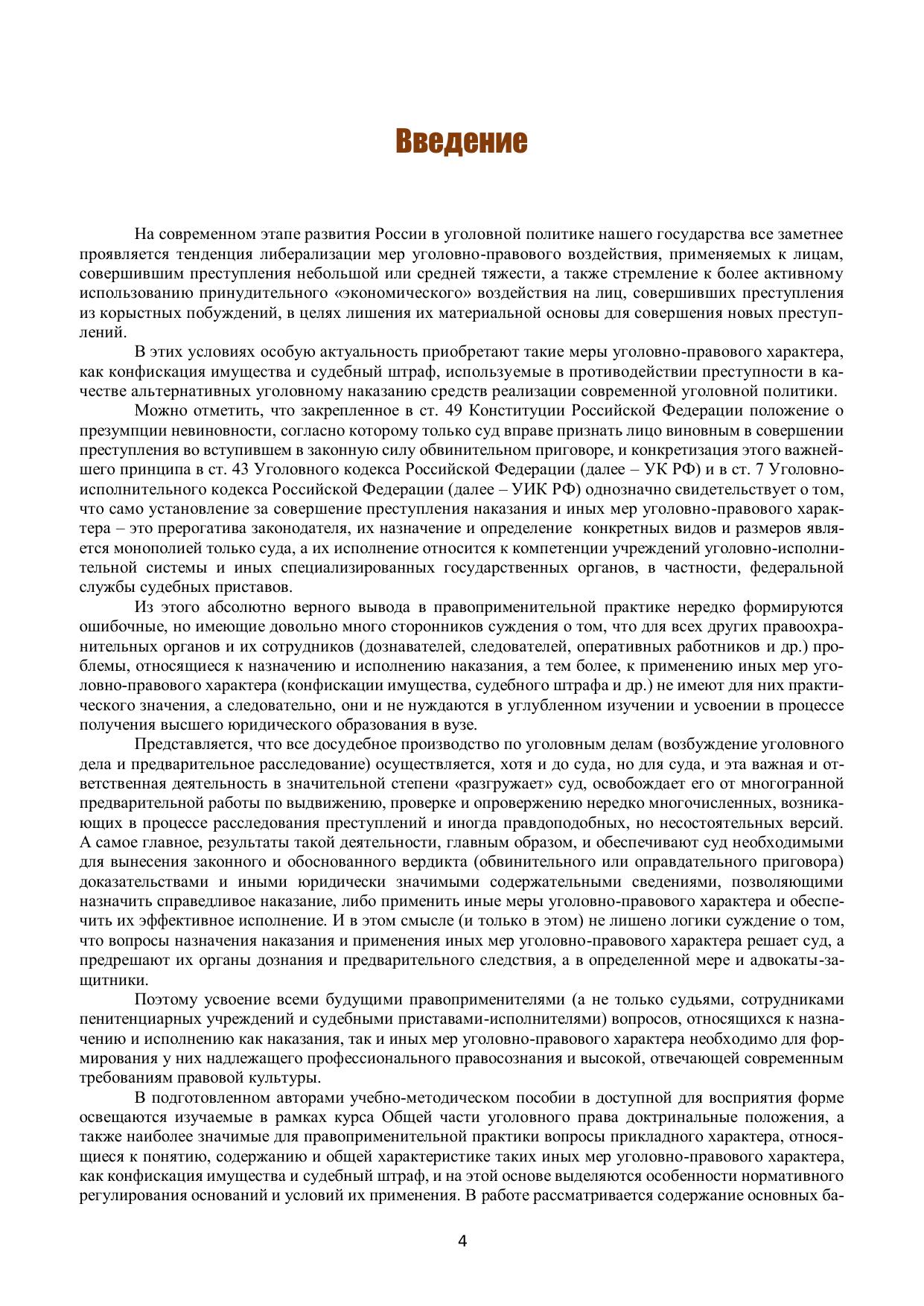 Учебно-методическое пособие подготовлено в соответствии с рабочей программой по дисциплине «Уголовное право» с учетом действующего Уголовного кодекса РФ 1996 г. (по состоянию на 1 октября 2023 года), иного действующего федерального законодательства России, современной судебной практики Верховного суда РФ, оно согласовано и с иными нормативными правовыми актами Российской Федерации, содержащими нормы, регулирующие отношения в сфере высшего образования, в том числе с нормативными правовыми актами Министерства образования и науки Российской Федерации. Пособие включает теоретический материал и методические рекомендации по углубленному изучению темы «Иные меры уголовно-правового характера». В нем рассматриваются и проблемные, неоднозначно решаемые в уголовно-правовой науке вопросы, относящиеся к этой теме, а также формулируются учебные задания, раскрываются методические особенности решения ситуационных задач. Пособие содержит наиболее значимые для усвоения данной темы извлечения из соответствующих постановлений Пленума Верховного Суда РФ, а также извлечения из конкретных решений судов различных инстанций по применению конфискации имущества и назначению судебного штрафа в качестве иных мер уголовно-правового характера. Издание предназначено для студентов, обучающихся в юридических вузах по направлениям подготовки (специальностям) 40.05.01 «Правовое обеспечение национальной безопасности» и 40.03.01 «Юриспруденция» (бакалавриат), а также для аспирантов (адъюнктов) преподавателей и практических работников правоохранительных органов.