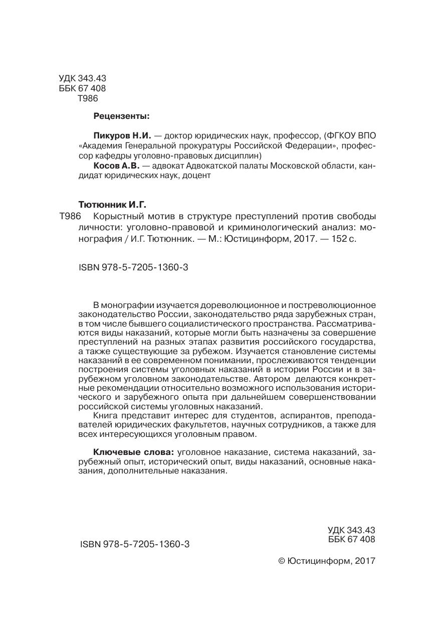 В монографии изучается дореволюционное и постреволюционное законодательство России, законодательство ряда зарубежных стран, в том числе бывшего социалистического пространства. Рассматриваются виды наказаний, которые могли быть назначены за совершение преступлений на разных этапах развития российского государства, а также существующие за рубежом. Изучается становление системы наказаний в ее современном понимании, прослеживаются тенденции построения системы уголовных наказаний в истории России и в зарубежном уголовном законодательстве. Автором делаются конкретные рекомендации относительно возможного использования исторического и зарубежного опыта при дальнейшем совершенствовании российской системы уголовных наказаний.