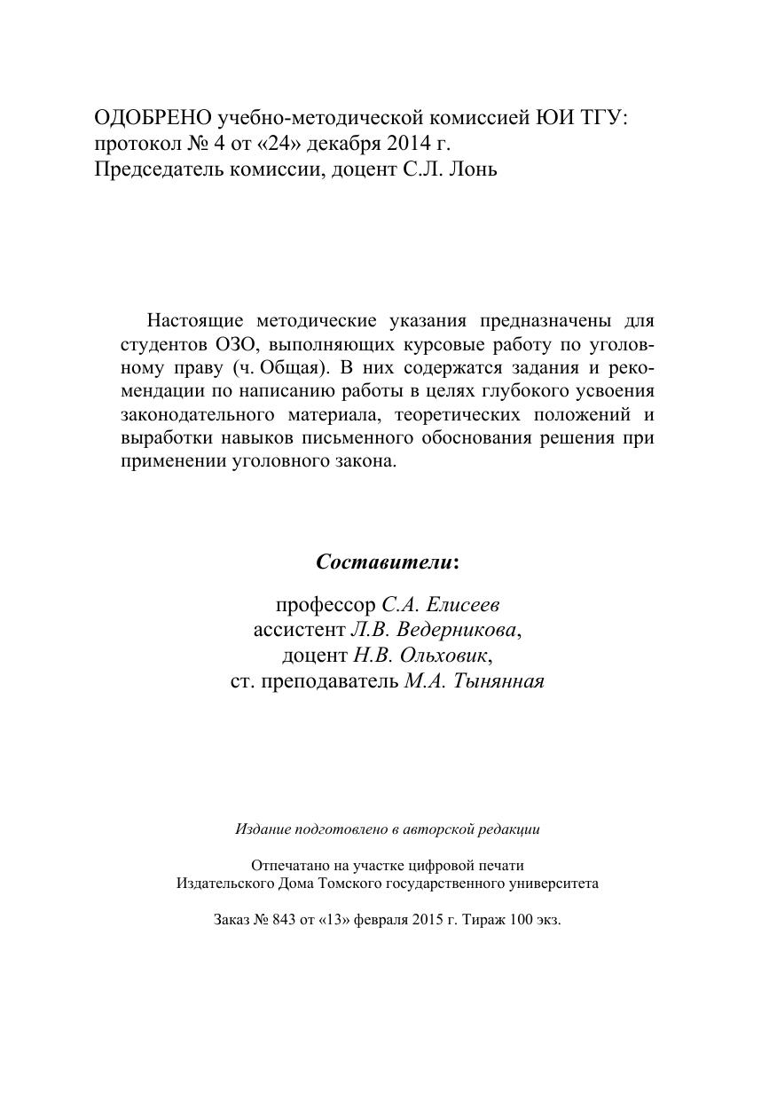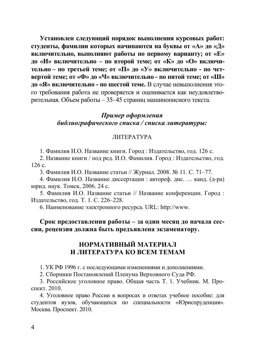 Настоящие методические указания предназначены для студентов ОЗО, выполняющих курсовые работу по уголовному праву (ч. Общая). В них содержатся задания и рекомендации по написанию работы в целях глубокого усвоения законодательного материала, теоретических положений и выработки навыков письменного обоснования решения при применении уголовного закона