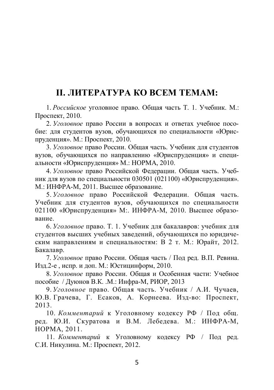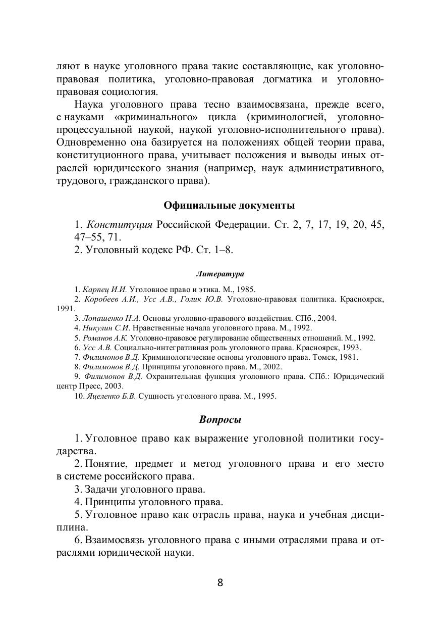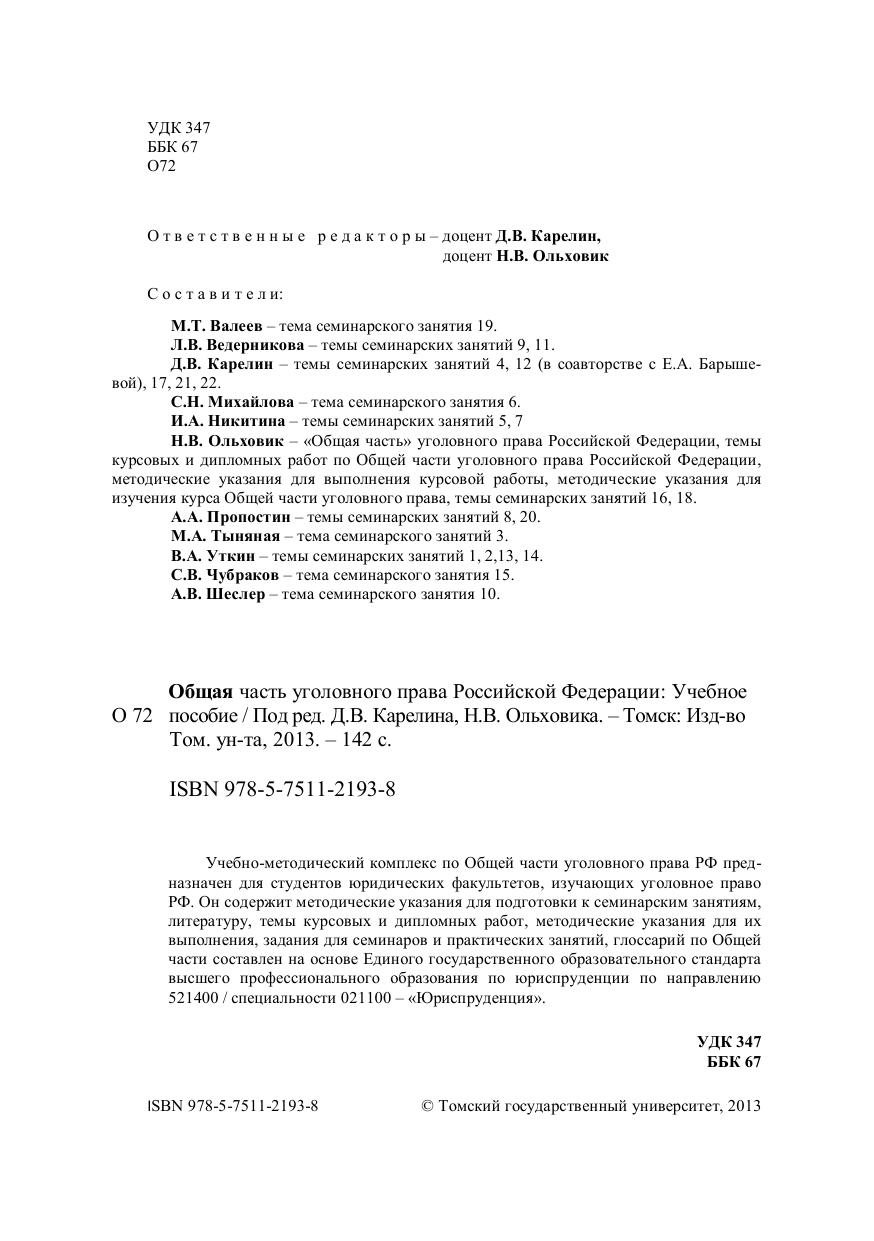 Учебно-методический комплекс по Общей части уголовного права РФ предназначен для студентов юридических факультетов, изучающих уголовное право РФ. Он содержит методические указания для подготовки к семинарским занятиям, литературу, темы курсовых и дипломных работ, методические указания для их выполнения, задания для семинаров и практических занятий, глоссарий по Общей части составлен на основе Единого государственного образовательного стандарта высшего профессионального образования по юриспруденции по направлению 521400 / специальности 021100 – «Юриспруденция».