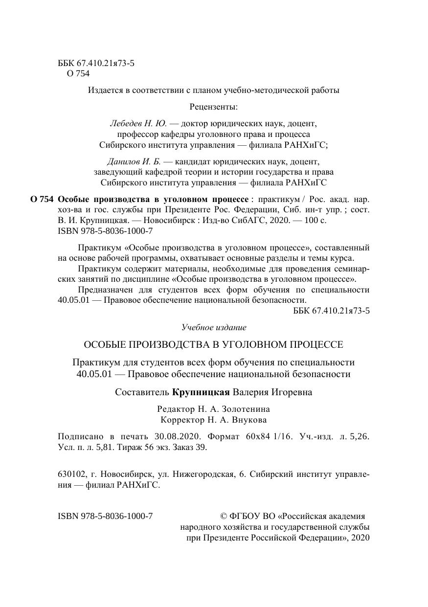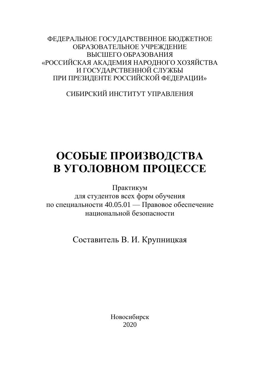 Практикум «Особые производства в уголовном процессе», составленный на основе рабочей программы, охватывает основные разделы и темы курса. Практикум содержит материалы, необходимые для проведения семинар-ских занятий по дисциплине «Особые производства в уголовном процессе». Предназначен для студентов всех форм обучения по специальности 40.05.01 — Правовое обеспечение национальной безопасности.