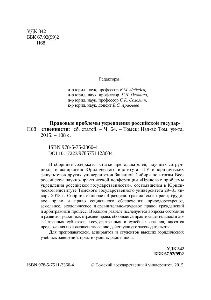 В сборнике содержатся статьи преподавателей, научных сотрудников и аспирантов Юридического института ТГУ и юридических факультетов других университетов Западной Сибири по итогам Всероссийской научно-практической конференции «Правовые проблемы укрепления российской государственности», состоявшейся в Юридическом институте Томского государственного университета 29-31 января 2015 г. Сборник включает 4 раздела: гражданское право, трудовое право и право социального обеспечения, природоресурсное, земельное, экологическое и сравнительно-трудовое право, гражданский и арбитражный процесс. В каждом разделе исследуются вопросы состояния и развития указанных отраслей права, обобщается практика деятельности хозяйственных субъектов, государственных и судебных органов, вносятся предложения по совершенствованию действующего законодательства. Для преподавателей, аспирантов и студентов высших юридических учебных заведений, практикующих работников.