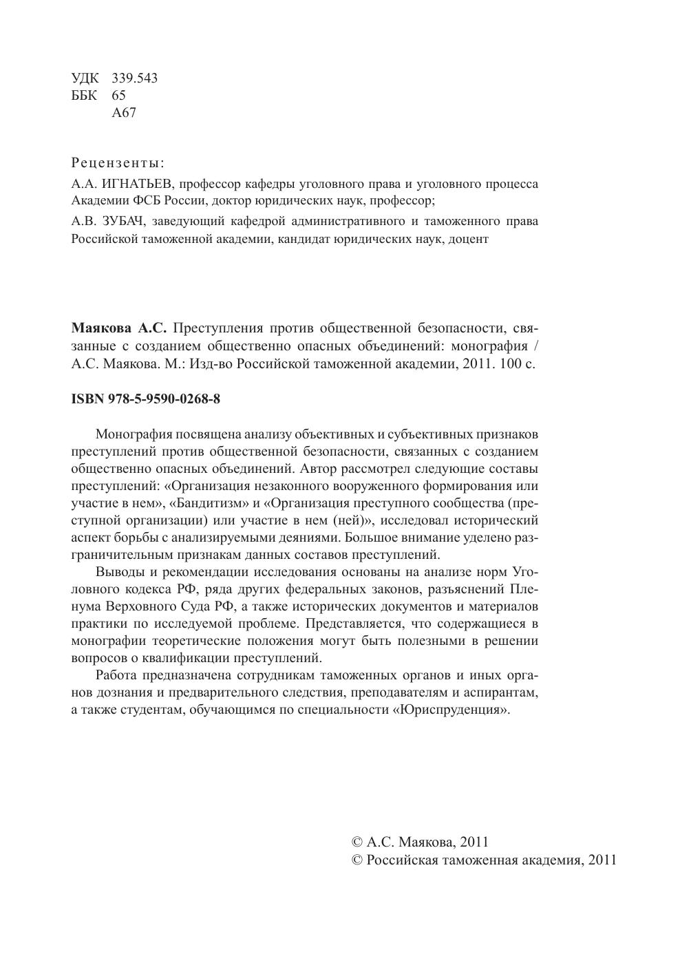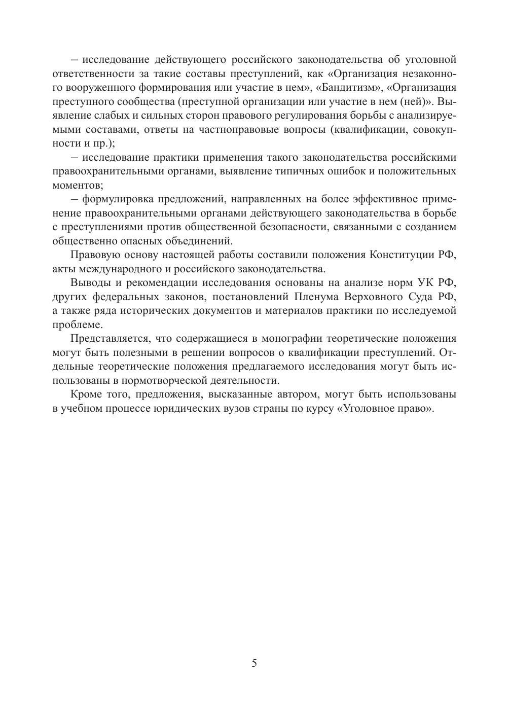 Монография посвящена анализу объективных и субъективных признаков преступлений против общественной безопасности, связанных с созданием общественно опасных объединений. Автор рассмотрел следующие составы преступлений: «Организация незаконного вооруженного формирования или участие в нем», «Бандитизм» и «Организация преступного сообщества (преступной организации) или участие в нем (ней)», исследовал исторический аспект борьбы с анализируемыми деяниями. Большое внимание уделено разграничительным признакам данных составов преступлений. выводы и рекомендации исследования основаны на анализе норм Уголовного кодекса РФ, ряда других федеральных законов, разъяснений Пленума верховного Суда РФ, а также исторических документов и материалов практики по исследуемой проблеме. Представляется, что содержащиеся в монографии теоретические положения могут быть полезными в решении вопросов о квалификации преступлений. Работа предназначена сотрудникам таможенных органов и иных органов дознания и предварительного следствия, преподавателям и аспирантам, а также студентам, обучающимся по специальности «Юриспруденция».