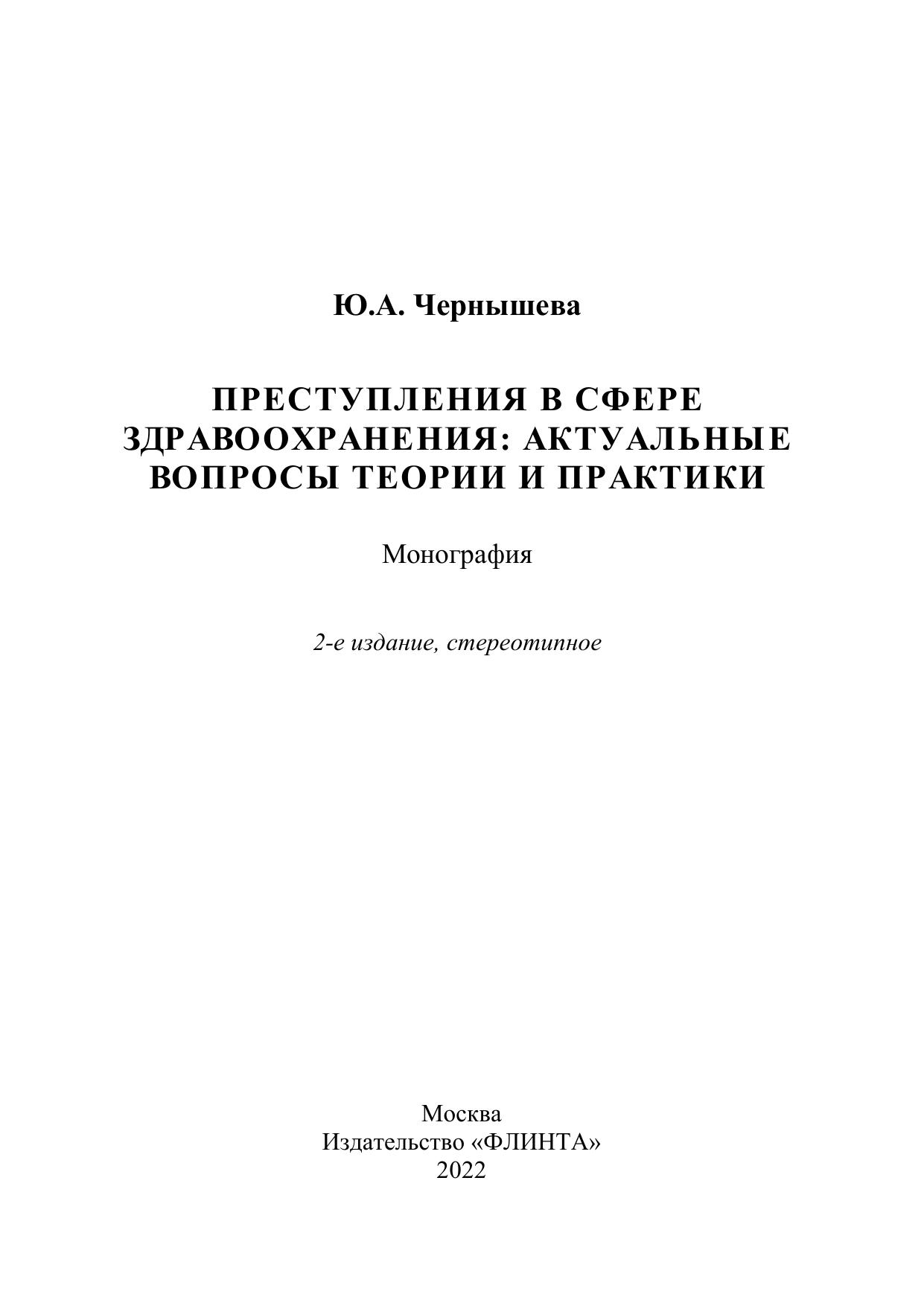 Книга адресована студентам, аспирантам, профессорско-преподавательскому составу юридических вузов и факультетов, а также всем тем, кто интересуется исследованием преступлений в сфере здравоохранения.
