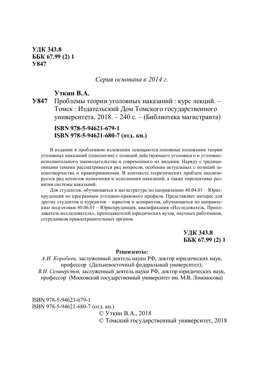 В издании в проблемном изложении освещаются основные положения теории уголовных наказаний (пенологии) с позиций действующего уголовного и уголовно-исполнительного законодательства и современного их видения. Наряду с традиционными темами рассматривается ряд вопросов, особенно актуальных с позиций законотворчества и правоприменения. В контексте теоретических проблем анализируется ряд аспектов назначения и исполнения наказаний, а также перспективы развития системы наказаний. Для студентов, обучающихся в магистратуре по направлению 40.04.01 – Юриспруденция по программам уголовно-правового профиля. Представляет интерес для других студентов и курсантов – юристов и аспирантов, обучающихся по направлению подготовки 40.06.01 – Юриспруденция, квалификация «Исследователь. Преподаватель-исследователь», преподавателей юридических вузов, научных работников, сотрудников правоохранительных органов.