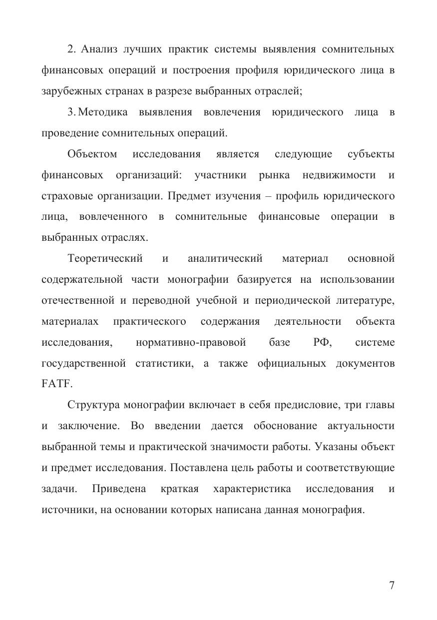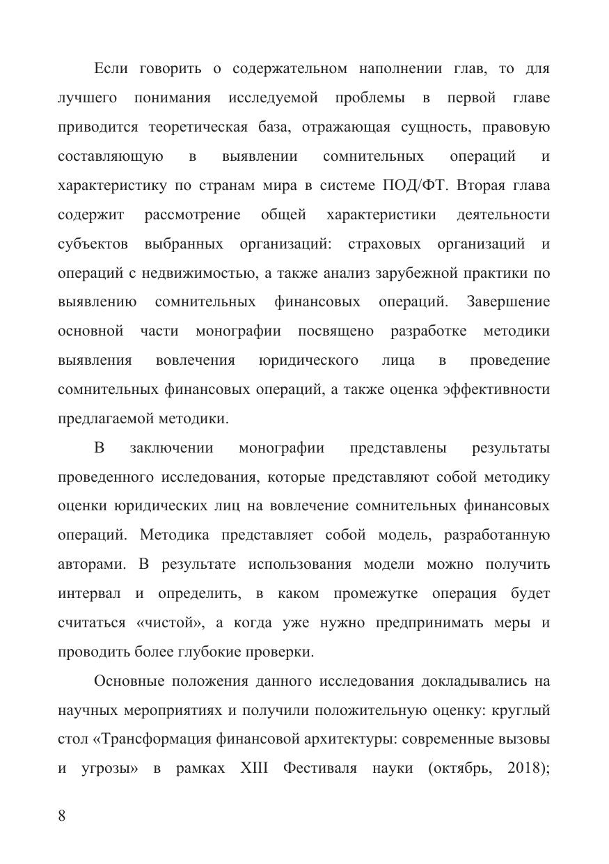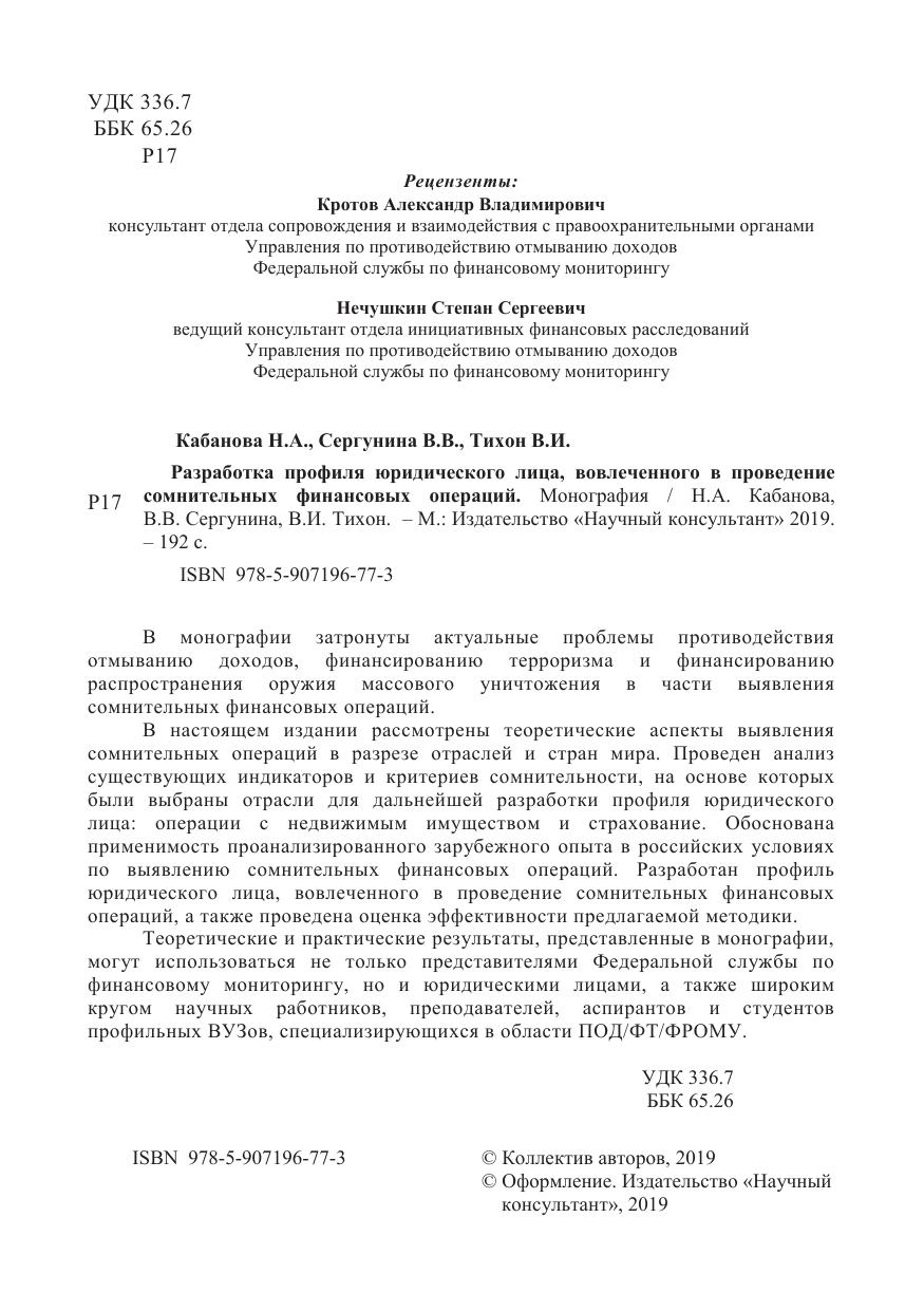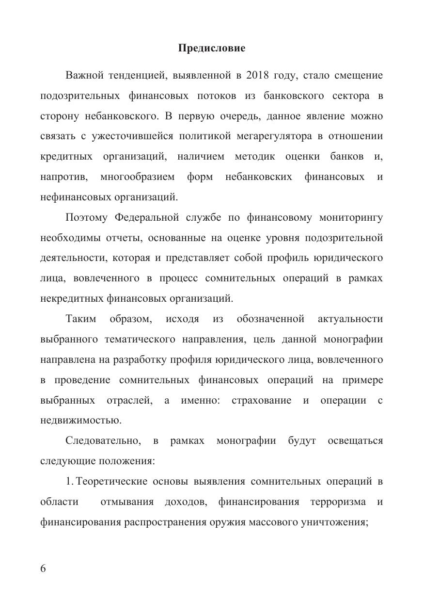 В монографии затронуты актуальные проблемы противодействия отмыванию доходов, финансированию терроризма и финансированию распространения оружия массового уничтожения в части выявления сомнительных финансовых операций. В настоящем издании рассмотрены теоретические аспекты выявления сомнительных операций в разрезе отраслей и стран мира. Проведен анализ существующих индикаторов и критериев сомнительности, на основе которых были выбраны отрасли для дальнейшей разработки профиля юридического лица: операции с недвижимым имуществом и страхование. Обоснована применимость проанализированного зарубежного опыта в российских условиях по выявлению сомнительных финансовых операций. Разработан профиль юридического лица, вовлеченного в проведение сомнительных финансовых операций, а также проведена оценка эффективности предлагаемой методики. Теоретические и практические результаты, представленные в монографии, могут использоваться не только представителями Федеральной службы по финансовому мониторингу, но и юридическими лицами, а также широким кругом научных работников, преподавателей, аспирантов и студентов профильных ВУЗов, специализирующихся в области ПОД/ФТ/ФРОМУ.