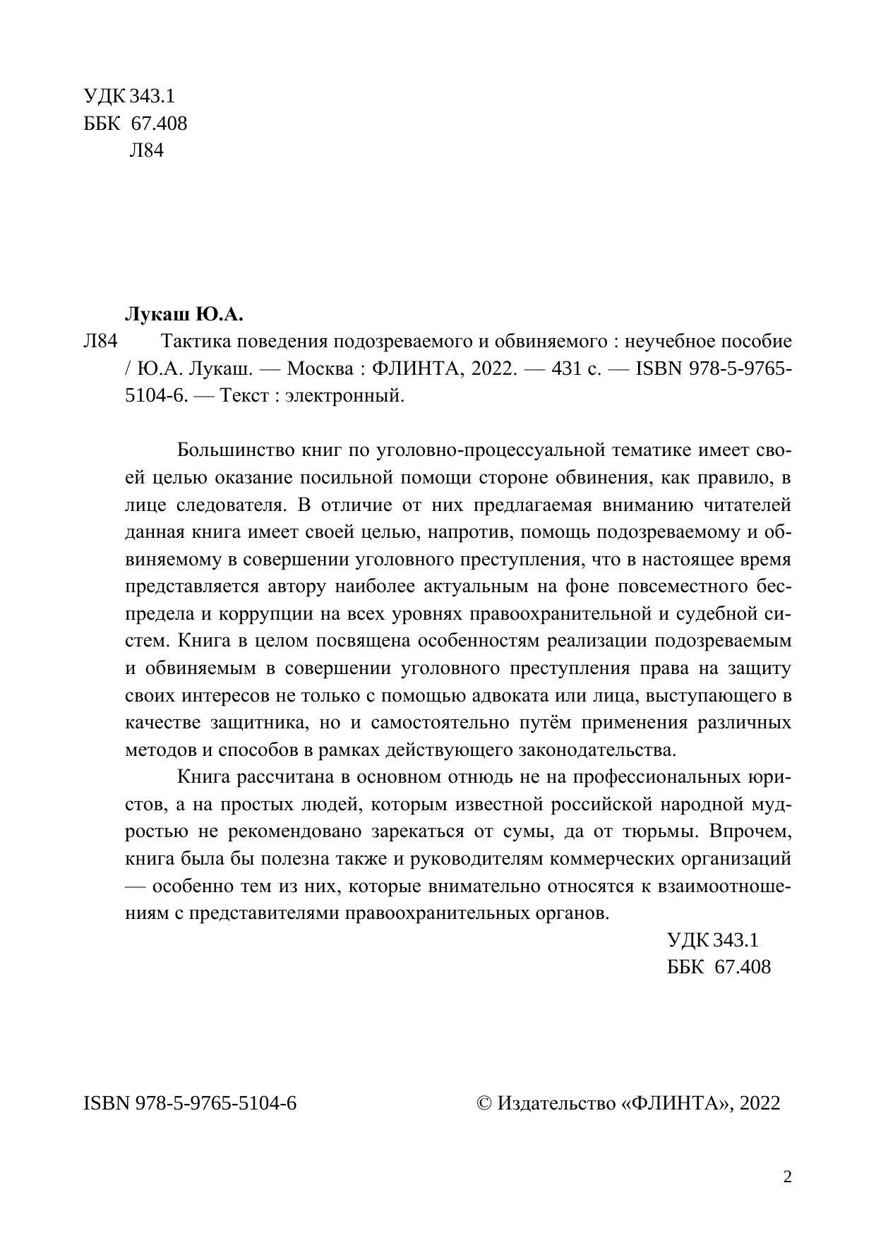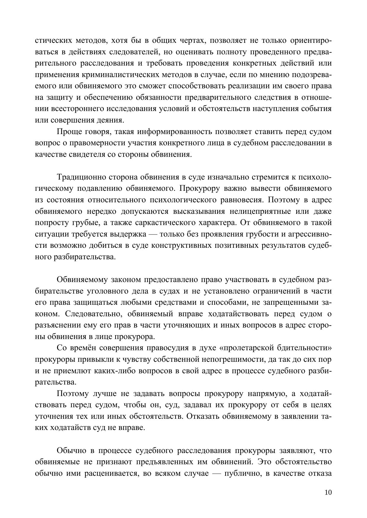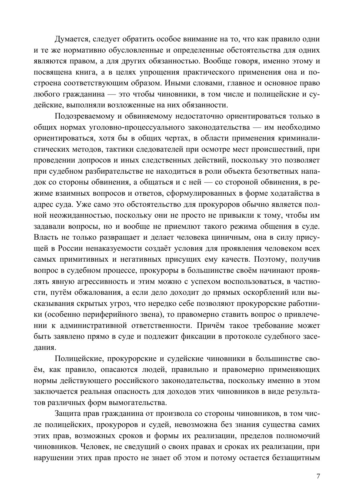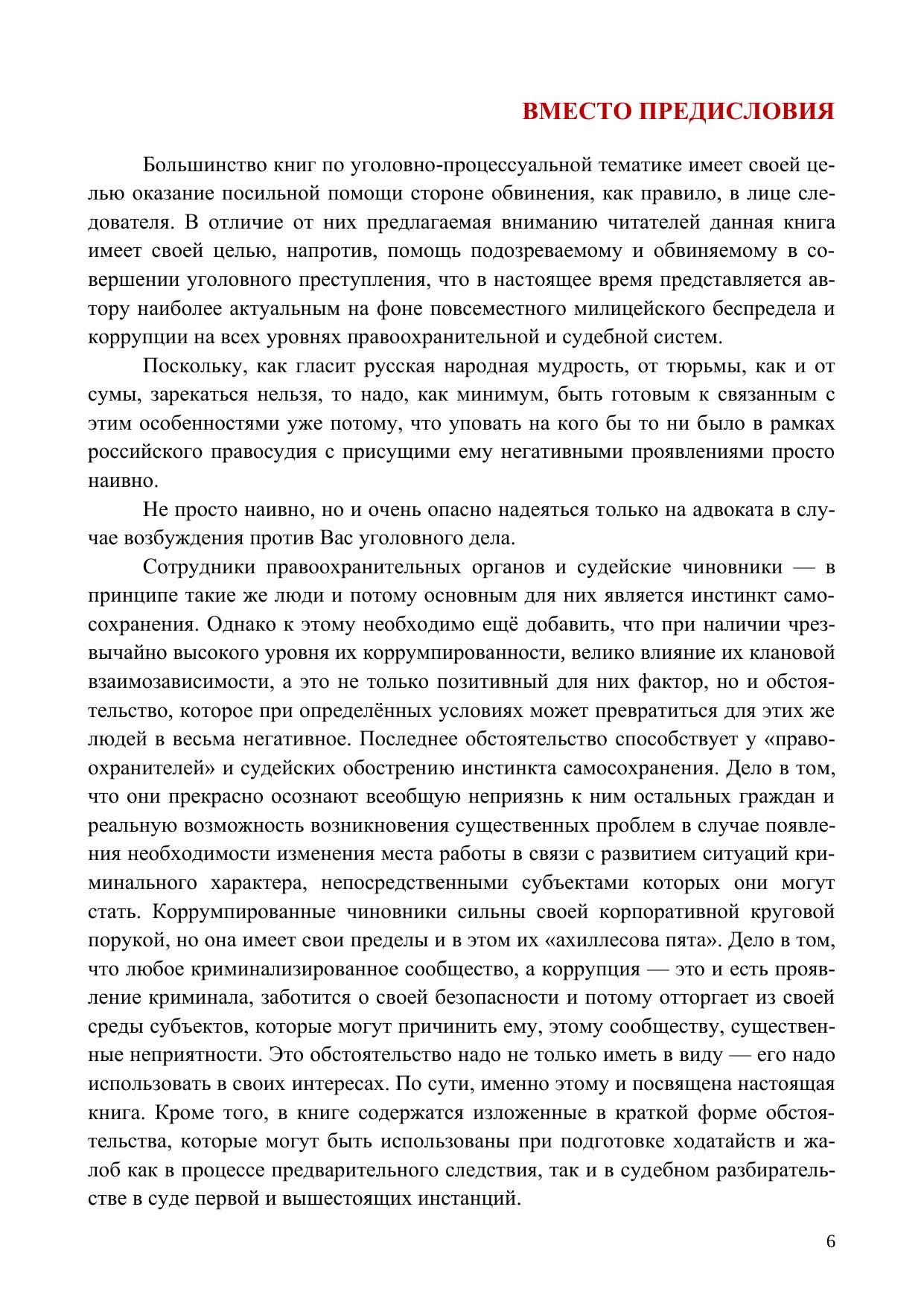 Большинство книг по уголовно-процессуальной тематике имеет своей целью оказание посильной помощи стороне обвинения, как правило, в лице следователя. В отличие от них предлагаемая вниманию читателей данная книга имеет своей целью, напротив, помощь подозреваемому и обвиняемому в совершении уголовного преступления, что в настоящее время представляется автору наиболее актуальным на фоне повсеместного беспредела и коррупции на всех уровнях правоохранительной и судебной систем. Книга в целом посвящена особенностям реализации подозреваемым и обвиняемым в совершении уголовного преступления права на защиту своих интересов не только с помощью адвоката или лица, выступающего в качестве защитника, но и самостоятельно путём применения различных методов и способов в рамках действующего законодательства.
