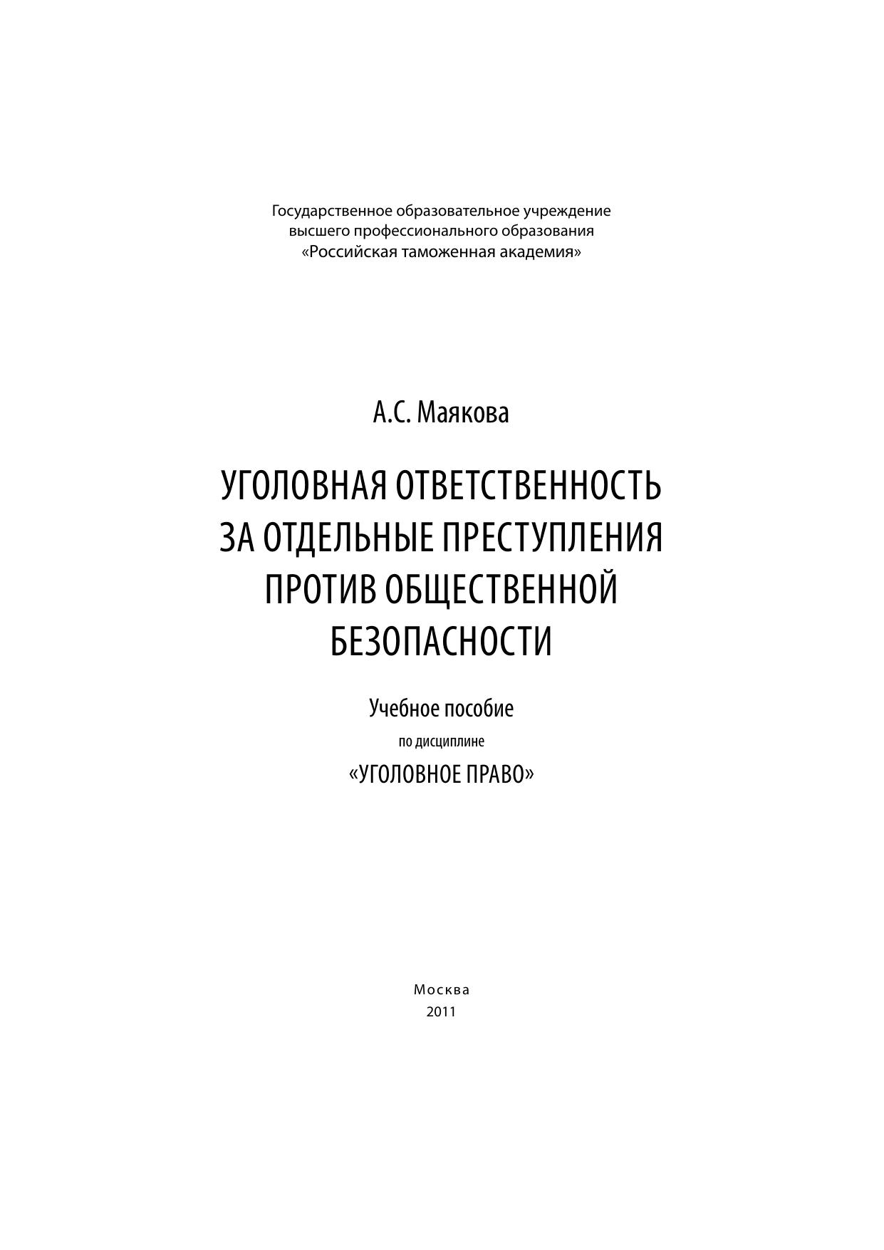 В учебном пособии дана общая характеристика преступлений против общественной безопасности, исследуются теоретические и практические вопросы квалификации преступлений террористического характера, составов, связанных с созданием организованных преступных групп (организаций) и незаконным оборотом оружия. Внимание уделено также разграничению смежных составов преступлений. При подготовке пособия использованы материалы международных конвенций, федеральных законов, постановлений Пленума Верховного Суда РФ по смежным вопросам, а также судебной практики. Учебное пособие рассчитано на студентов Российской таможенной академии, аспирантов, преподавателей, а также на специалистов в сфере борьбы с преступностью.