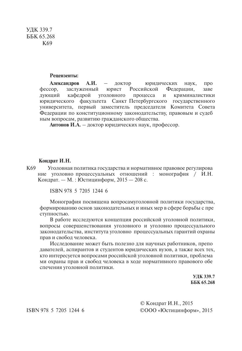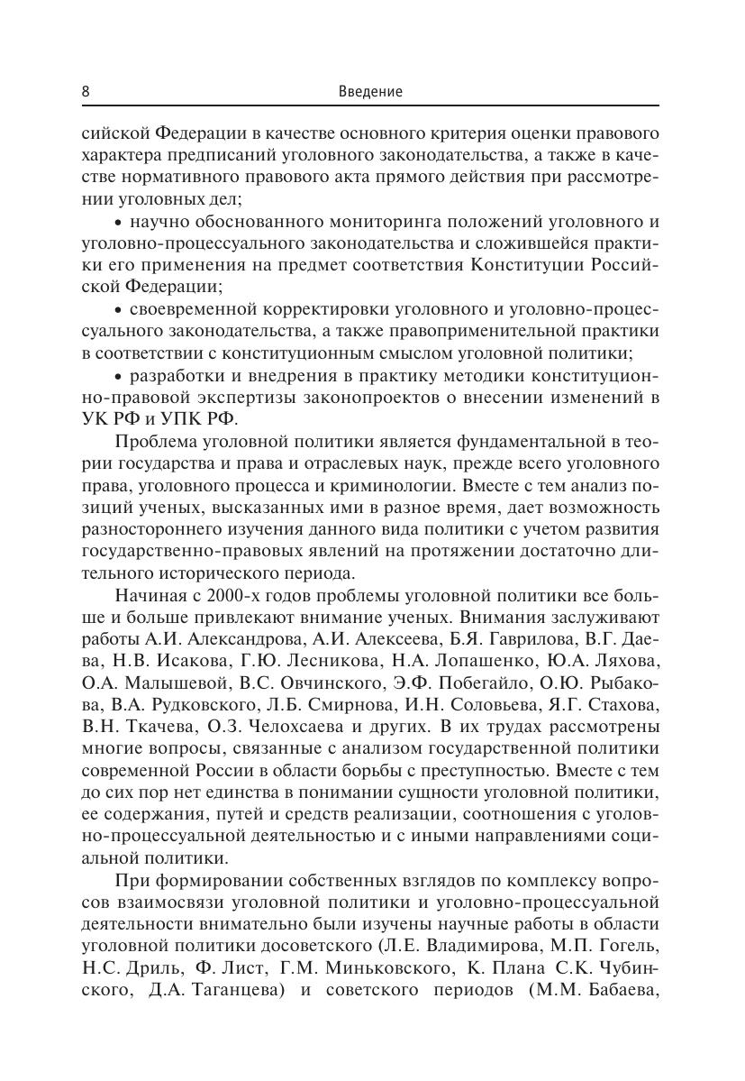 Монография посвящена вопросамуголовной политики государства, формированию основ законодательных и иных мер в сфере борьбы с преступностью. В работе исследуются концепция российской уголовной политики, вопросы совершенствования уголовного и уголовно процессуального законодательства, института уголовно процессуальных гарантий охраны прав и свобод человека. Исследование может быть полезно для научных работников, преподавателей, аспирантов и студентов юридических вузов, а также всех тех, кто интересуется вопросами российской уголовной политики, проблемами охраны прав и свобод человека в ходе нормативного правового обеспечения уголовной политики