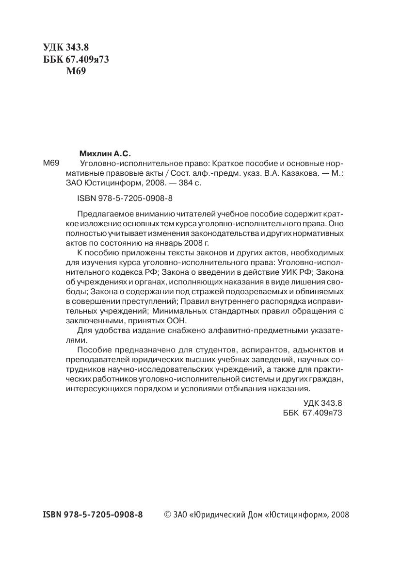 Предлагаемое вниманию читателей учебное пособие содержит краткое изложение основных тем курса уголовно-исполнительного права. Оно полностью учитывает изменения законодательства и других нормативных актов по состоянию на январь 2008 г. К пособию приложены тексты законов и других актов, необходимых для изучения курса уголовно-исполнительного права: Уголовно-исполнительного кодекса РФ Закона о введении в действие УИК РФ Закона об учреждениях и органах, исполняющих наказания в виде лишения свободы Закона о содержании под стражей подозреваемых и обвиняемых в совершении преступлений Правил внутреннего распорядка исправительных учреждений Минимальных стандартных правил обращения с заключенными, принятых ООН. Для удобства издание снабжено алфавитно-предметными указателями.Пособие предназначено для студентов, аспирантов, адъюнктов и преподавателей юридических высших учебных заведений, научных сотрудников научно-исследовательских учреждений, а также для практических работников уголовно-исполнительной системы и других граждан, интересующихся порядком и условиями отбывания наказания.