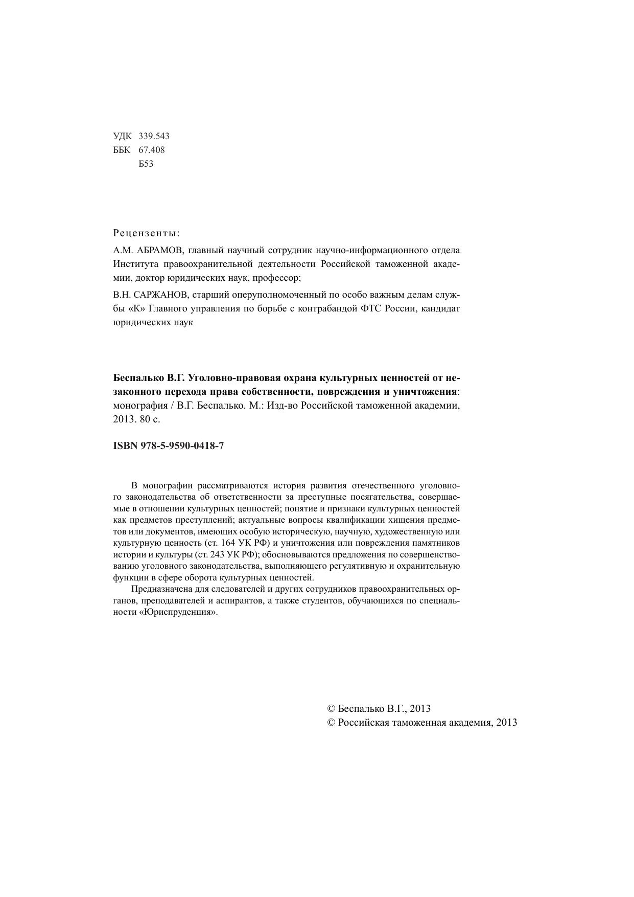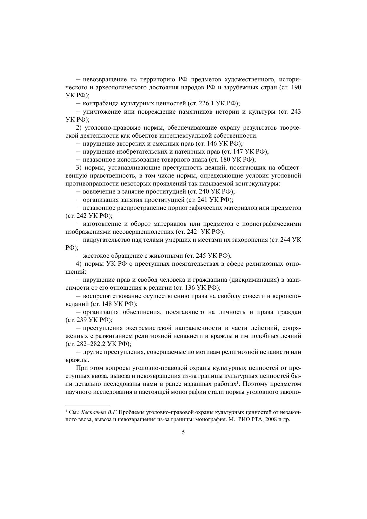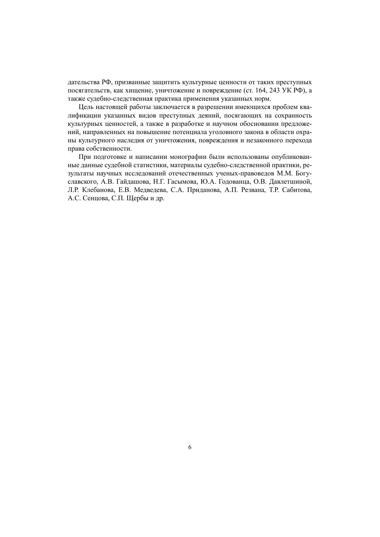 В монографии рассматриваются история развития отечественного уголовного законодательства об ответственности за преступные посягательства, совершаемые в отношении культурных ценностей; понятие и признаки культурных ценностей как предметов преступлений; актуальные вопросы квалификации хищения предметов или документов, имеющих особую историческую, научную, художественную или культурную ценность (ст. 164 УК РФ) и уничтожения или повреждения памятников истории и культуры (ст. 243 УК РФ); обосновываются предложения по совершенствованию уголовного законодательства, выполняющего регулятивную и охранительную функции в сфере оборота культурных ценностей.