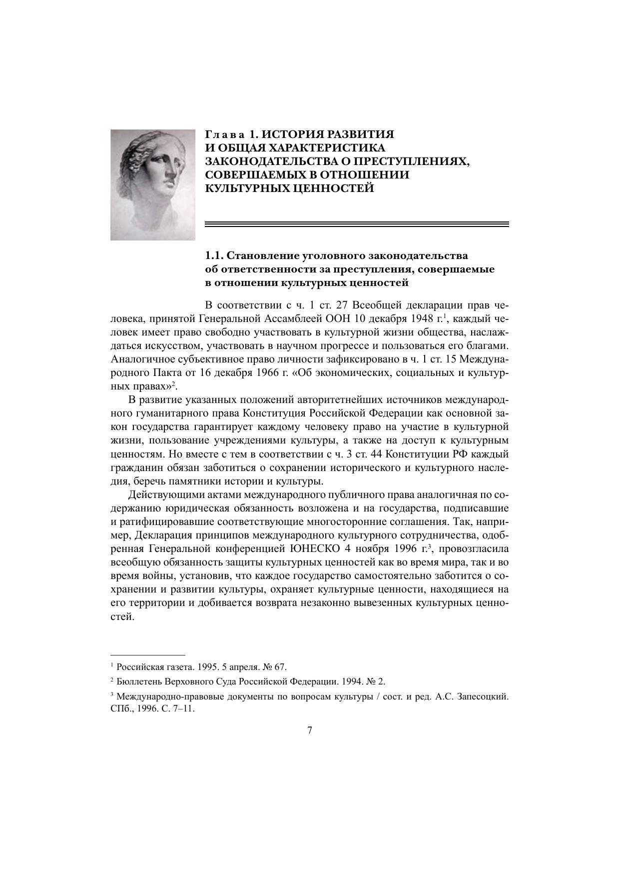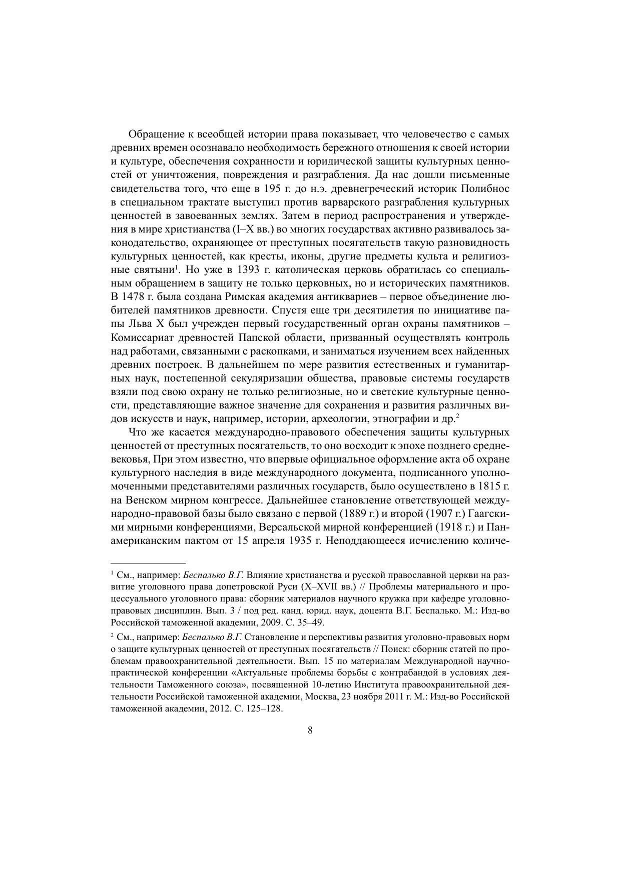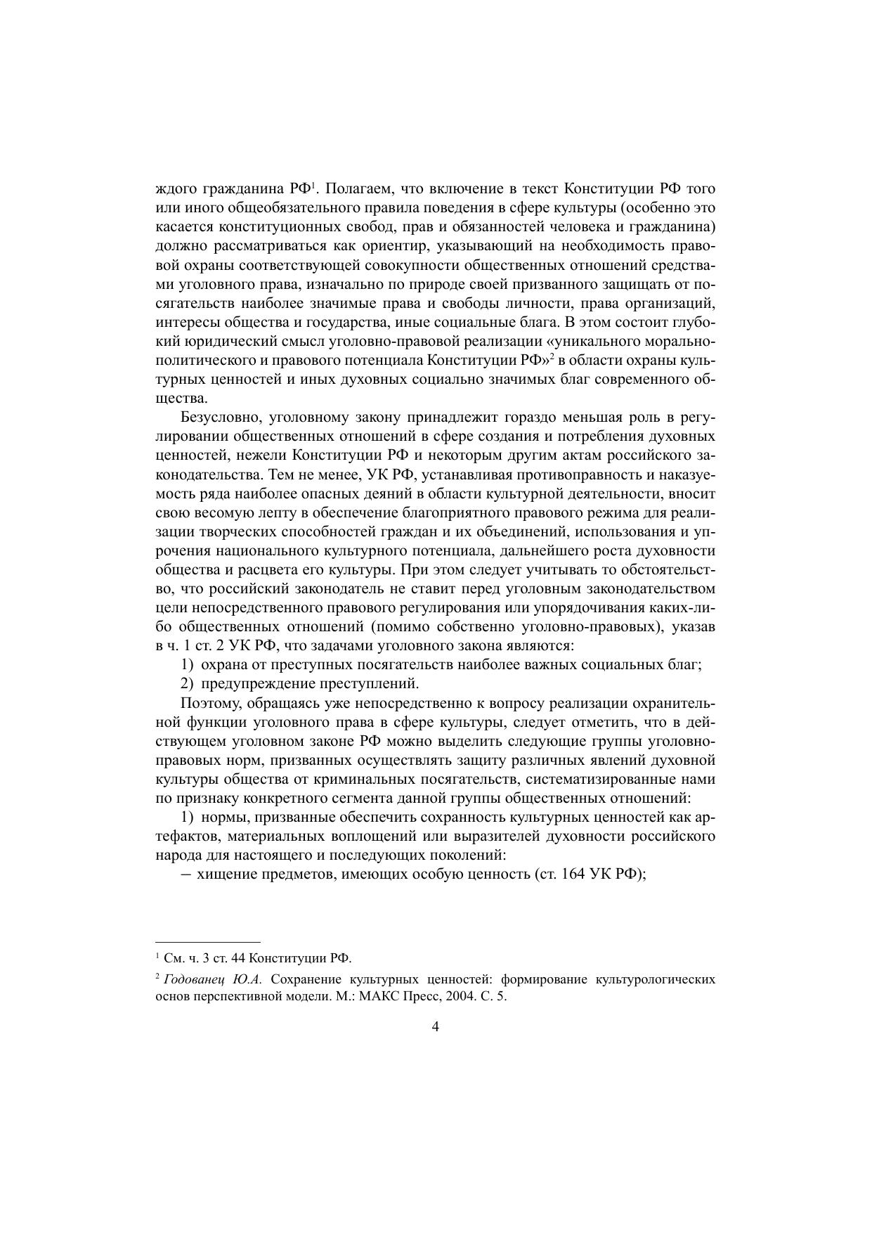 В монографии рассматриваются история развития отечественного уголовного законодательства об ответственности за преступные посягательства, совершаемые в отношении культурных ценностей; понятие и признаки культурных ценностей как предметов преступлений; актуальные вопросы квалификации хищения предметов или документов, имеющих особую историческую, научную, художественную или культурную ценность (ст. 164 УК РФ) и уничтожения или повреждения памятников истории и культуры (ст. 243 УК РФ); обосновываются предложения по совершенствованию уголовного законодательства, выполняющего регулятивную и охранительную функции в сфере оборота культурных ценностей.