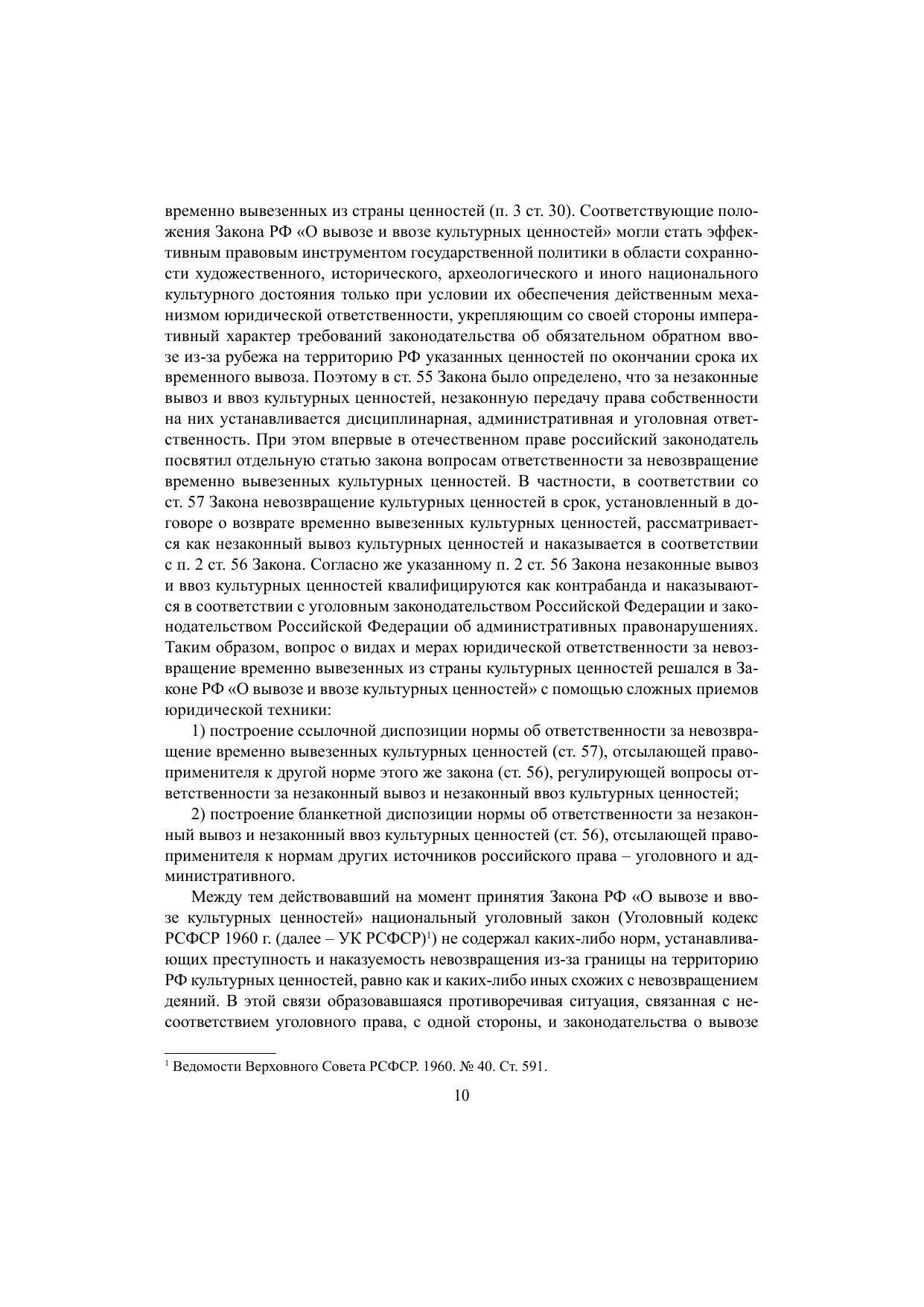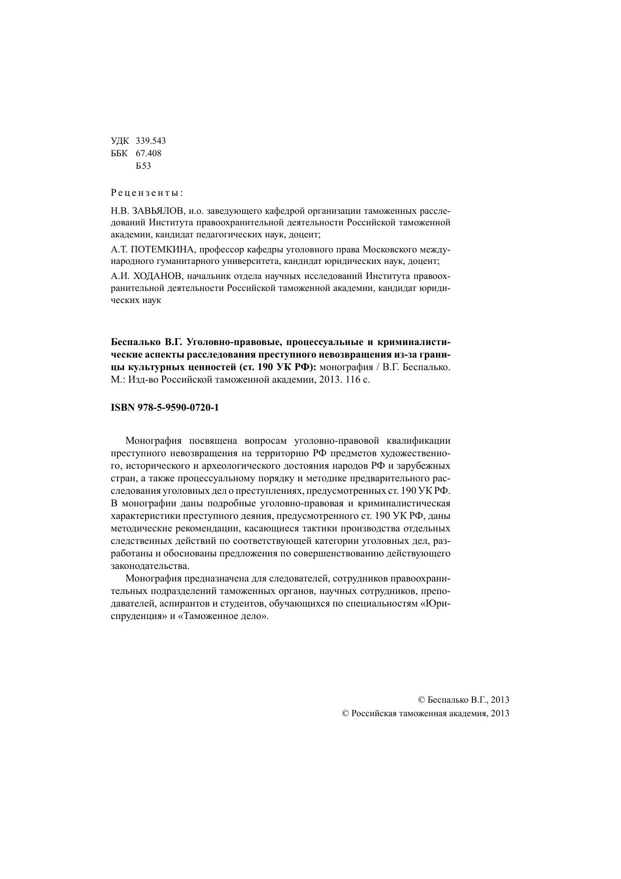 Монография посвящена вопросам уголовно-правовой квалификации преступного невозвращения на территорию РФ предметов художественного, исторического и археологического достояния народов РФ и зарубежных стран, а также процессуальному порядку и методике предварительного расследования уголовных дел о преступлениях, предусмотренных ст. 190 УК РФ. В монографии даны подробные уголовно-правовая и криминалистическая характеристики преступного деяния, предусмотренного ст. 190 УК РФ, даны методические рекомендации, касающиеся тактики производства отдельных следственных действий по соответствующей категории уголовных дел, разработаны и обоснованы предложения по совершенствованию действующего
