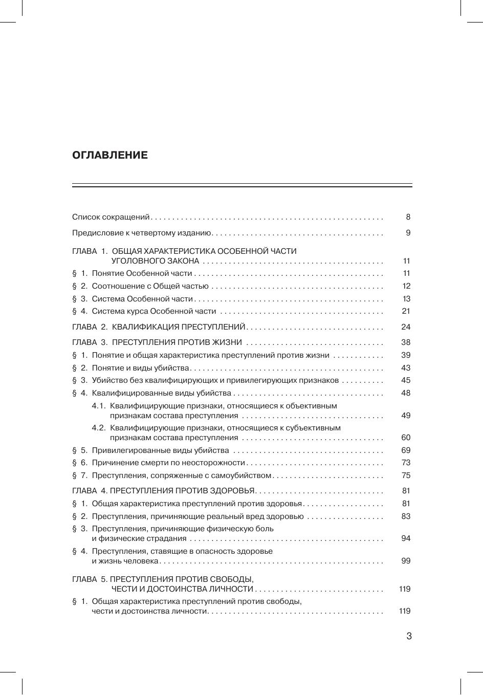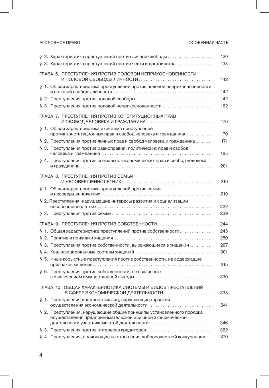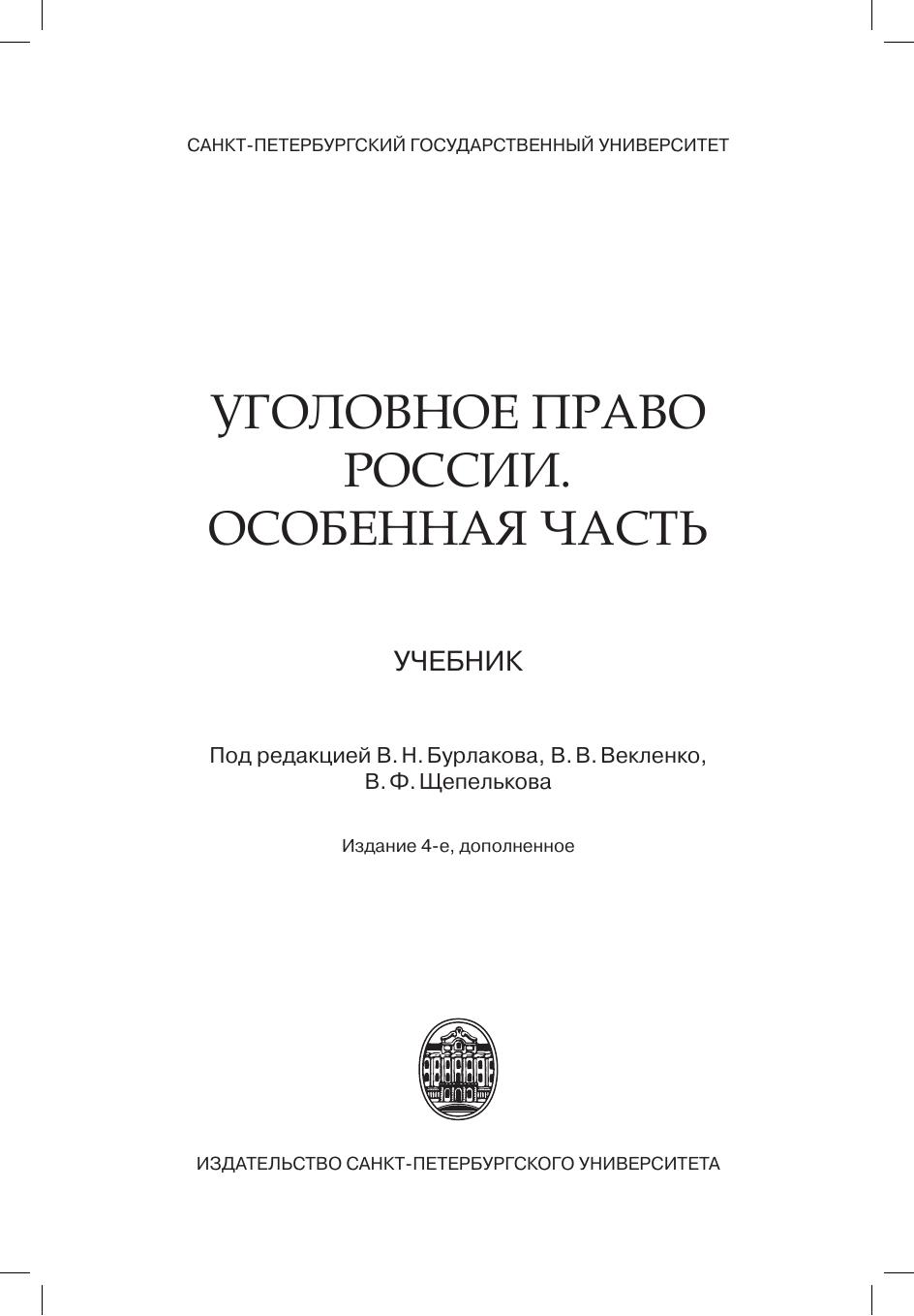 Учебник, написанный коллективом кафедры уголовного права Санкт-петербургского государственного университета, соответствует Федеральному государственному образовательному стандарту высшего профессионального образования, включает все темы, предусмотренные программой курса Особенной части уголовного права. Приводится классификация преступлений и подробно описываются их виды. В четвертом, дополненном издании учтены последние изменения российского законодательства. Даются новые примеры из актуальной правоприменительной практики последних лет, а также ссылки на новейшие исследования, посвященные уголовно-правовой проблематике.
