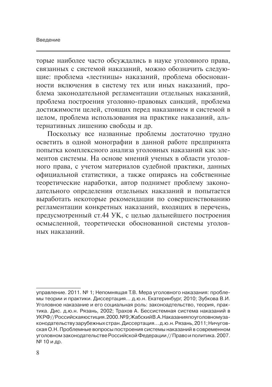 В монографии изучаются уголовные наказания как элементы системы наказаний. Раскрывается понятие каждого из наказаний, входящих в перечень, предусмотренный ст. 44 УК РФ. Анализируется судебная практика, выявляются ошибки, наиболее часто встречающиеся при назначении того или иного наказания. Изучаются различные точки зрения относительно регламентации конкретных наказаний, входящих в систему. Опираясь на мнения авторитетных ученых, а также собственные разработки, автор дает рекомендации относительно возможного дальнейшего совершенствования уголовного законодательства в части регламентации конкретных наказаний, что повлияет и на построение системы уголовных наказаний в целом.