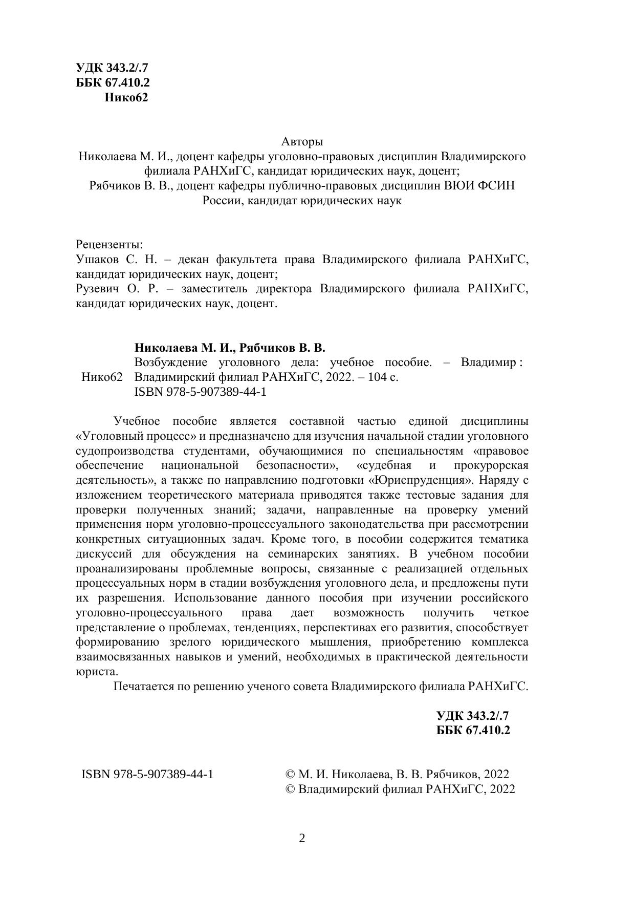 Учебное пособие является составной частью единой дисциплины «Уголовный процесс» и предназначено для изучения начальной стадии уголовного судопроизводства студентами, обучающимися по специальностям «правовое обеспечение национальной безопасности», «судебная и прокурорская деятельность», а также по направлению подготовки «Юриспруденция». Наряду с изложением теоретического материала приводятся также тестовые задания для проверки полученных знаний; задачи, направленные на проверку умений применения норм уголовно-процессуального законодательства при рассмотрении конкретных ситуационных задач. Кроме того, в пособии содержится тематика дискуссий для обсуждения на семинарских занятиях. В учебном пособии проанализированы проблемные вопросы, связанные с реализацией отдельных процессуальных норм в стадии возбуждения уголовного дела, и предложены пути их разрешения. Использование данного пособия при изучении российского уголовно-процессуального права дает возможность получить четкое представление о проблемах, тенденциях, перспективах его развития, способствует формированию зрелого юридического мышления, приобретению комплекса взаимосвязанных навыков и умений, необходимых в практической деятельности юриста. Печатается по решению ученого совета Владимирского филиала РАНХиГС.