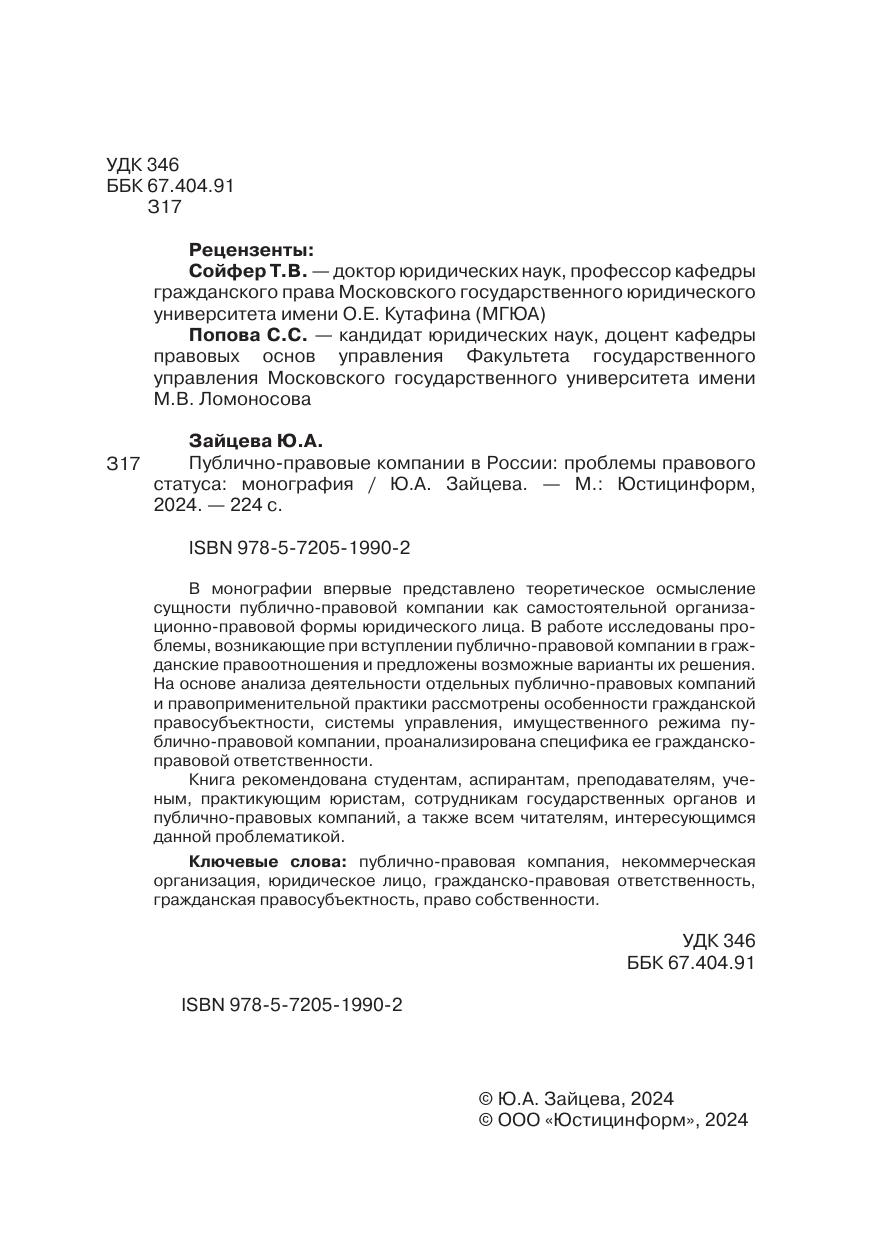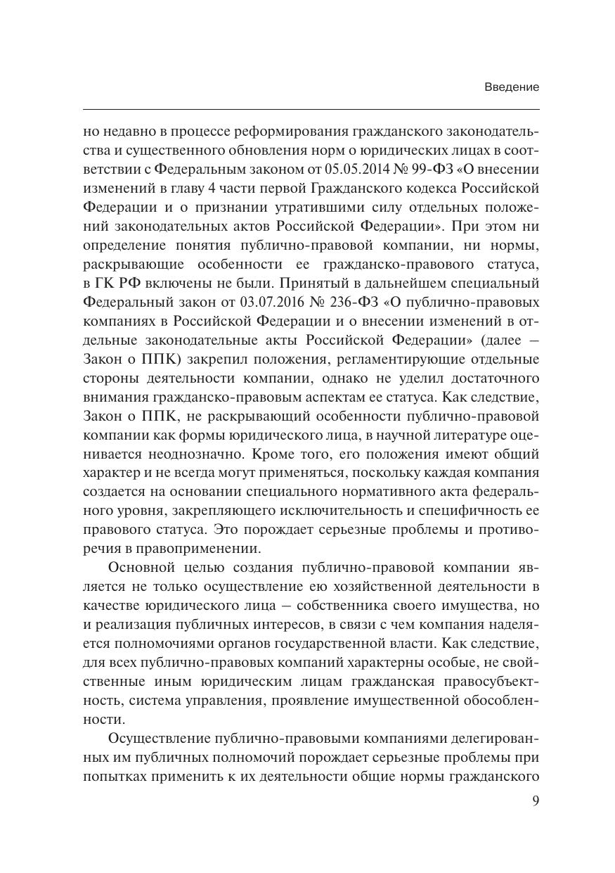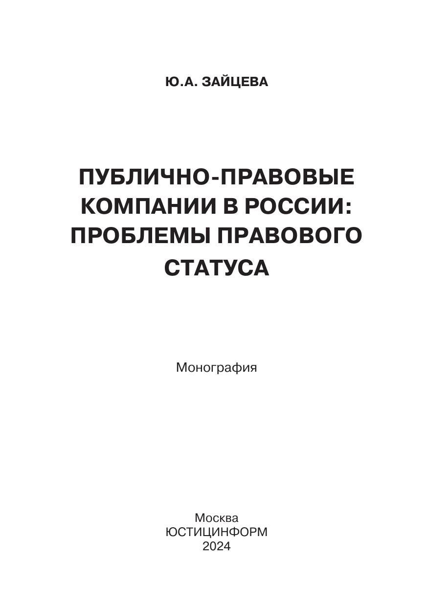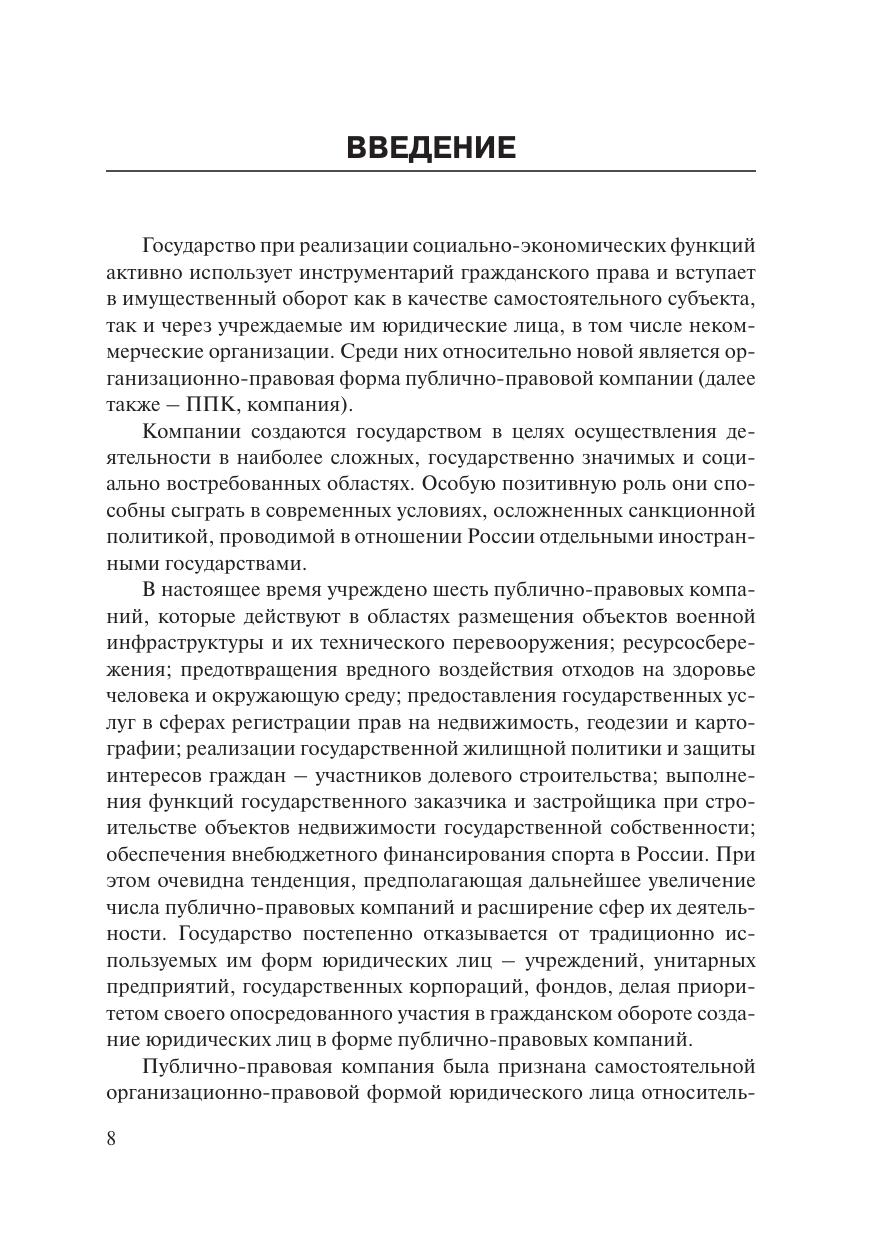 В монографии впервые представлено теоретическое осмысление сущности публично-правовой компании как самостоятельной организационно-правовой формы юридического лица. В работе исследованы проблемы, возникающие при вступлении публично-правовой компании в гражданские правоотношения и предложены возможные варианты их решения. На основе анализа деятельности отдельных публично-правовых компаний и правоприменительной практики рассмотрены особенности гражданской правосубъектности, системы управления, имущественного режима публично-правовой компании, проанализирована специфика ее гражданско-правовой ответственности.