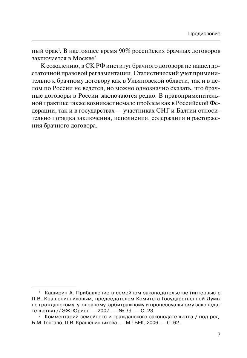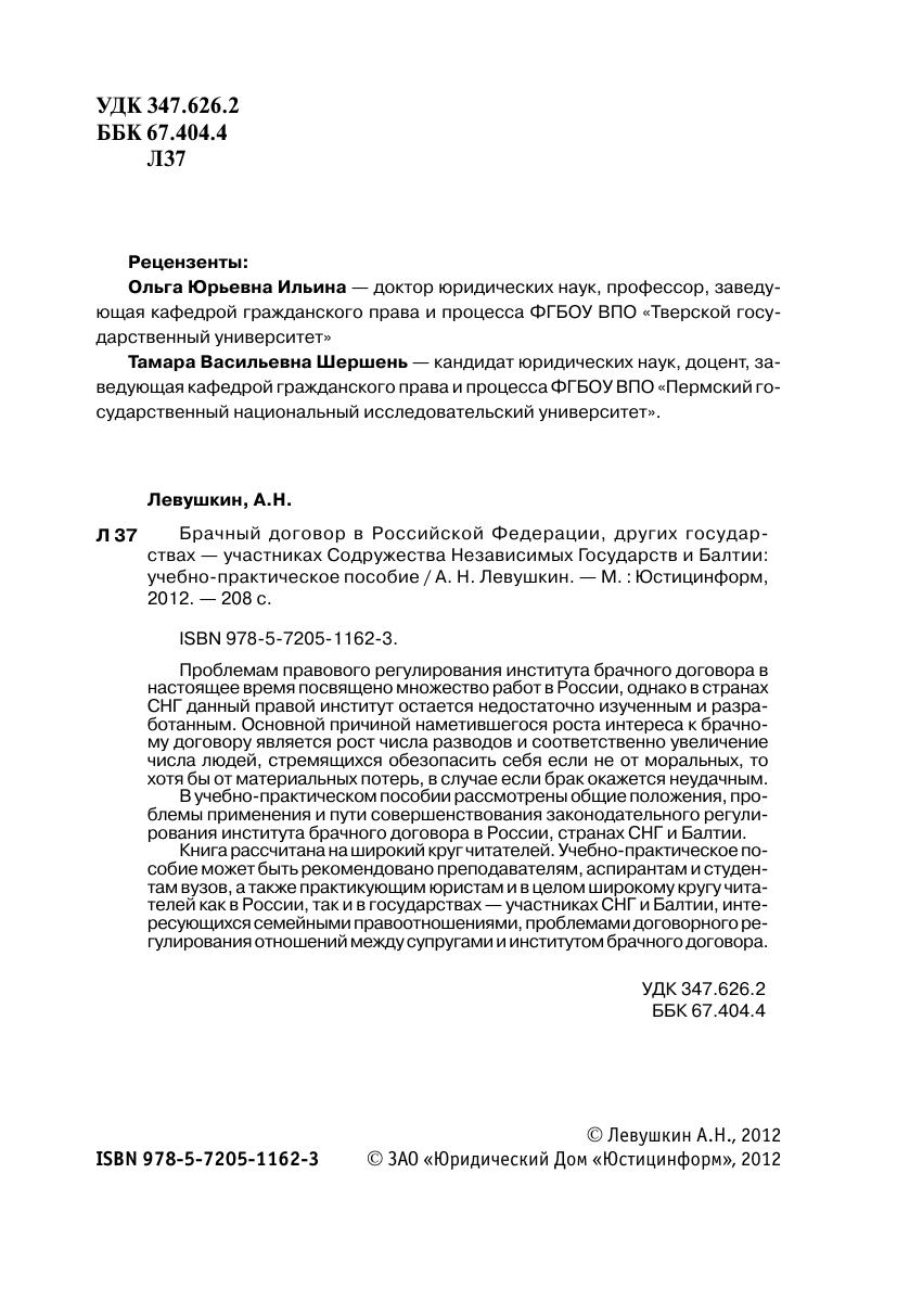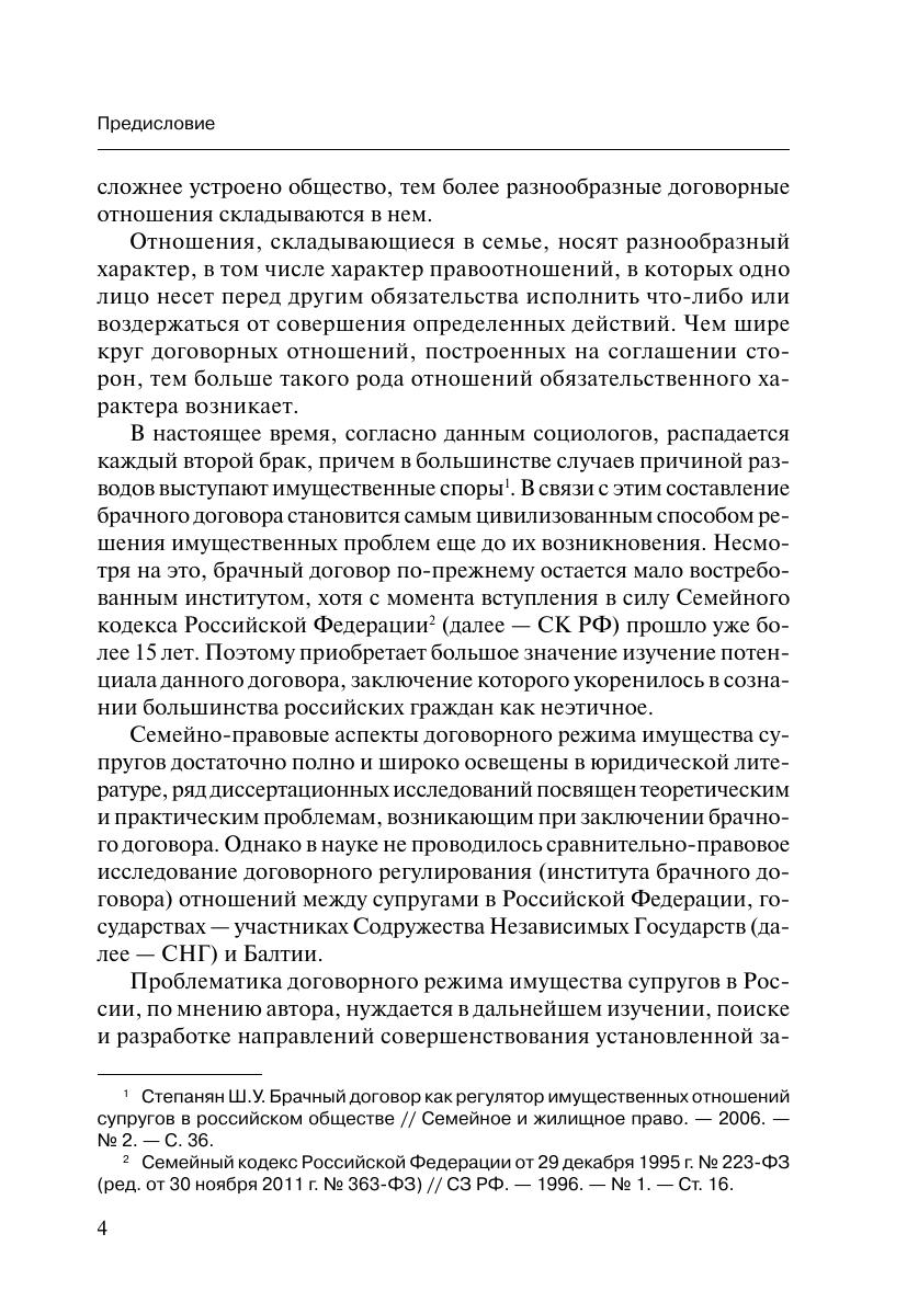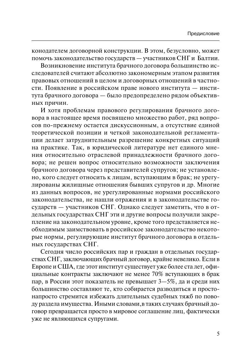 Проблемам правового регулирования института брачного договора в настоящее время посвящено множество работ в России, однако в странах СНГ данный правой институт остается недостаточно изученным и разработанным. Основной причиной наметившегося роста интереса к брачному договору является рост числа разводов и соответственно увеличение числа людей, стремящихся обезопасить себя если не от моральных, то хотя бы от материальных потерь, в случае если брак окажется неудачным.В учебно-практическом пособии рассмотрены общие положения, проблемы применения и пути совершенствования законодательного регулирования института брачного договора в России, странах СНГ и Балтии.Книга рассчитана на широкий круг читателей. Учебно-практическое пособие может быть рекомендовано преподавателям, аспирантам и студентам вузов, а также практикующим юристам и в целом широкому кругу читателей как в России, так и в государствах — участниках СНГ и Балтии, интересующихся семейными правоотношениями, проблемами договорного регулирования отношений между супругами и институтом брачного договора.