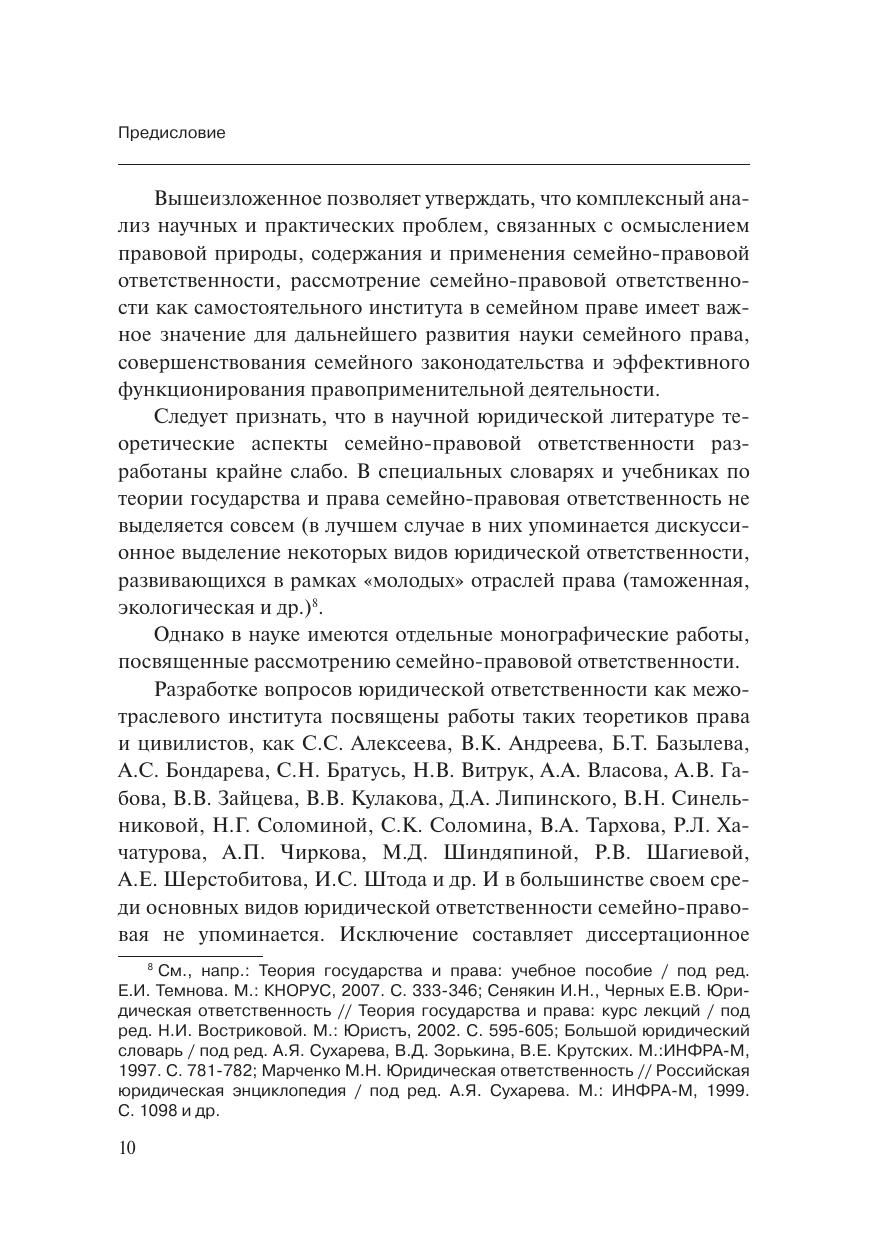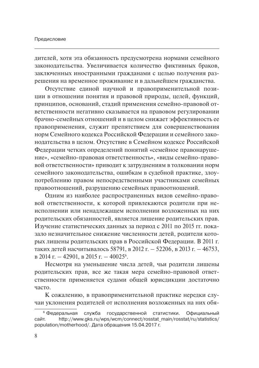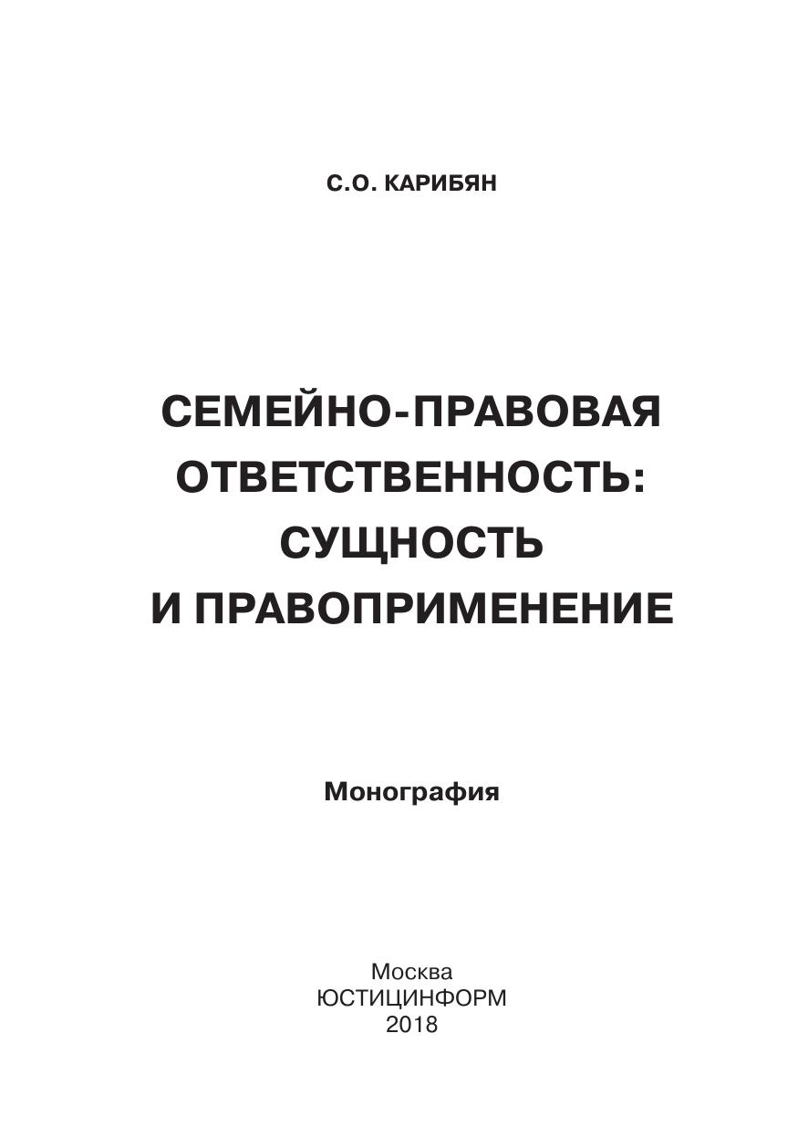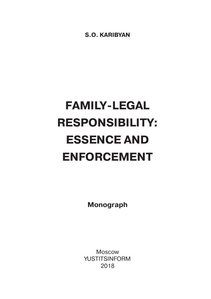В книге проанализированы имеющиеся в науке теоретические положения о семейно-правовой ответственности. Рассматривается вопрос о существовании в рамках семейного права семейно-правовой ответственности как самостоятельного вида юридической ответственности и института. Автор ставит задачу не только выявить сущность и правовую природу рассматриваемого вида юридической ответственности, выработать категориальный аппарат, но и определить самостоятельность выделяемого института семейно-правовой ответственности, выявить необходимость специального закрепления на уровне кодифицированного акта – в Семейном кодексе Российской Федерации дефиниции (категории) «семейно-правовая ответственность».