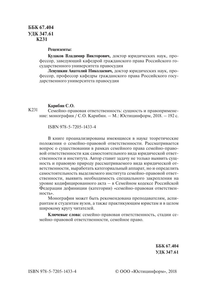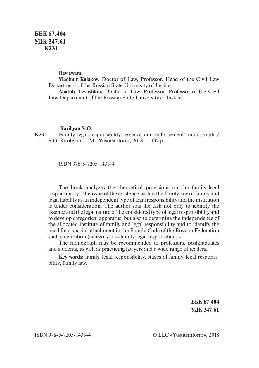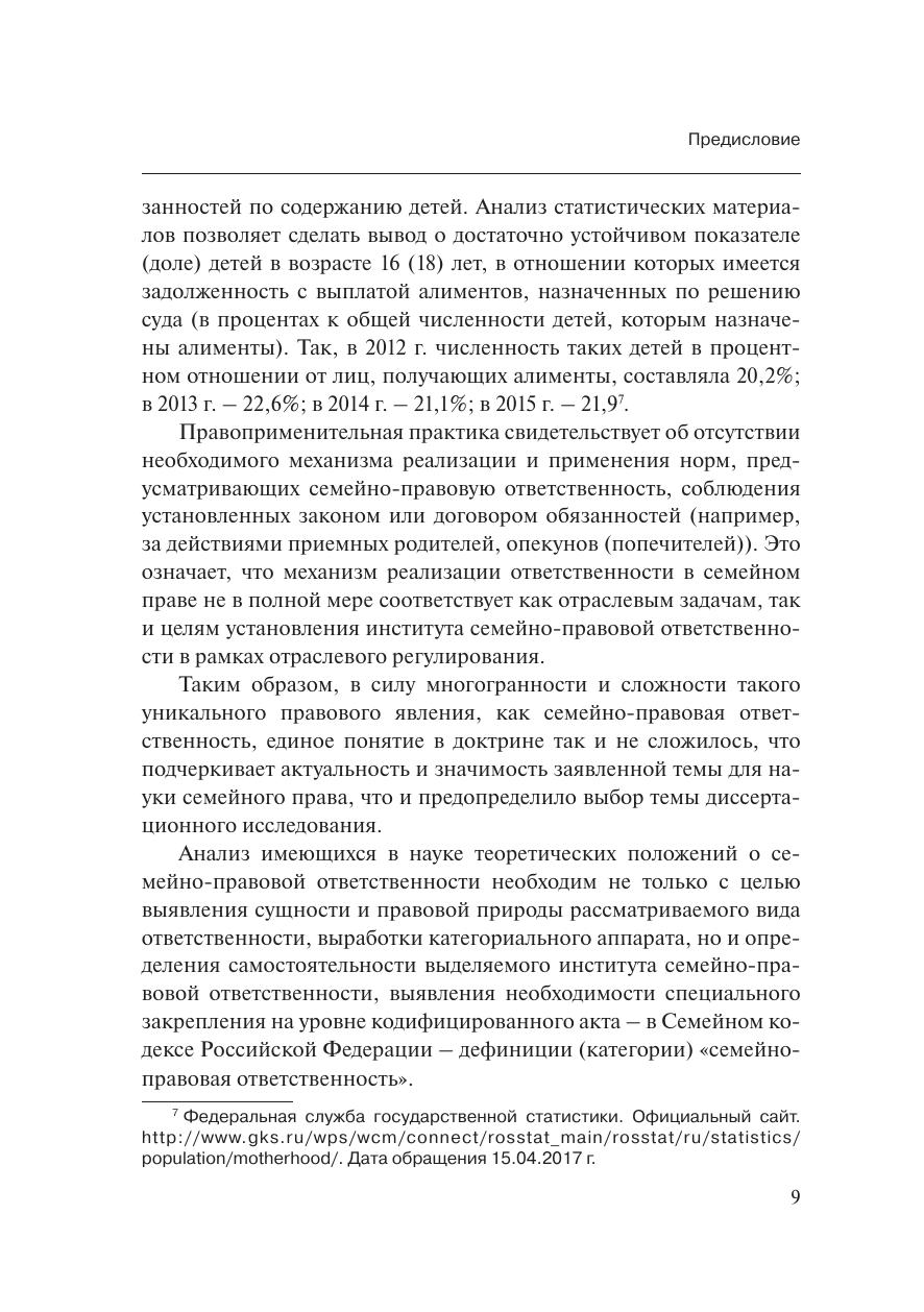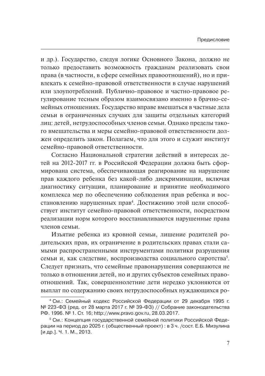 В книге проанализированы имеющиеся в науке теоретические положения о семейно-правовой ответственности. Рассматривается вопрос о существовании в рамках семейного права семейно-правовой ответственности как самостоятельного вида юридической ответственности и института. Автор ставит задачу не только выявить сущность и правовую природу рассматриваемого вида юридической ответственности, выработать категориальный аппарат, но и определить самостоятельность выделяемого института семейно-правовой ответственности, выявить необходимость специального закрепления на уровне кодифицированного акта – в Семейном кодексе Российской Федерации дефиниции (категории) «семейно-правовая ответственность».