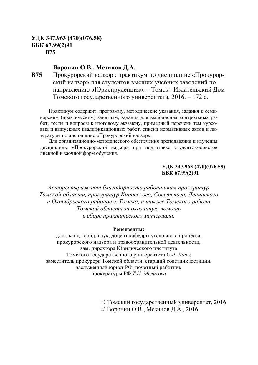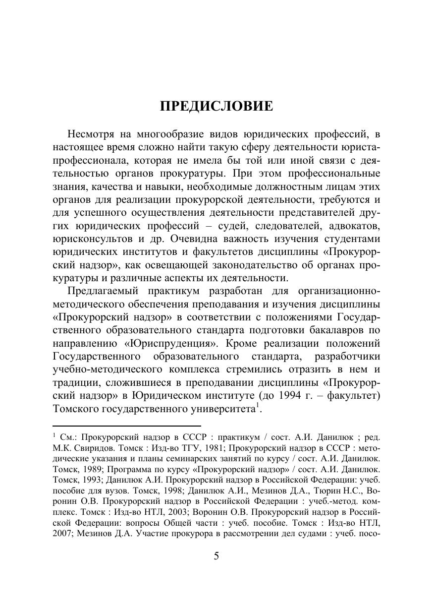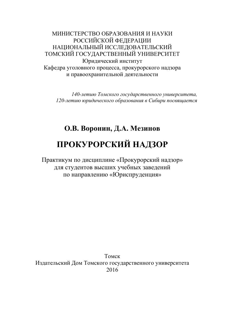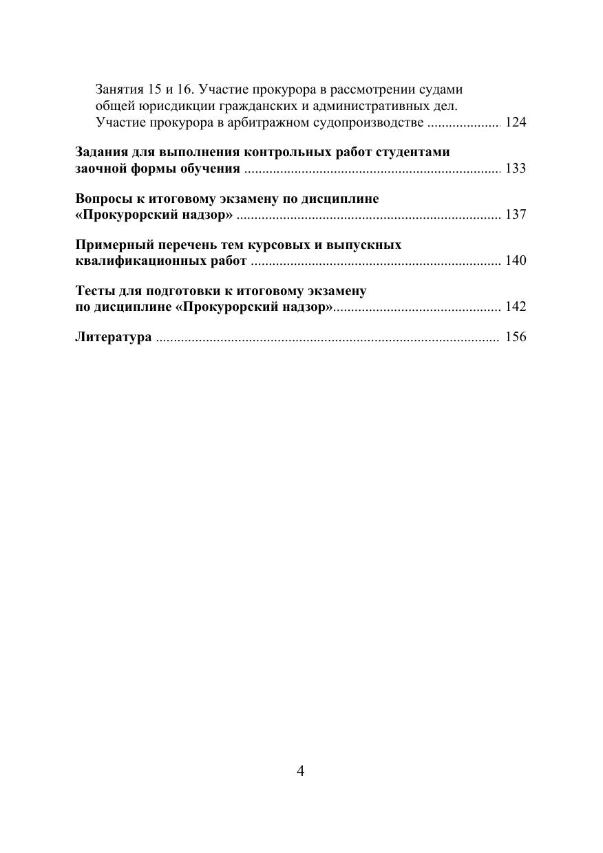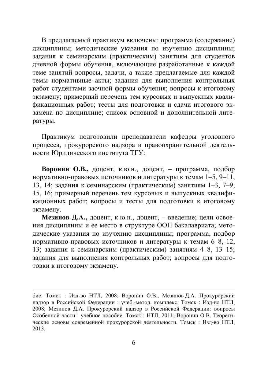 Практикум содержит, программу, методические указания, задания к семи нарским (практическим) занятиям, задания для выполнения контрольных ра бот, тесты и вопросы к итоговому экзамену, примерный перечень тем курсо вых и выпускных квалификационных работ, списки нормативных актов и ли тературы по дисциплине «Прокурорский надзор». Для организационно-методического обеспечения преподавания и изучения дисциплины «Прокурорский надзор» при подготовке студентов-юристов дневной и заочной форм обучения.
