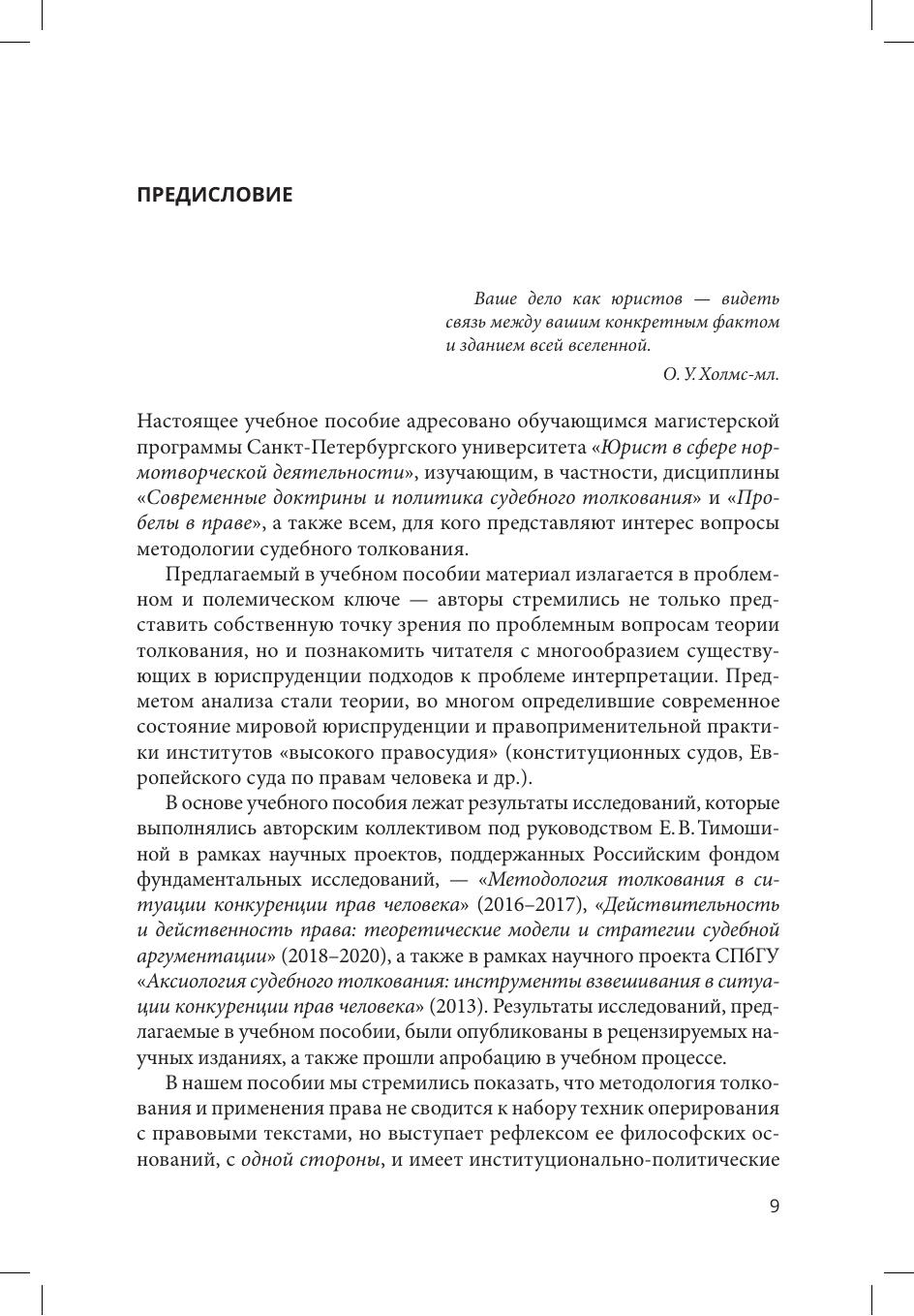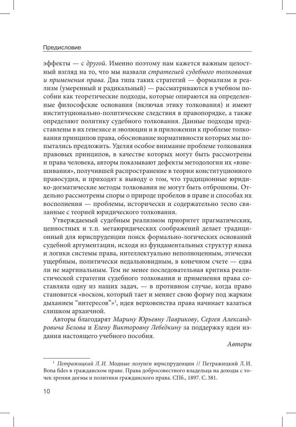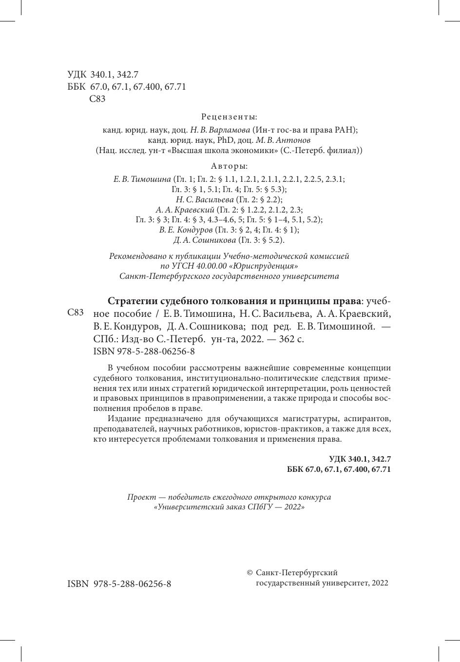 В учебном пособии рассмотрены важнейшие современные концепции судебного толкования, институционально-политические следствия применения тех или иных стратегий юридической интерпретации, роль ценностей и правовых принципов в правоприменении, а также природа и способы восполнения пробелов в праве. Издание предназначено для обучающихся магистратуры, аспирантов, преподавателей, научных работников, юристов-практиков, а также для всех, кто интересуется проблемами толкования и применения права.