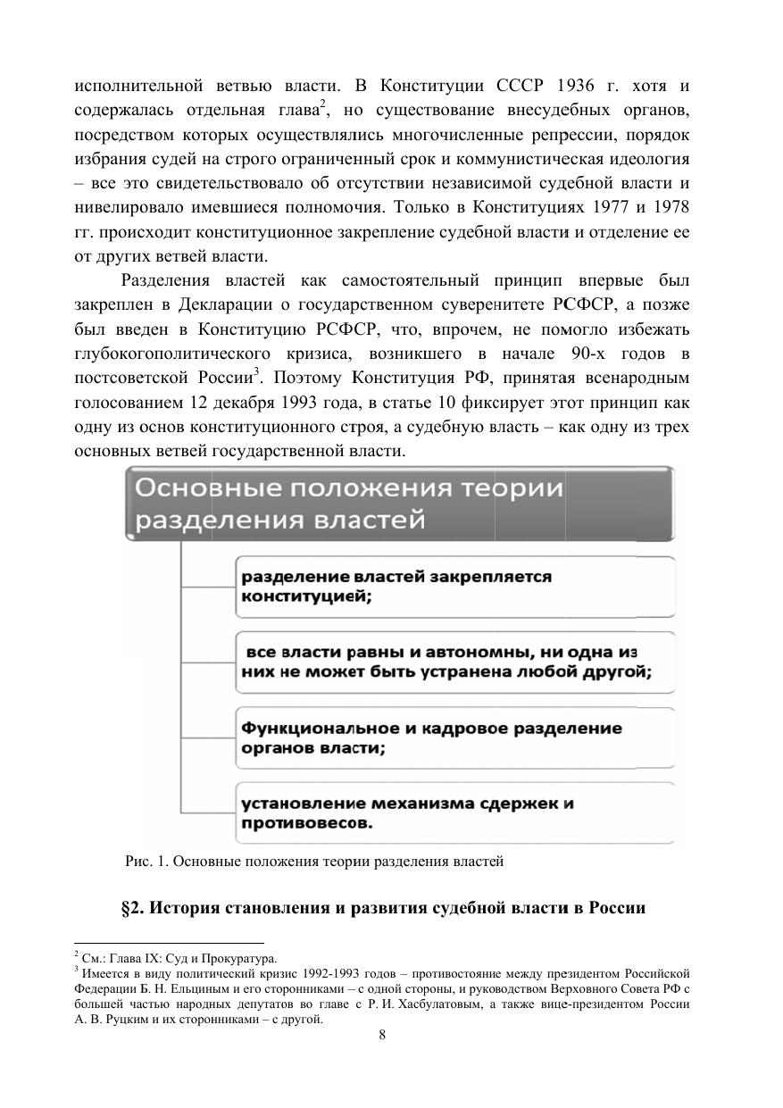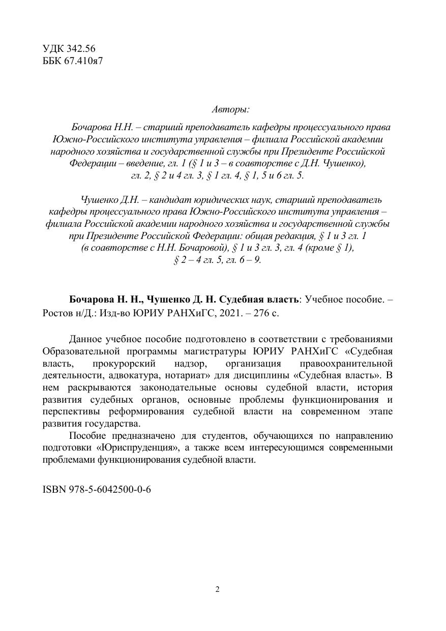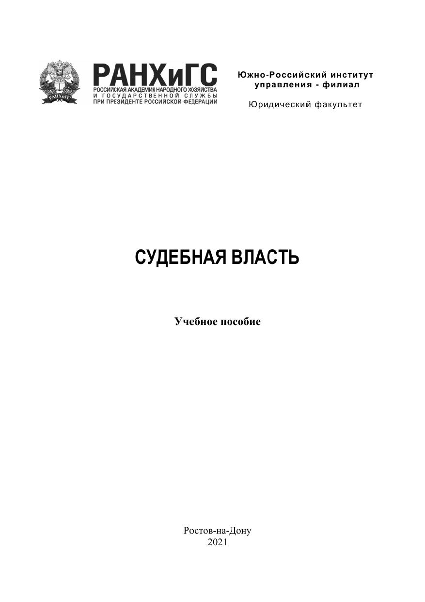 Данное учебное пособие подготовлено в соответствии с требованиями Образовательной программы магистратуры ЮРИУ РАНХиГС «Судебная власть, прокурорский надзор, организация правоохранительной деятельности, адвокатура, нотариат» для дисциплины «Судебная власть». В нем раскрываются законодательные основы судебной власти, история развития судебных органов, основные проблемы функционирования и перспективы реформирования судебной власти на современном этапе развития государства. Пособие предназначено для студентов, обучающихся по направлению подготовки «Юриспруденция», а также всем интересующимся современными проблемами функционирования судебной власти.