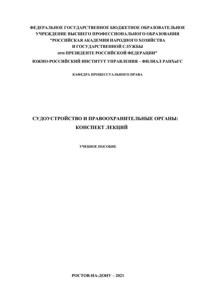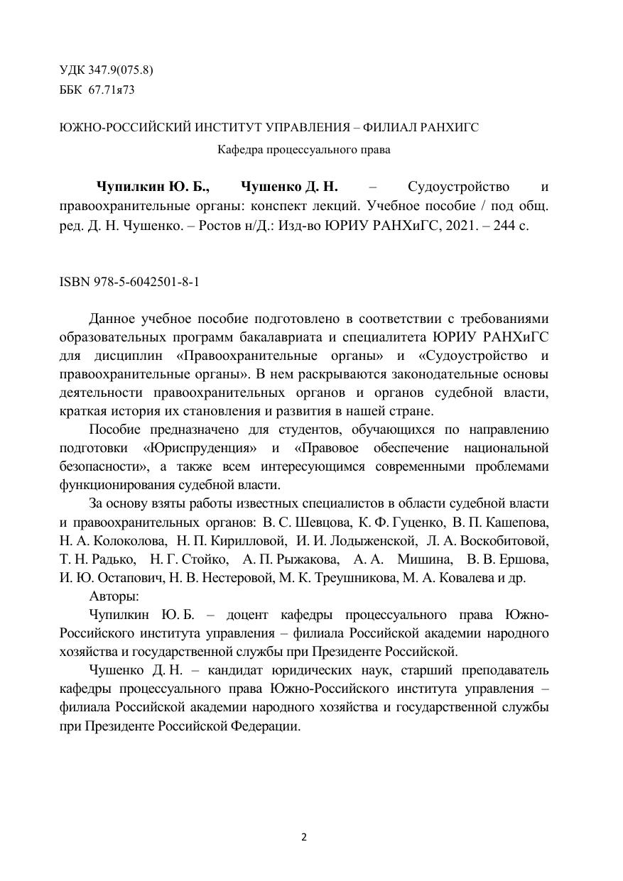 Данное учебное пособие подготовлено в соответствии с требованиями образовательных программ бакалавриата и специалитета ЮРИУ РАНХиГС для дисциплин «Правоохранительные органы» и «Судоустройство и правоохранительные органы». В нем раскрываются законодательные основы деятельности правоохранительных органов и органов судебной власти, краткая история их становления и развития в нашей стране. Пособие предназначено для студентов, обучающихся по направлению подготовки «Юриспруденция» и «Правовое обеспечение национальной безопасности», а также всем интересующимся современными проблемами функционирования судебной власти. За основу взяты работы известных специалистов в области судебной власти и правоохранительных органов: B. C. Шевцова, К. Ф. Гуценко, В. П. Кашепова, Н. А. Колоколова, Н. П. Кирилловой, И. И. Лодыженской, Л. А. Воскобитовой, Т. Н. Радько, Н. Г. Стойко, А. П. Рыжакова, А. А. Мишина, В. В. Ершова, И. Ю. Остапович, Н. В. Нестеровой, М. К. Треушникова, М. А. Ковалева и др. Авторы: Чупилкин Ю. Б. – доцент кафедры процессуального права ЮжноРоссийского института управления – филиала Российской академии народного хозяйства и государственной службы при Президенте Российской. Чушенко Д. Н. – кандидат юридических наук, старший преподаватель кафедры процессуального права Южно-Российского института управления – филиала Российской академии народного хозяйства и государственной службы при Президенте Российской Федерации.