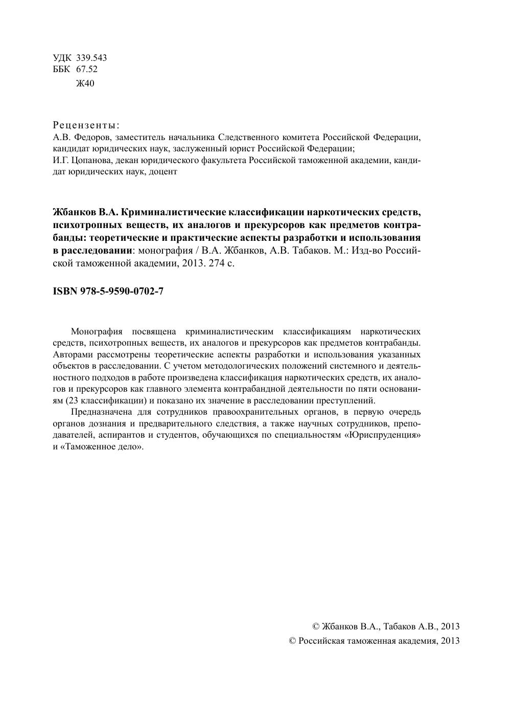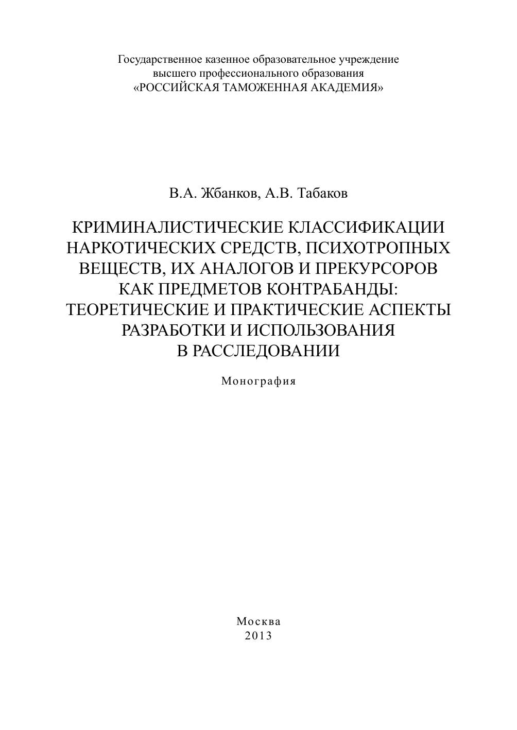 Криминалистические классификации наркотических средств, психотропных веществ, их аналогов и прекурсоров как предметов контрабанды: теоретические и практические аспекты разработки и использования в расследовании: монография Жбанков В.А., Табаков А.В.