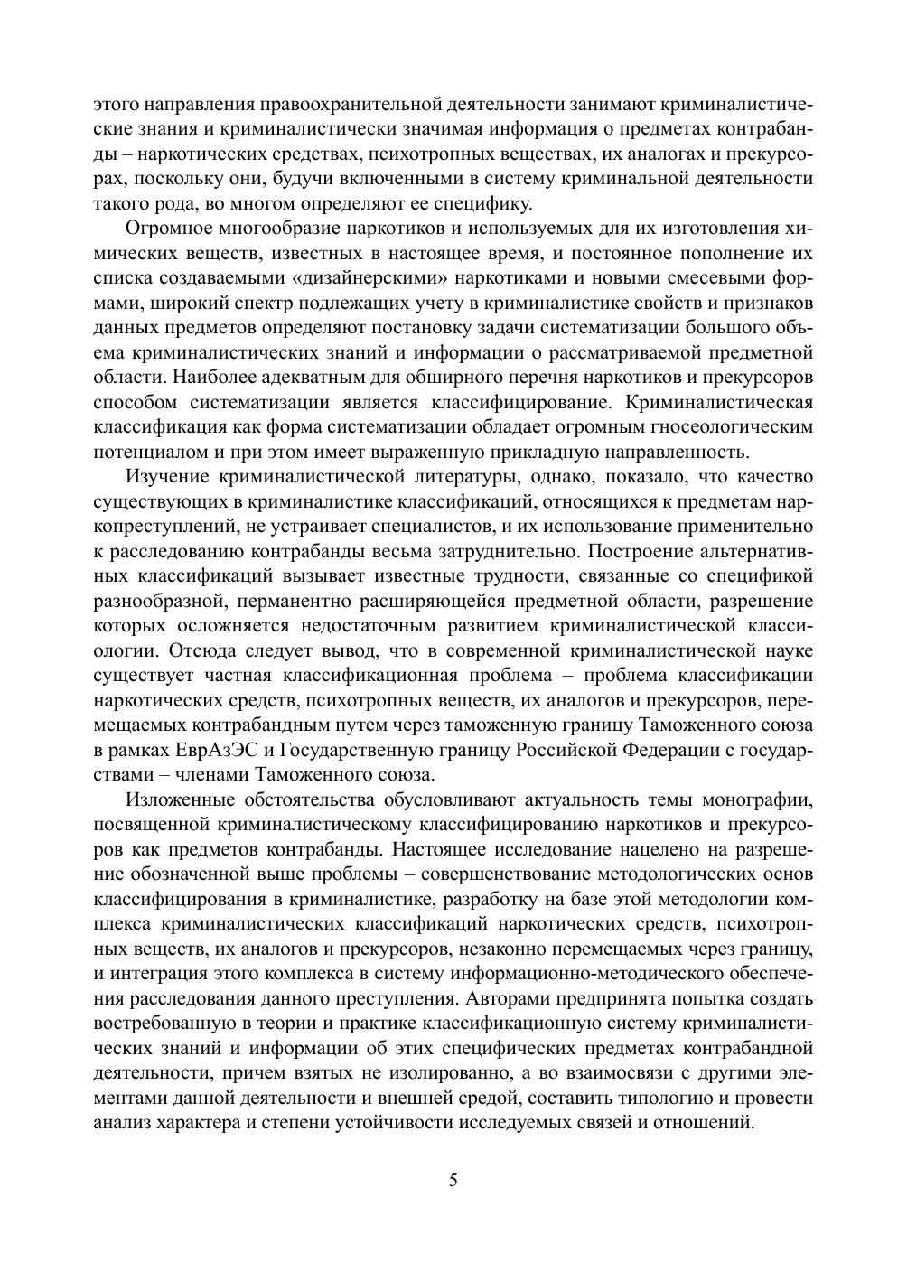 Монография посвящена криминалистическим классификациям наркотических средств, психотропных веществ, их аналогов и прекурсоров как предметов контрабанды. Авторами рассмотрены теоретические аспекты разработки и использования указанных объектов в расследовании. С учетом методологических положений системного и деятельностного подходов в работе произведена классификация наркотических средств, их аналогов и прекурсоров как главного элемента контрабандной деятельности по пяти основаниям (23 классификации) и показано их значение в расследовании преступлений. Предназначена для сотрудников правоохранительных органов, в первую очередь органов дознания и предварительного следствия, а также научных сотрудников, преподавателей, аспирантов и студентов, обучающихся по специальностям «Юриспруденция» и «Таможенное дело».