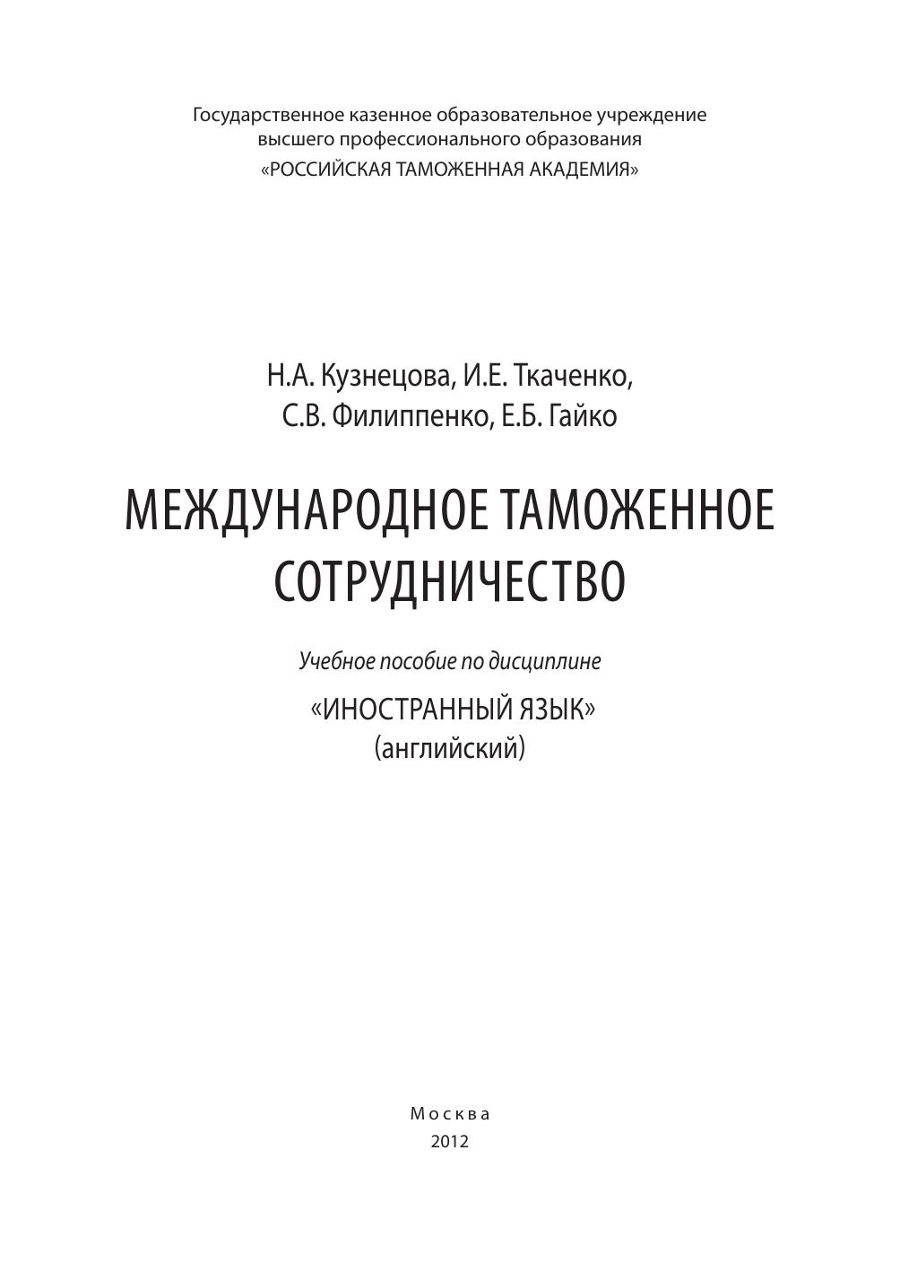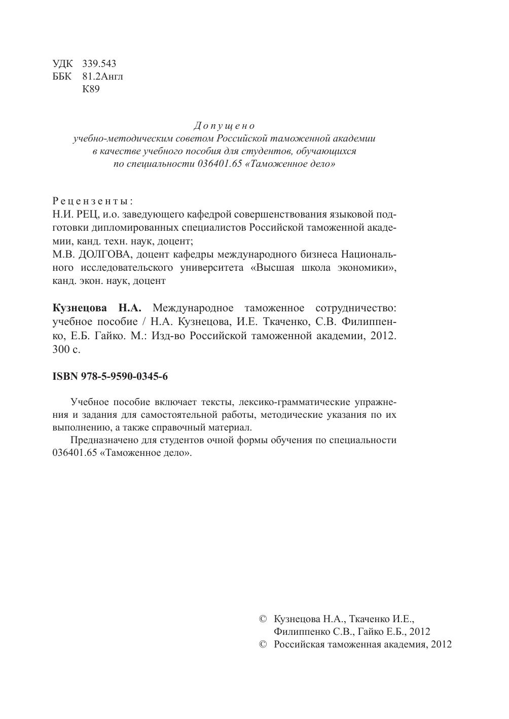 Гриф: Допущено учебно-методическим советом Российской таможенной академии в качестве учебного пособия для студентов, обучающихся по специальности 036401.65 «Таможенное дело»