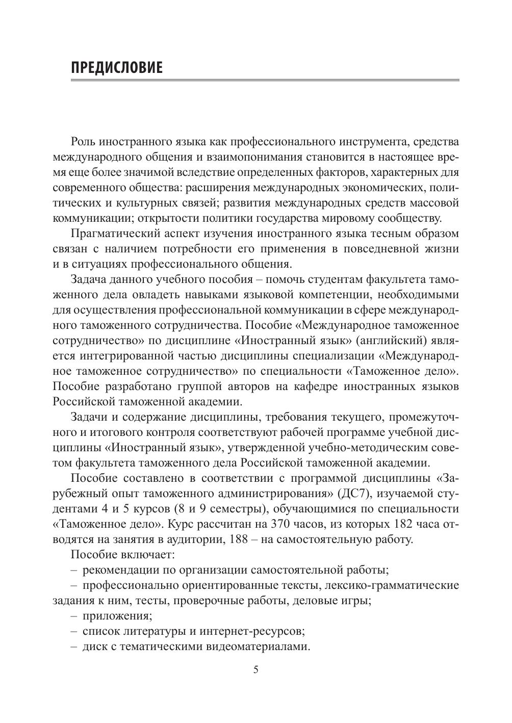 Учебное пособие включает тексты, лексико-грамматические упражнения и задания для самостоятельной работы, методические указания по их выполнению, а также справочный материал. Предназначено для студентов очной формы обучения по специальности 036401.65 «Таможенное дело».
