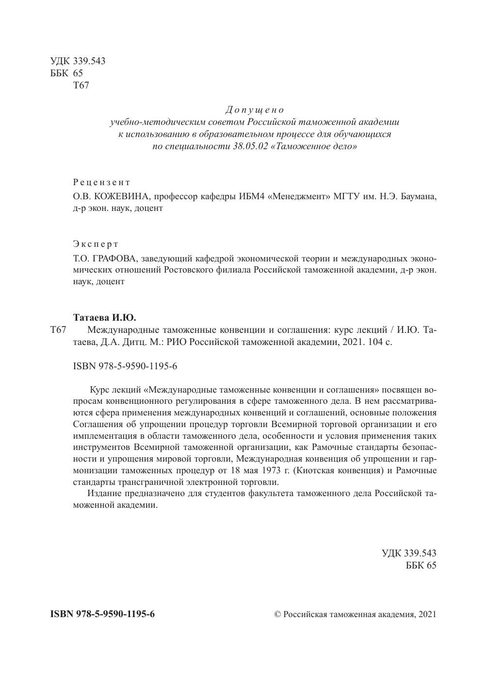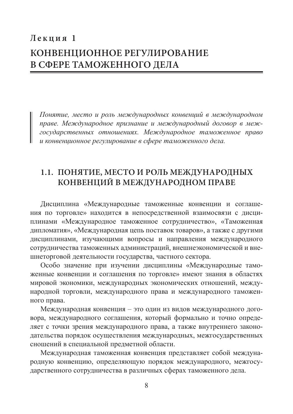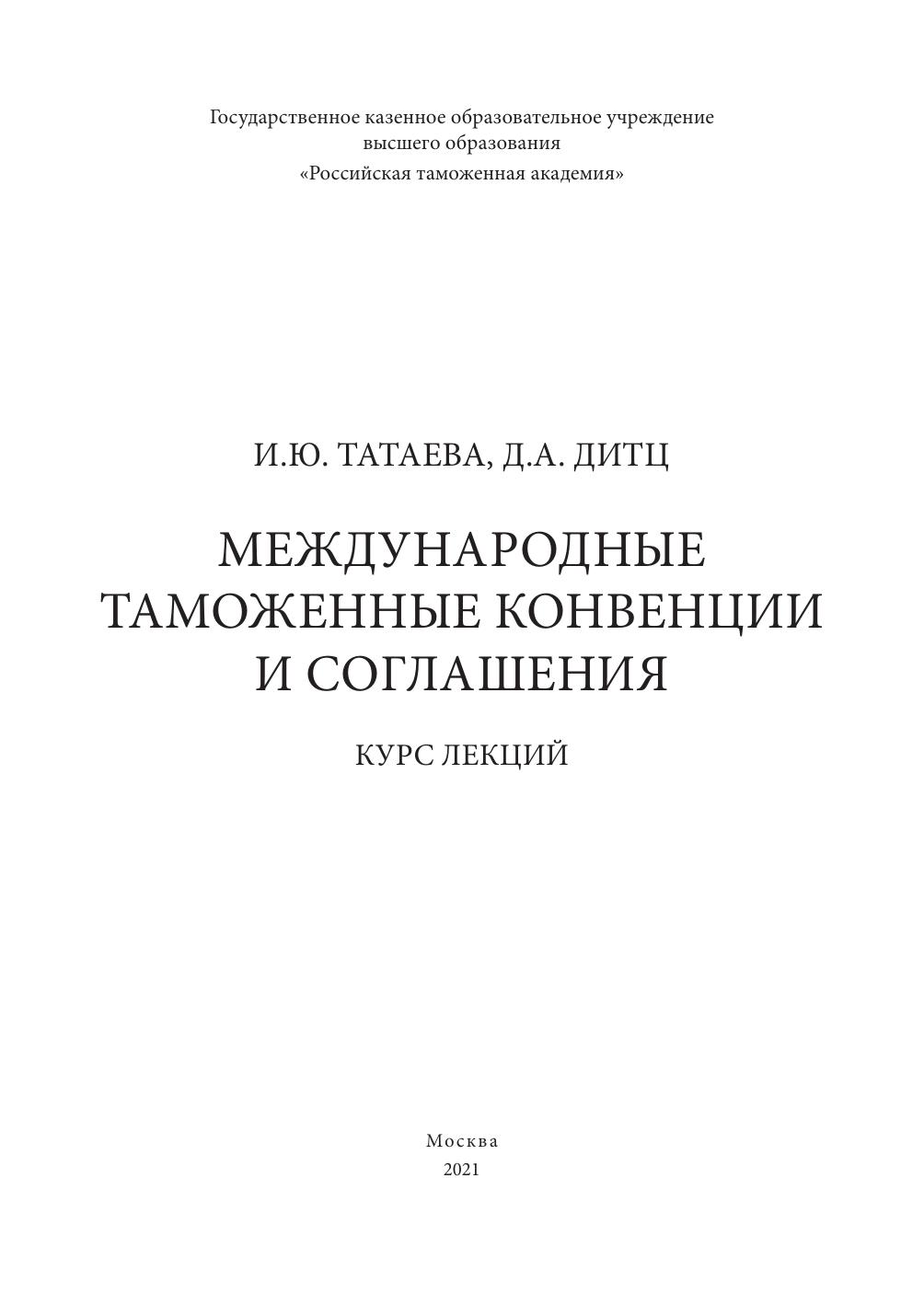 Курс лекций «Международные таможенные конвенции и соглашения» посвящен вопросам конвенционного регулирования в сфере таможенного дела. В нем рассматриваются сфера применения международных конвенций и соглашений, основные положения Соглашения об упрощении процедур торговли Всемирной торговой организации и его имплементация в области таможенного дела, особенности и условия применения таких инструментов Всемирной таможенной организации, как Рамочные стандарты безопасности и упрощения мировой торговли, Международная конвенция об упрощении и гармонизации таможенных процедур от 18 мая 1973 г. (Киотская конвенция) и Рамочные стандарты трансграничной электронной торговли.