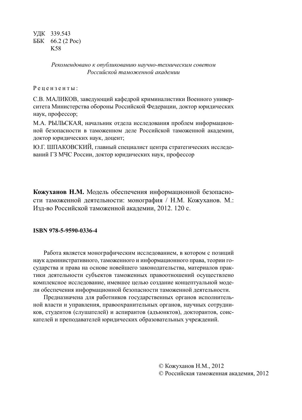 Работа является монографическим исследованием, в котором с позиций наук административного, таможенного и информационного права, теории государства и права на основе новейшего законодательства, материалов практики деятельности субъектов таможенных правоотношений осуществлено комплексное исследование, имевшее целью создание концептуальной модели обеспечения информационной безопасности таможенной деятельности. Предназначена для работников государственных органов исполнительной власти и управления, правоохранительных органов, научных сотрудников, студентов (слушателей) и аспирантов (адъюнктов), докторантов, соискателей и преподавателей юридических образовательных учреждений.