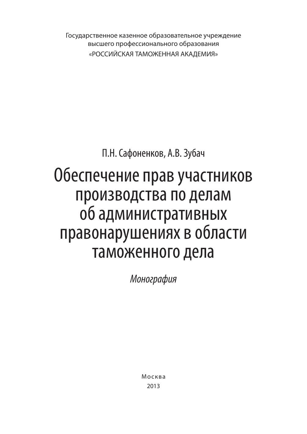В монографии раскрыты теоретические и нормативно-правовые положения обеспечения прав участников производства по делам об административных правонарушениях в деятельности таможенной администрации, определены проблемные аспекты