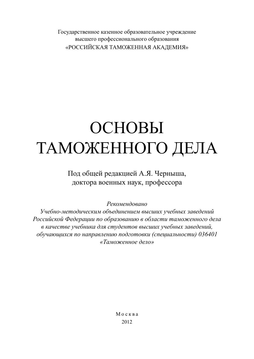 Гриф: Рекомендовано Учебно-методическим объединением высших учебных заведений Российской Федерации по образованию в области таможенного дела в качестве учебника для студентов высших учебных заведений, обучающихся по направлению подготовки (специальности) 036401 «Таможенное дело»