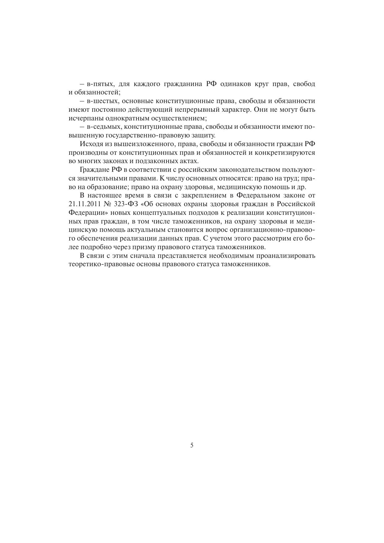 Учебное пособие посвящено теории и практике реализации конституционных прав сотрудников, гражданских служащих и работников таможенных органов (таможенников) на охрану здоровья и медицинскую помощь. В нем рассматриваются понятийный аппарат правового статуса таможенников, правовые основы и порядок их медицинского обеспечения. Предназначено для студентов, обучающихся по специальности и направлению подготовки «Юриспруденция». Может быть использовано в процессе повышения квалификации должностных лиц и медицинских работников таможенных органов и учреждений.