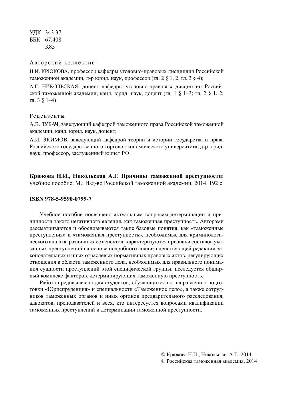 Учебное пособие посвящено актуальным вопросам детерминации и причинности такого негативного явления, как таможенная преступность. Авторами рассматриваются и обосновываются такие базовые понятия, как «таможенные преступления» и «таможенная преступность», необходимые для криминологического анализа различных ее аспектов; характеризуются признаки составов указанных преступлений на основе подробного анализа действующей редакции законодательных и иных отраслевых нормативных правовых актов, регулирующих отношения в области таможенного дела, необходимых для правильного понимания сущности преступлений этой специфической группы; исследуется обширный комплекс факторов, детерминирующих таможенную преступность. Работа предназначена для студентов, обучающихся по направлению подготовки «Юриспруденция» и специальности «Таможенное дело», а также сотрудников таможенных органов и иных органов предварительного расследования, адвокатов, преподавателей и всех, кто интересуется вопросами квалификации таможенных преступлений и детерминации таможенной преступности.