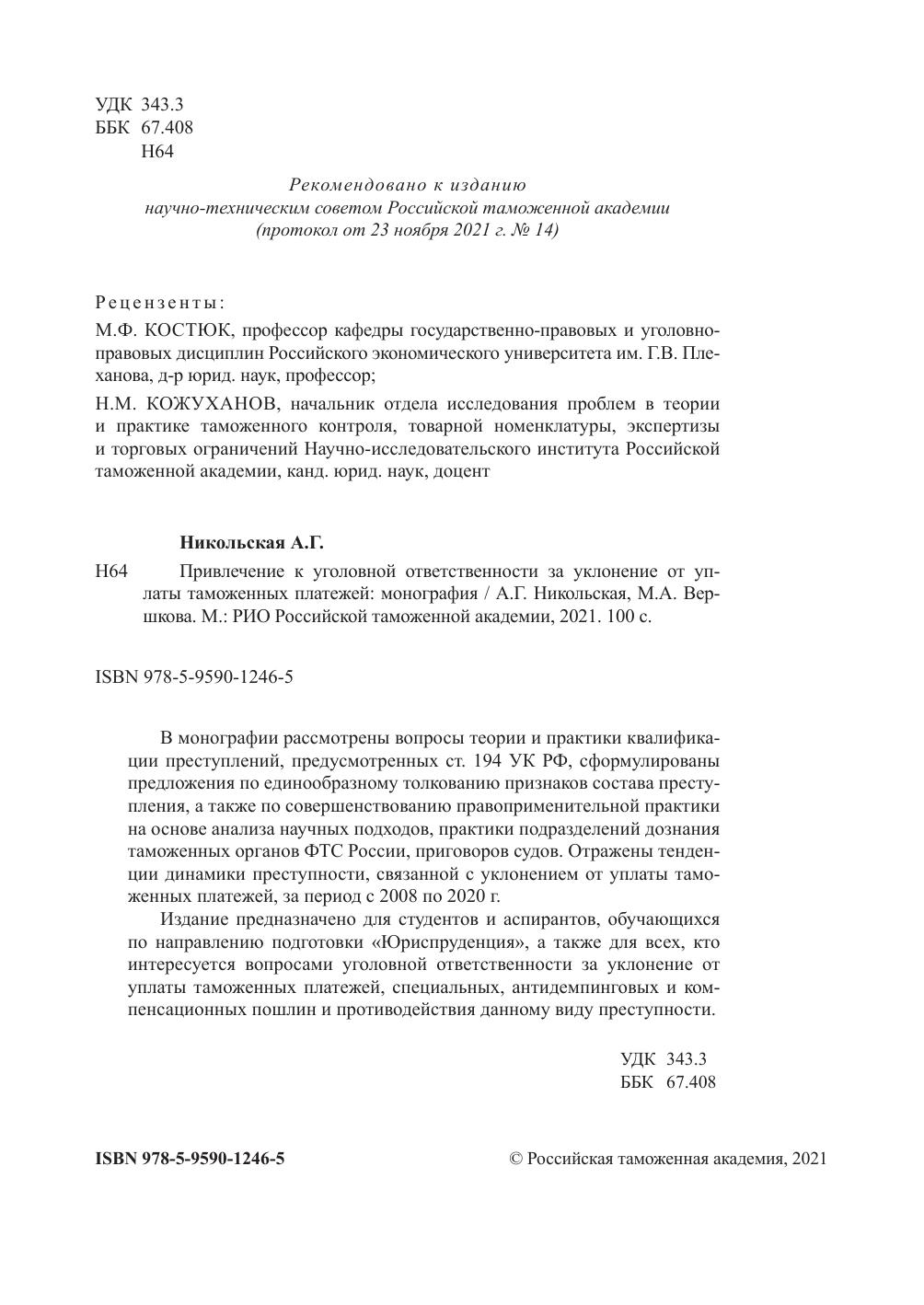 Издание предназначено для студентов и аспирантов, обучающихся по направлению подготовки «Юриспруденция», а также для всех, кто интересуется вопросами уголовной ответственности за уклонение от уплаты таможенных платежей, специальных, антидемпинговых и компенсационных пошлин и противодействия данному виду преступности.