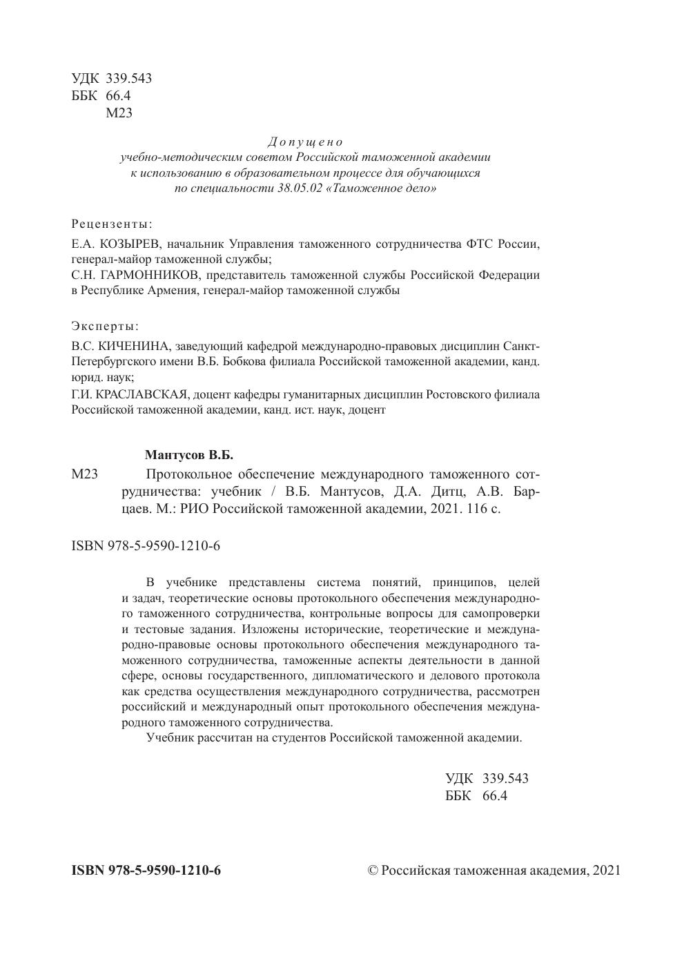 В учебнике представлены система понятий, принципов, целей и задач, теоретические основы протокольного обеспечения международного таможенного сотрудничества, контрольные вопросы для самопроверки и тестовые задания. Изложены исторические, теоретические и международно-правовые основы протокольного обеспечения международного таможенного сотрудничества, таможенные аспекты деятельности в данной сфере, основы государственного, дипломатического и делового протокола как средства осуществления международного сотрудничества, рассмотрен российский и международный опыт протокольного обеспечения международного таможенного сотрудничества.