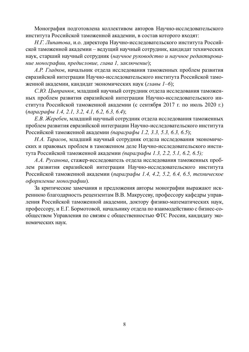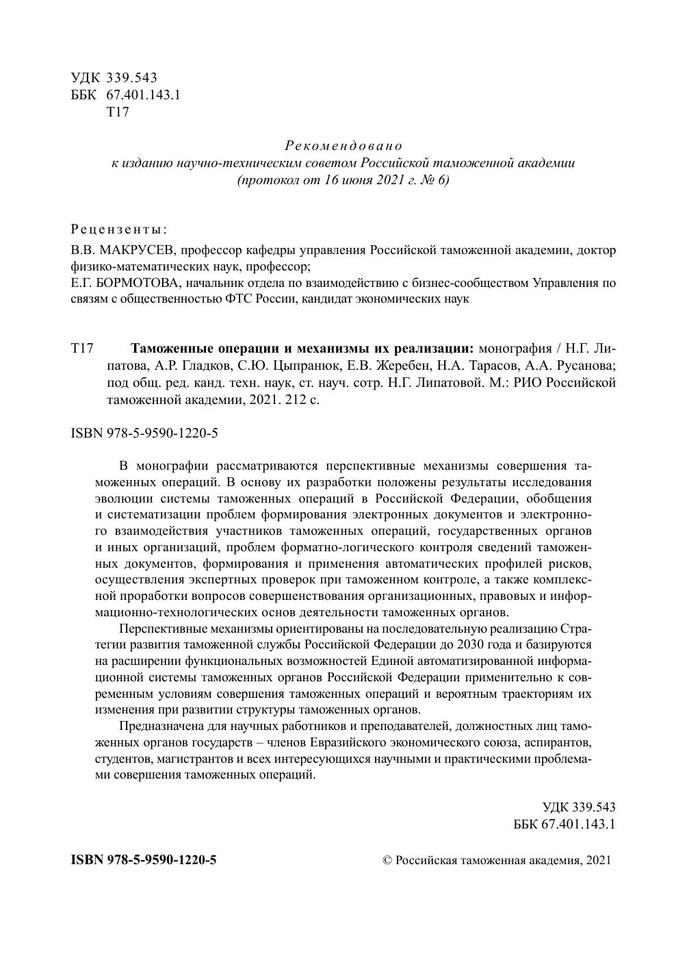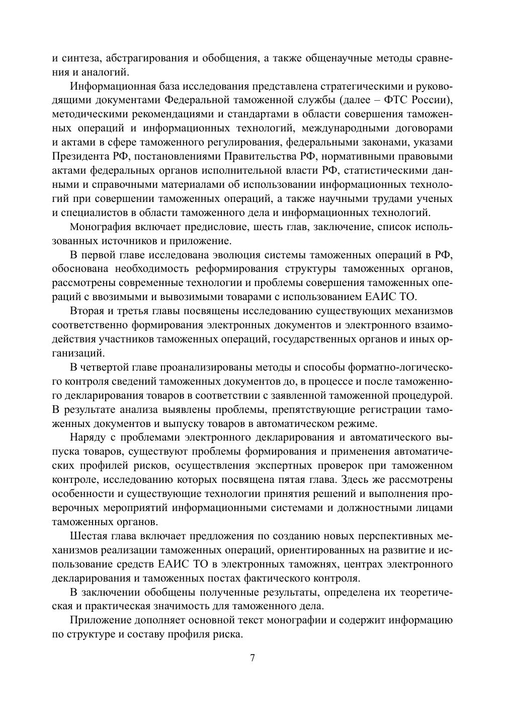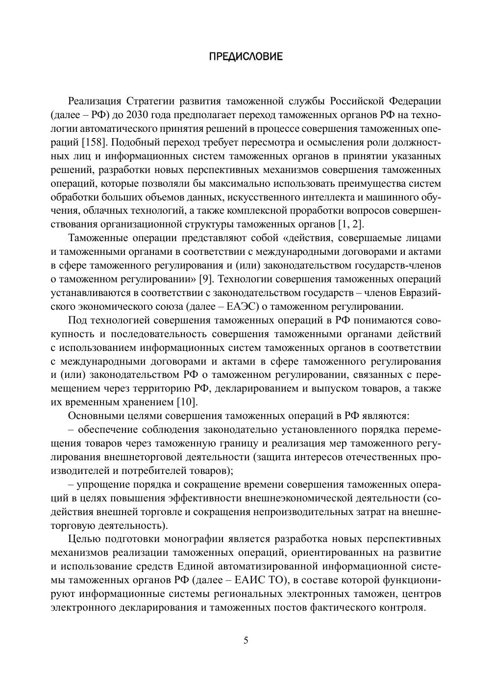 В монографии рассматриваются перспективные механизмы совершения таможенных операций. В основу их разработки положены результаты исследованияэволюции системы таможенных операций в Российской Федерации, обобщения и систематизации проблем формирования электронных документов и электронного взаимодействия участников таможенных операций, государственных органов и иных организаций, проблем форматно-логического контроля сведений таможенных документов, формирования и применения автоматических профилей рисков, осуществления экспертных проверок при таможенном контроле, а также комплексной проработки вопросов совершенствования организационных, правовых и информационно-технологических основ деятельности таможенных органов. Перспективные механизмы ориентированы на последовательную реализацию Стратегии развития таможенной службы Российской Федерации до 2030 года и базируются на расширении функциональных возможностей Единой автоматизированной информационной системы таможенных органов Российской Федерации применительно к современным условиям совершения таможенных операций и вероятным траекториям их изменения при развитии структуры таможенных органов.